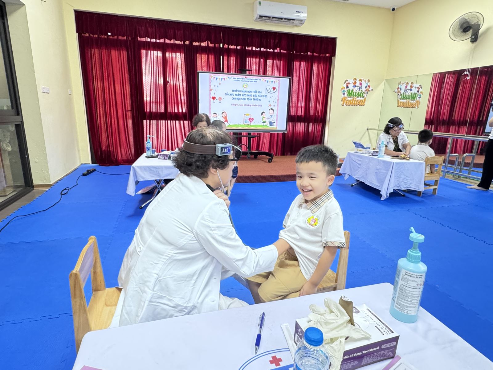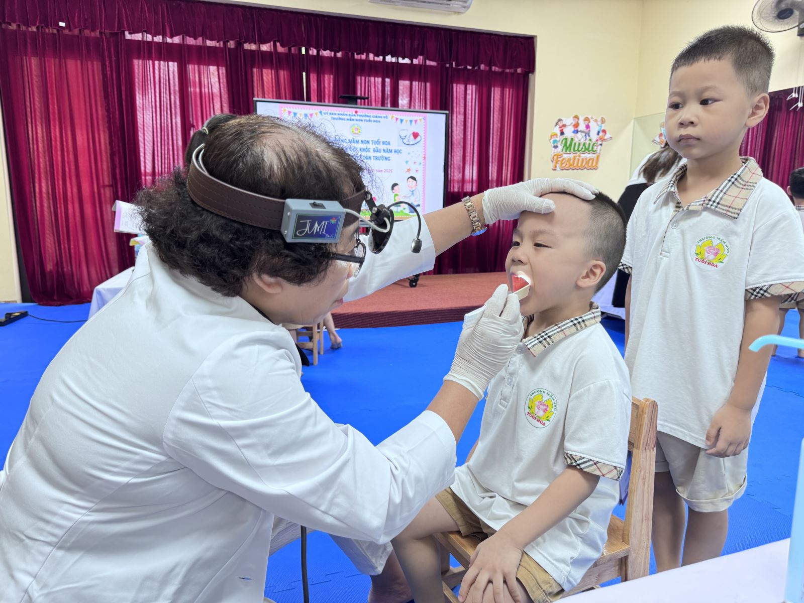 Khám sức khoẻ đầu năm học cho trẻ là một hoạt động thường niên mà trường mầm non Tuổi Hoa tổ chức không chỉ giúp các bậc cha mẹ học sinh yên tâm về sức khoẻ của con mà còn nhằm phát hiện sớm những bệnh học đường cho trẻ như: cận thị, cong vẹo cột sống…. Trong không khí thân thiện, vui vẻ và gần gũi, các bác sĩ cùng các cô giáo đã xoá tan sự sợ hãi của trẻ khi được các bác sĩ thăm khám. Buổi khám trở thành một trải nghiệm thú vị, bổ ích đối với trẻ, giúp trẻ tự tin với một cơ thể khoẻ mạnh, sẵn sàng khám phá một năm học mới với những điều hấp dẫn đang chờ ở phía trước.