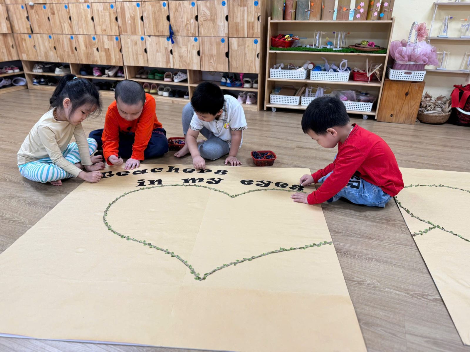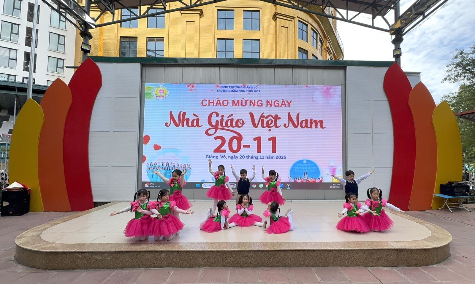 Các bé đã vẽ những bức tranh tuyệt đẹp về cô giáo của mình. Không những thế, các bạn nhỏ còn cắt, dán và trang trí để tạo nên một tác phẩm khổng lồ, độc đáo được trưng bày ngay tại lớp, tạo nên không gian đầy ấm áp và ý nghĩa chứa đựng tình cảm ngây thơ nhưng vô cùng chân thành mà các bạn nhỏ muốn gửi tặng cô giáo của mình. Và còn hấp dẫn hơn khi các bạn nhỏ được tham dự lễ chào mừng ngày Nhà giáo Việt Nam dưới sân trường. Không chỉ tham dự, các bạn nhỏ cùng các bạn trong khối còn mang đến một tiết mục vô cùng sôi động.