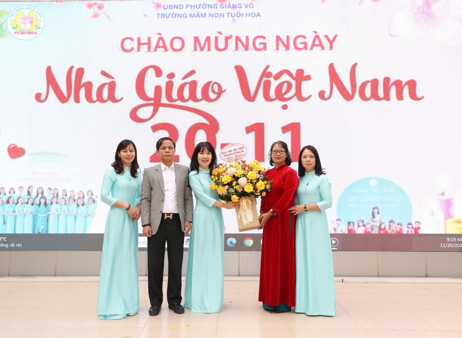 Đại biểu phường Giảng Võ trao tặng lẵng hoa tươi thắm cho Ban giám hiệu nhà trường
