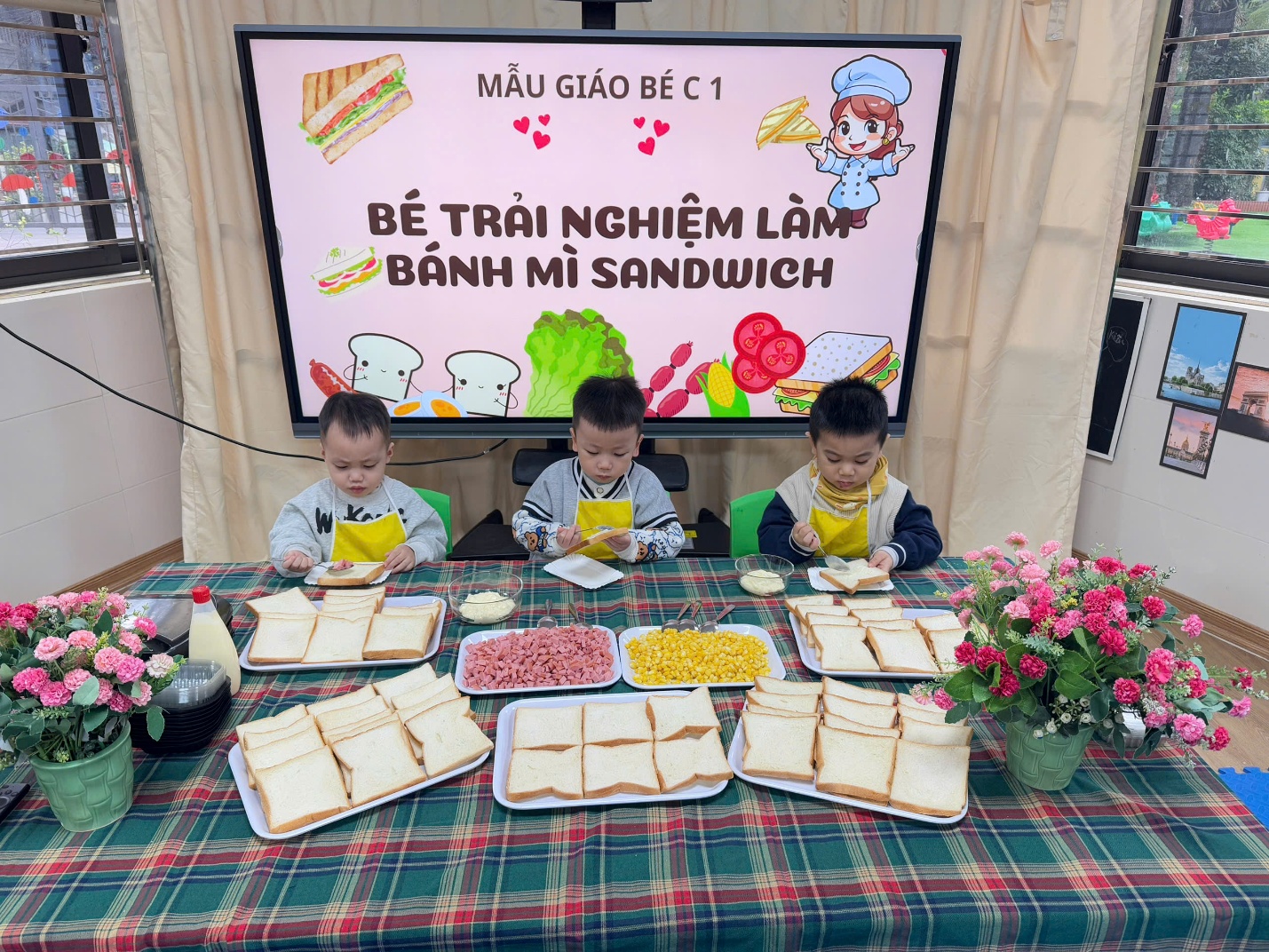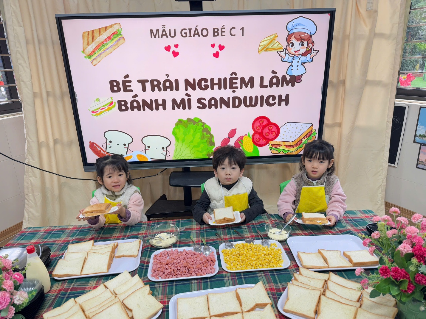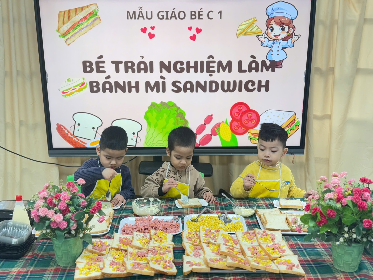 Thật tuyệt vời khi các bé lớp C1 đã có một buổi trải nghiệm thật vui với hoạt động “Bé làm bánh mì sandwich”. Dưới sự hướng dẫn của cô giáo, trẻ được làm quen với bánh mì, các loại topping hấp dẫn, tự tay phết kem sốt, trang trí chiếc bánh theo ý thích của mình. Hoạt động giúp trẻ rèn luyện sự khéo léo, phát triển óc sáng tạo, đồng thời mang đến niềm vui khi được tự làm và thưởng thức sản phẩm do chính mình tạo ra. Những khoảnh khắc hào hứng, tiếng cười rộn ràng đã tạo nên một trải nghiệm học tập nhẹ nhàng và đầy ý nghĩa cho các bé 🍨✨. Sau đây là một vài hình ảnh trong hoạt động trải nghiệm của các con: