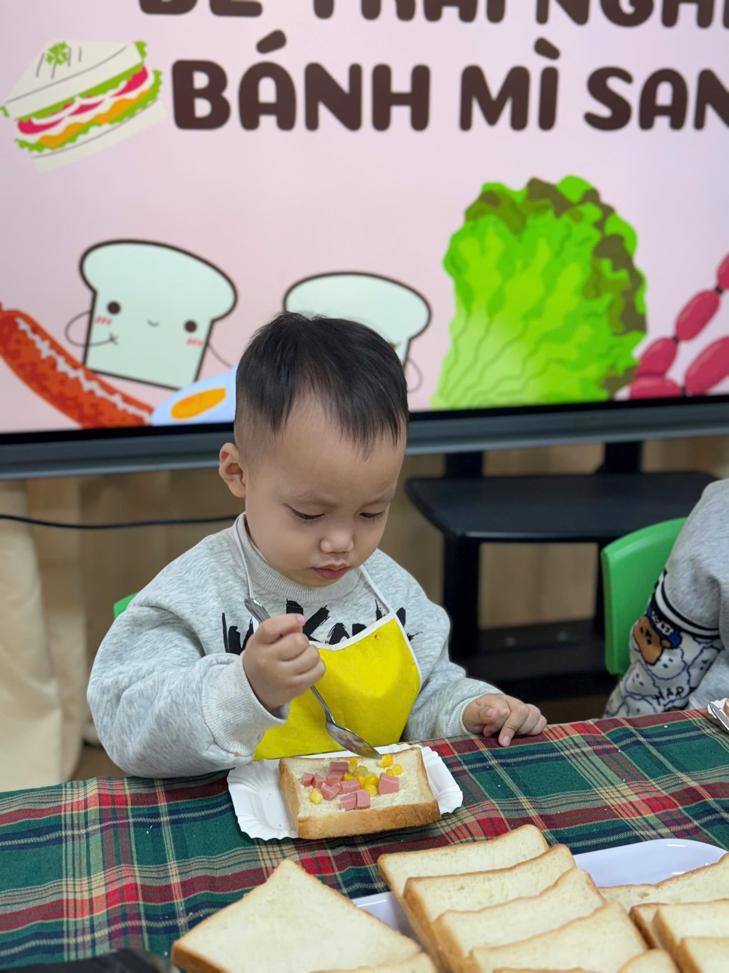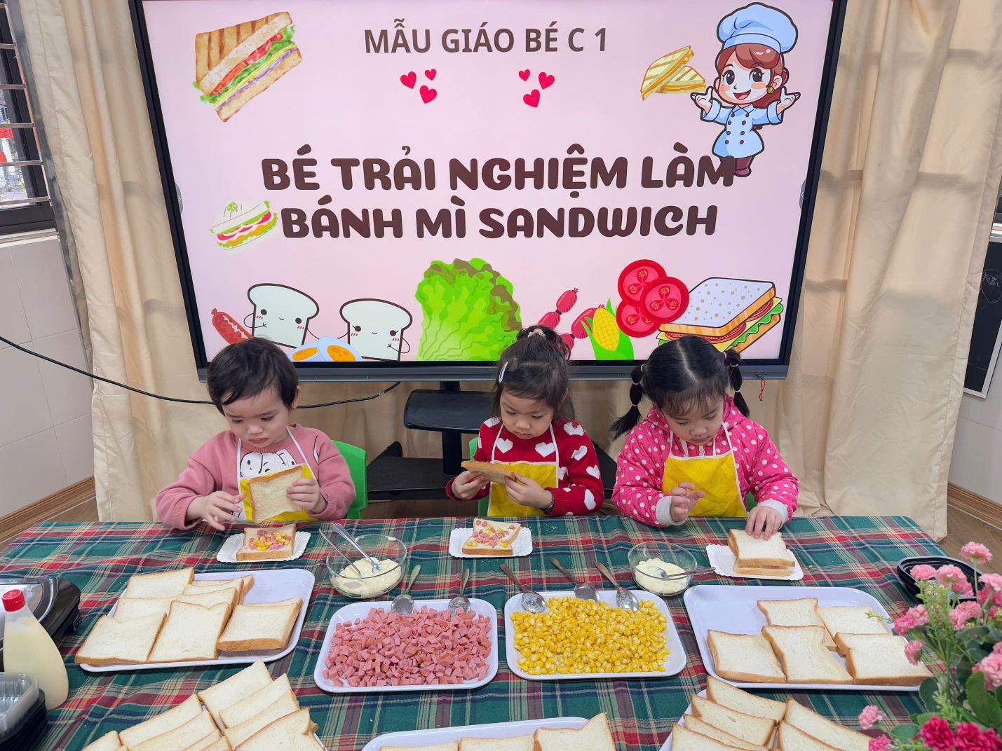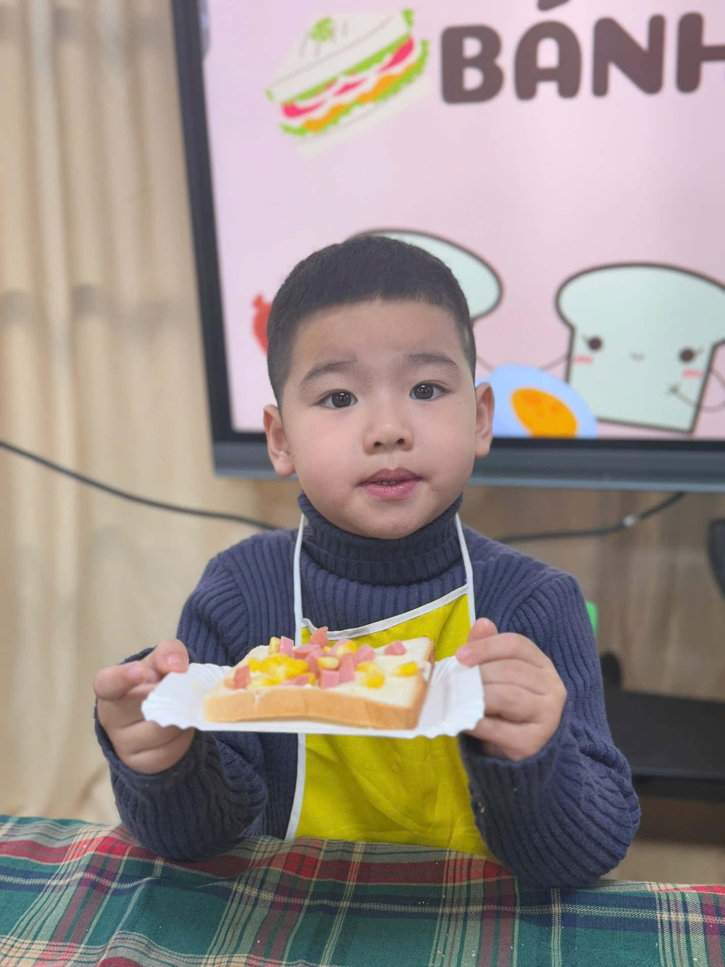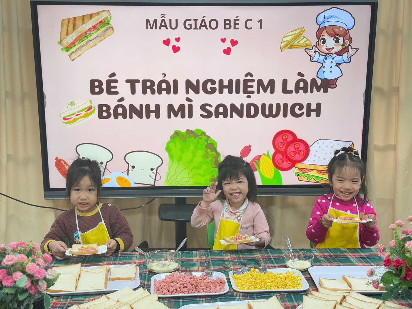 Thật tuyệt vời khi các bé lớp C1 đã có một buổi trải nghiệm thật vui với hoạt động “Bé làm bánh mì sandwich”. Dưới sự hướng dẫn của cô giáo, trẻ được làm quen với bánh mì, các loại topping hấp dẫn, tự tay phết kem sốt, trang trí chiếc bánh theo ý thích của mình. Hoạt động giúp trẻ rèn luyện sự khéo léo, phát triển óc sáng tạo, đồng thời mang đến niềm vui khi được tự làm và thưởng thức sản phẩm do chính mình tạo ra. Những khoảnh khắc hào hứng, tiếng cười rộn ràng đã tạo nên một trải nghiệm học tập nhẹ nhàng và đầy ý nghĩa cho các bé 🍨✨. Sau đây là một vài hình ảnh trong hoạt động trải nghiệm của các con: