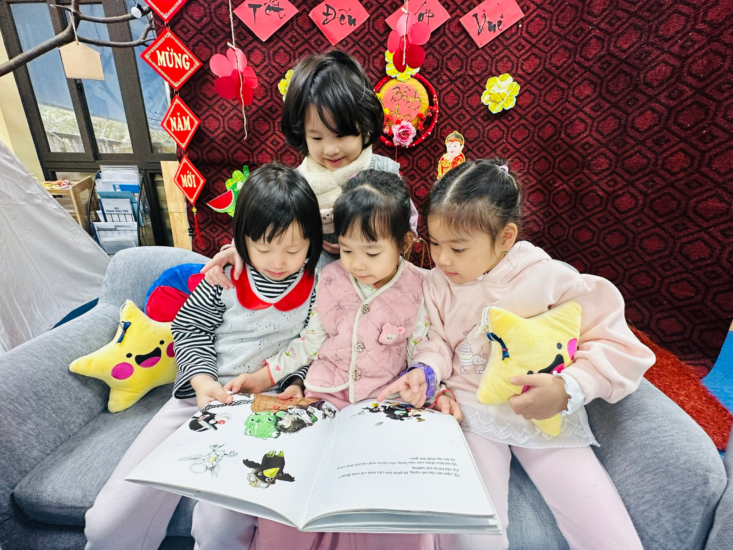 Các bé ngôi thư giãn đọc chuyện trên chiếc ghế sopha