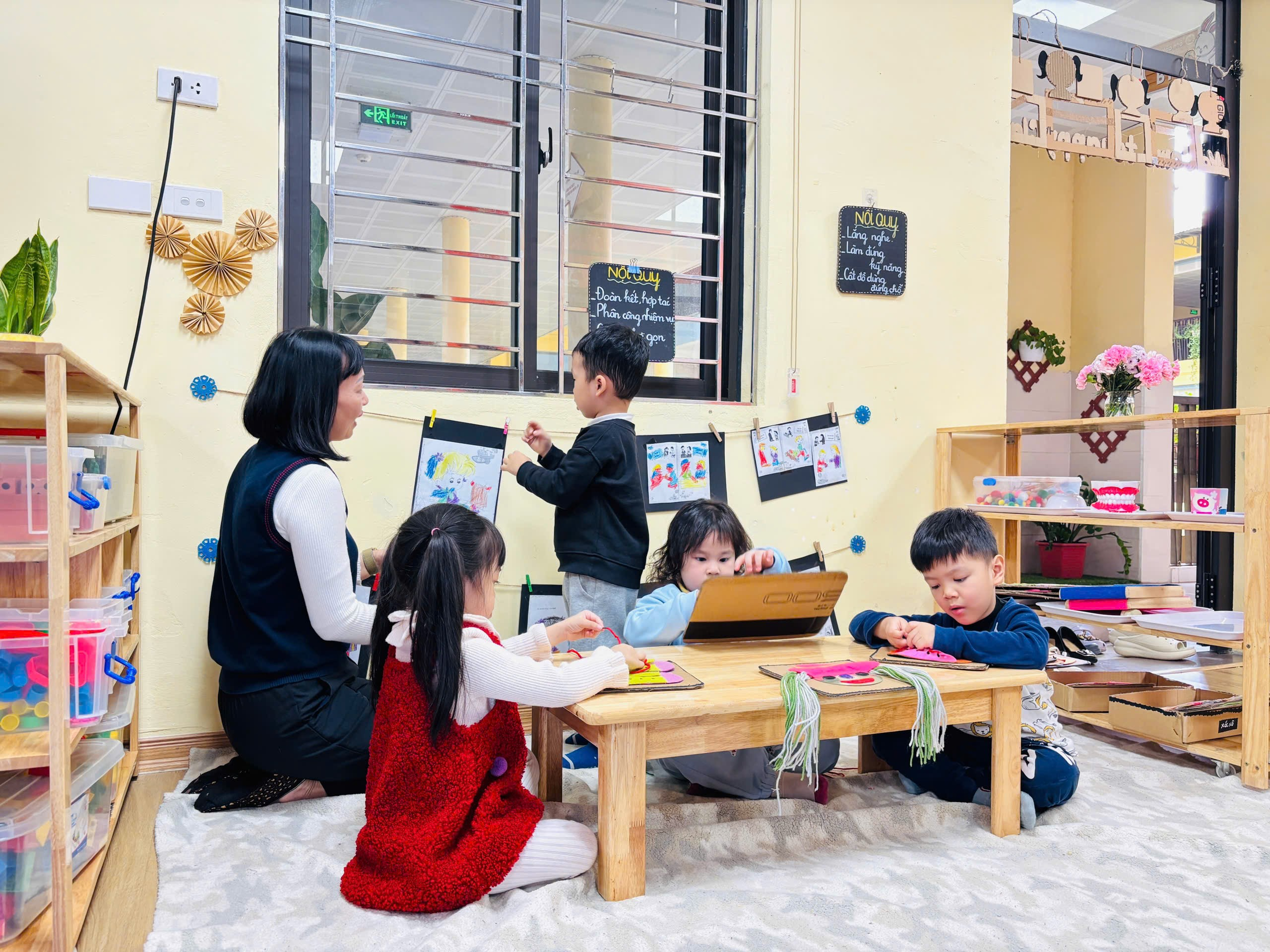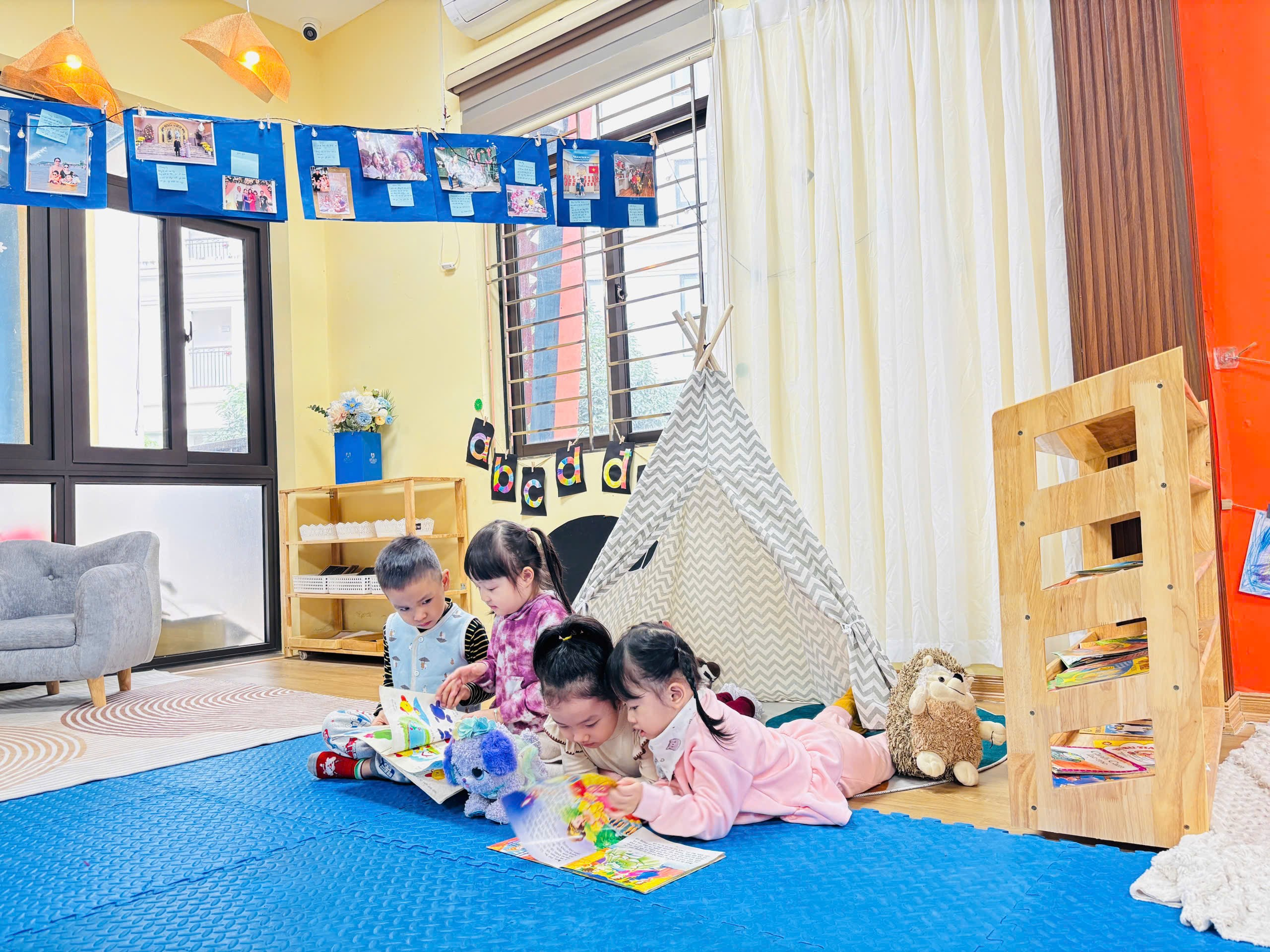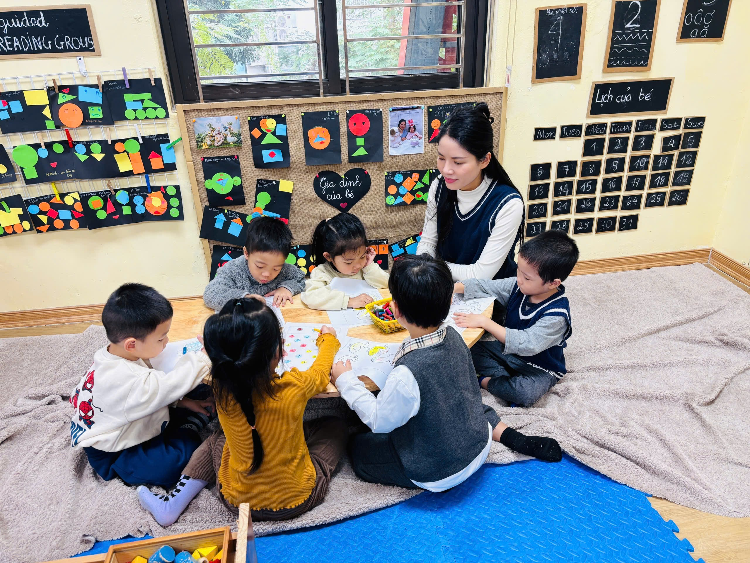Điểm nổi bật của lớp B1 chính là sự thay đổi môi trường học tập: không gian lớp học được sắp xếp linh hoạt, gần gũi, tạo điều kiện để các con tham gia hoạt động một cách tự nhiên và hứng thú. Thay vì chỉ tiếp nhận kiến thức một chiều, các con được khuyến khích đặt câu hỏi, tìm tòi và tự mình trải nghiệm.