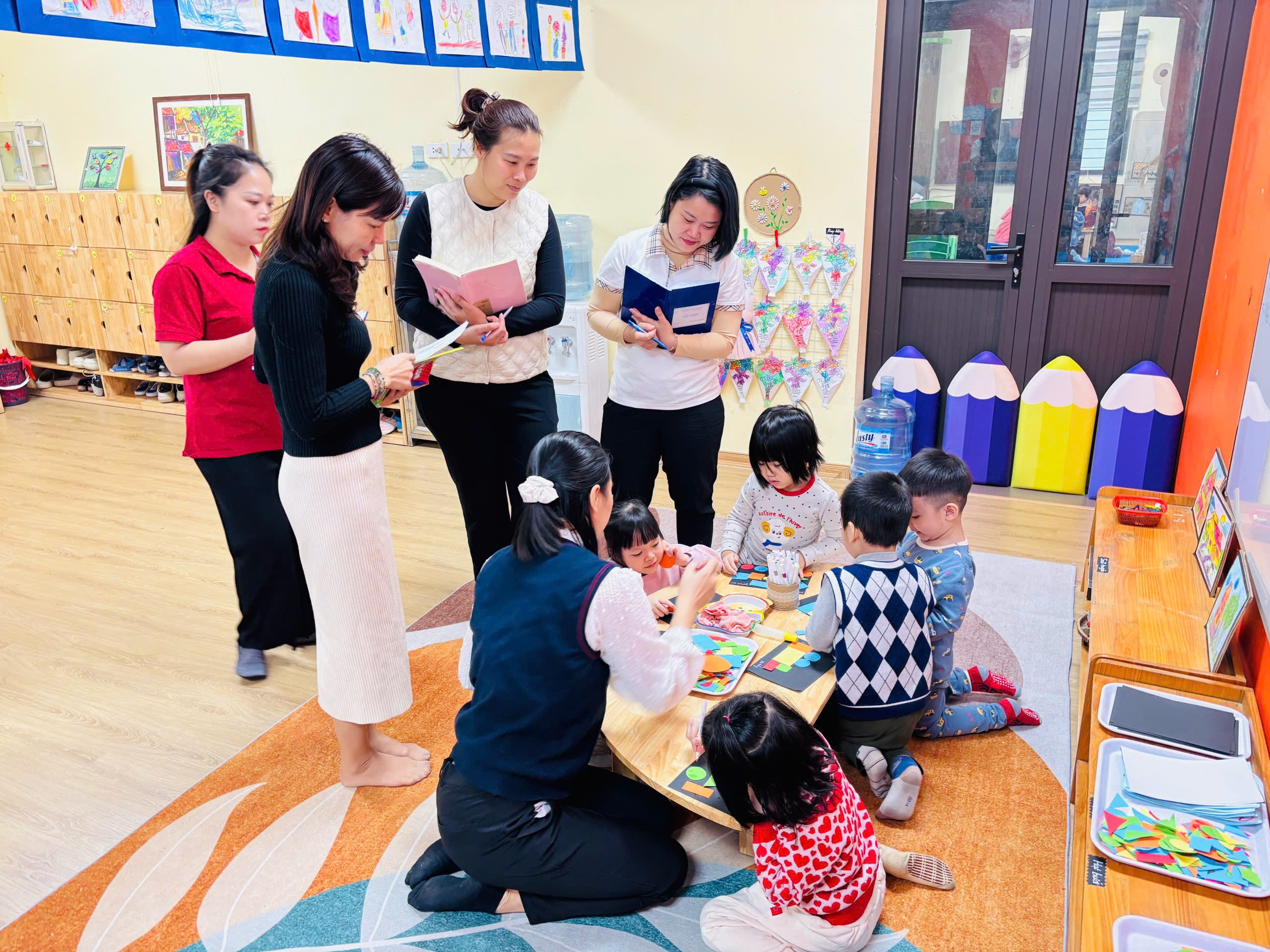 Hình ảnh BGK đang quan sát cô hướng dẫn các con tạo hình ngôi nhà từ những hình cơ bản nhà trong góc chủ đề Hình ảnh cô giáo đang hướng dẫn con học sinh kẹp sản lên dây treo