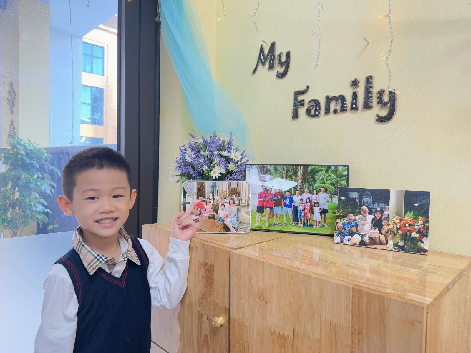 Con hào hứng khi giới thiệu về bức ảnh gia đình mình