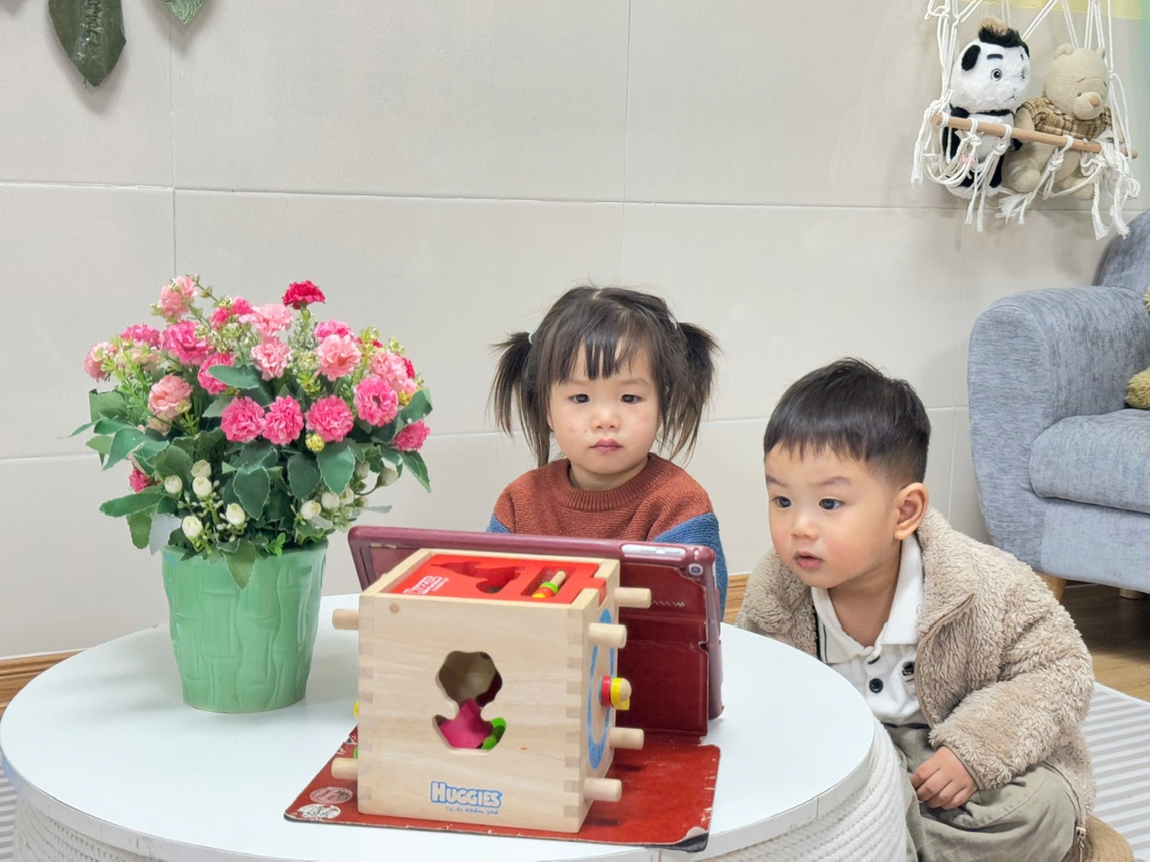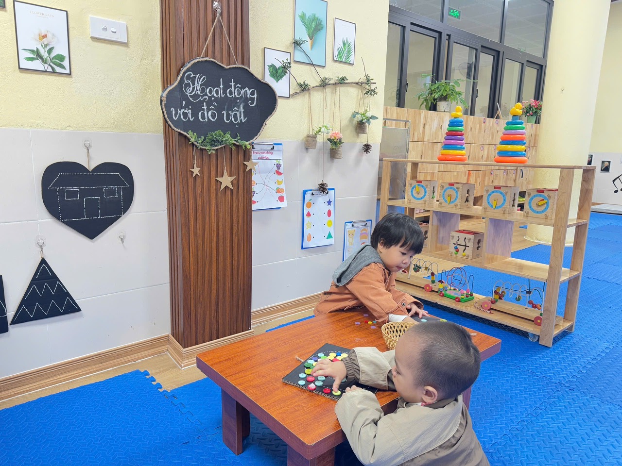 Trẻ thích thú khi được chơi ở góc hoạt động với đồ vật cùng những chiếc cúc nhiều màu sắc .