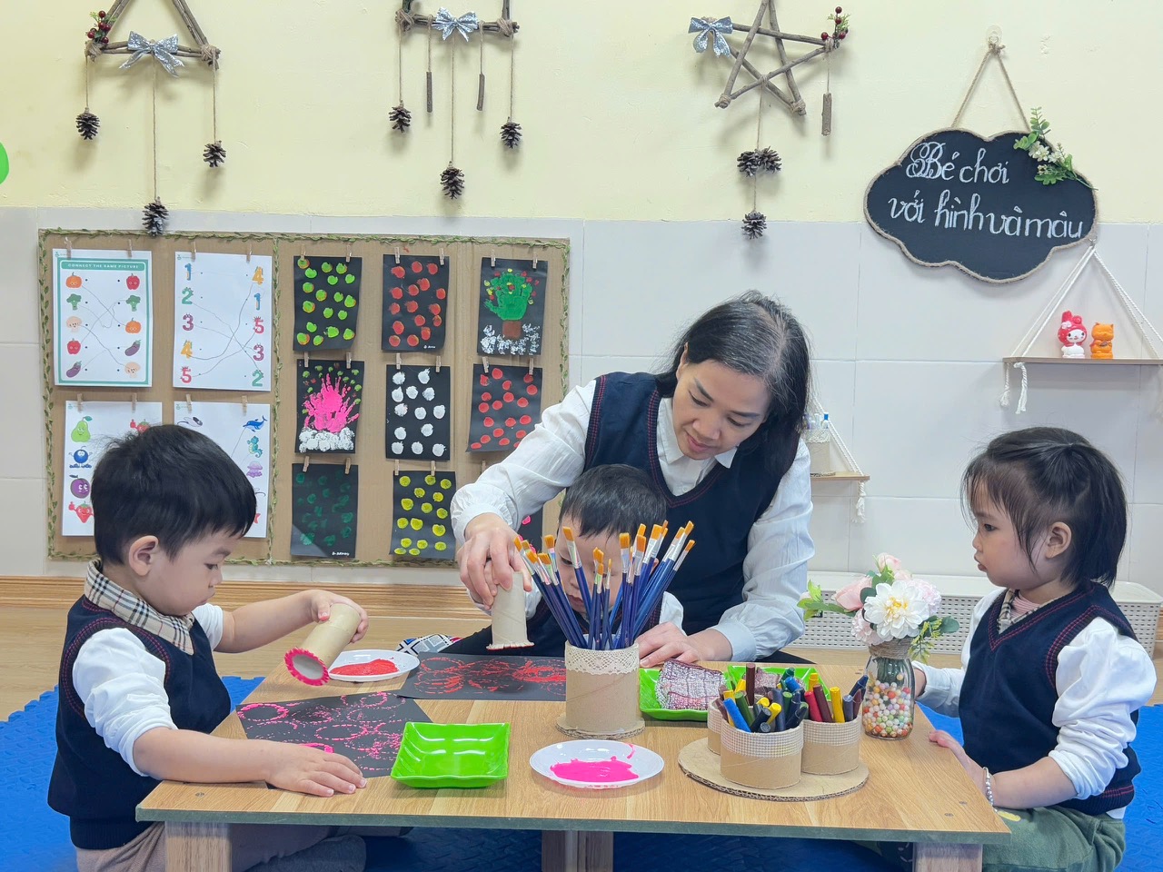 Các con thích thú khi được chơi với màu nước .