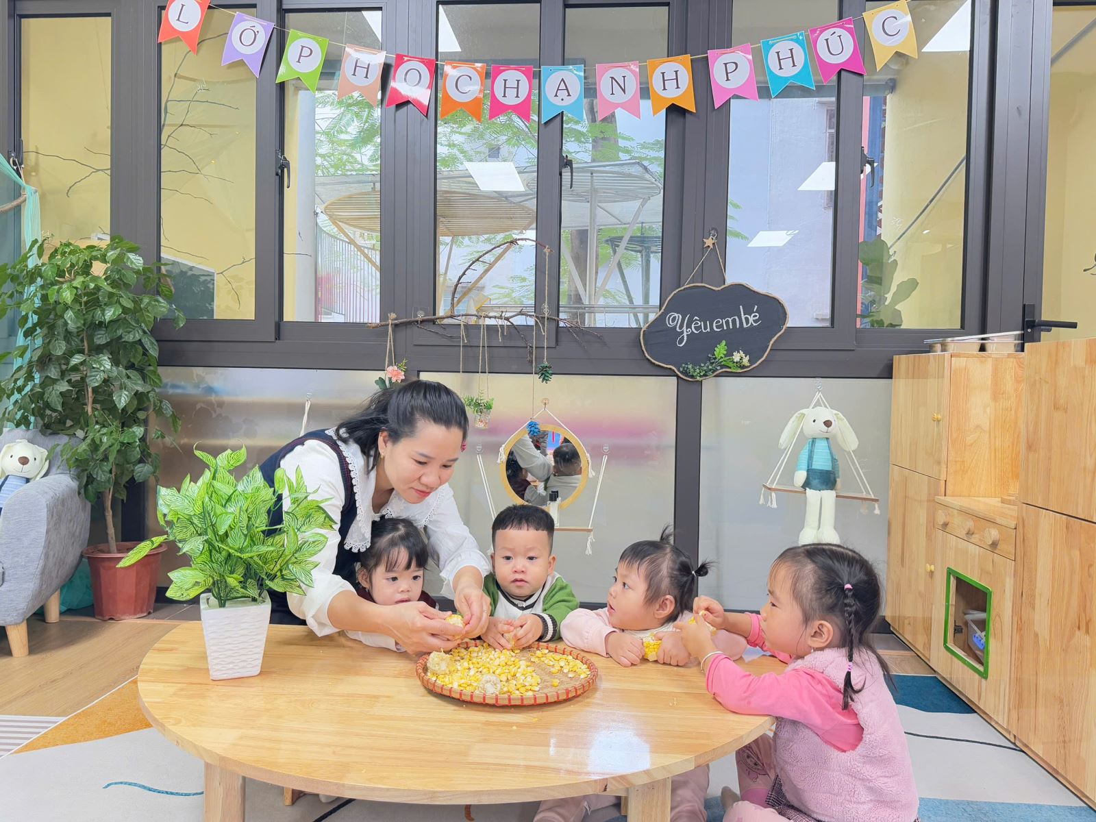Cô giáo hướng dẫn các con tách hạt ngô .