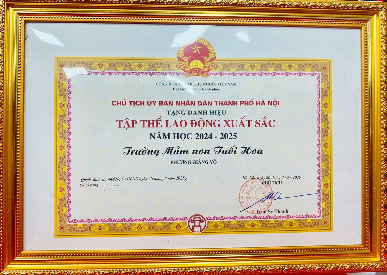 Hình ảnh danh hiệu “ Tập thể lao động xuất sắc” của trường MN Tuổi Hoa.