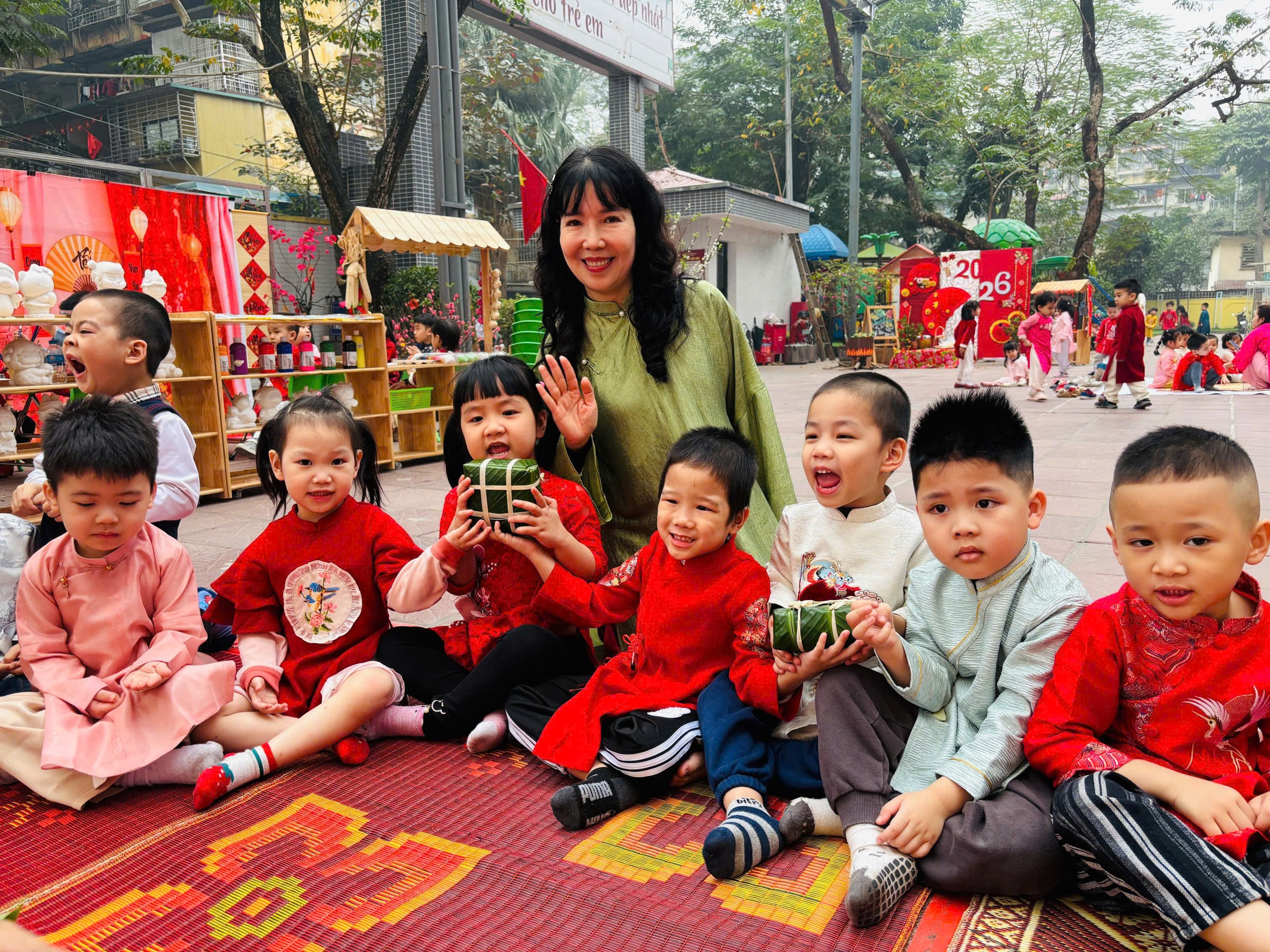 Hình ảnh các con học sinh check in gói bánh chưng cùng nhà giáo Phạm Thanh Hoa hiệu trưởng nhà trường mầm non Tuổi Hoa