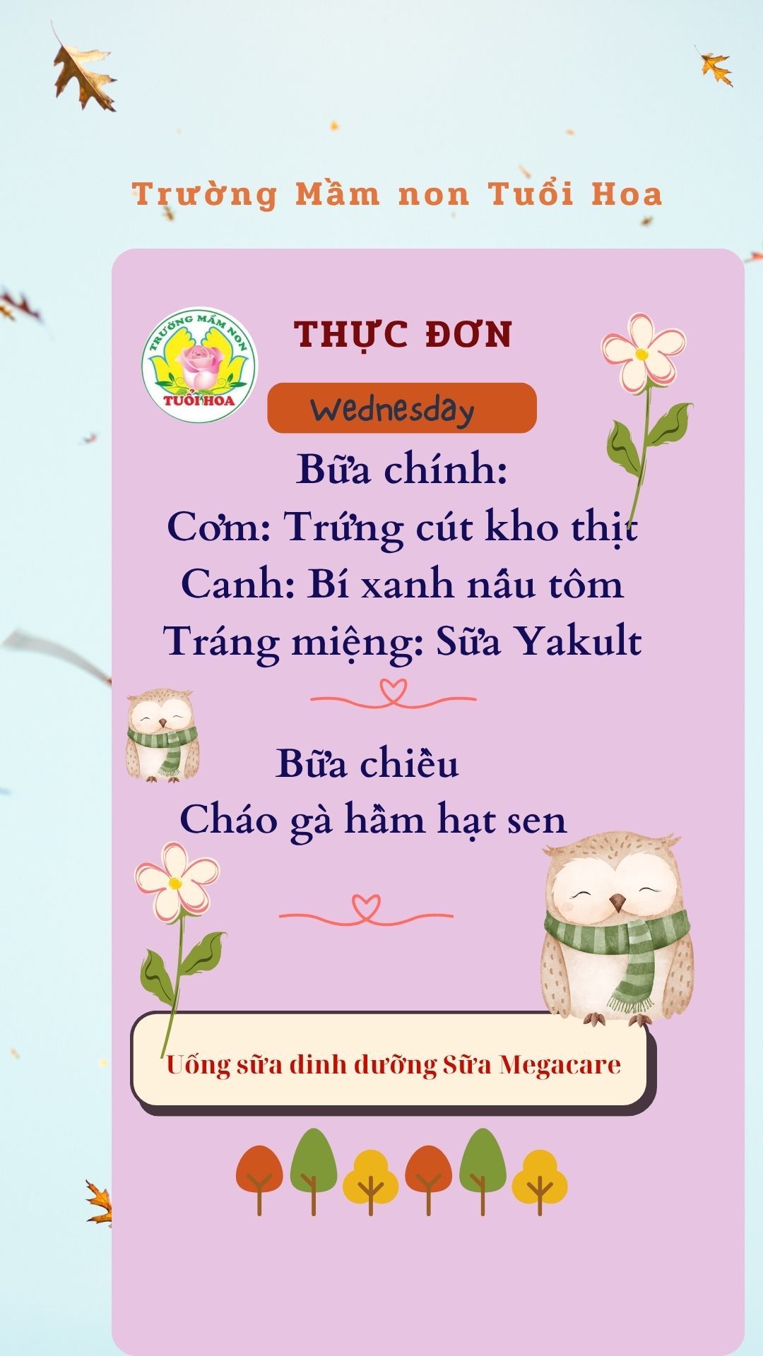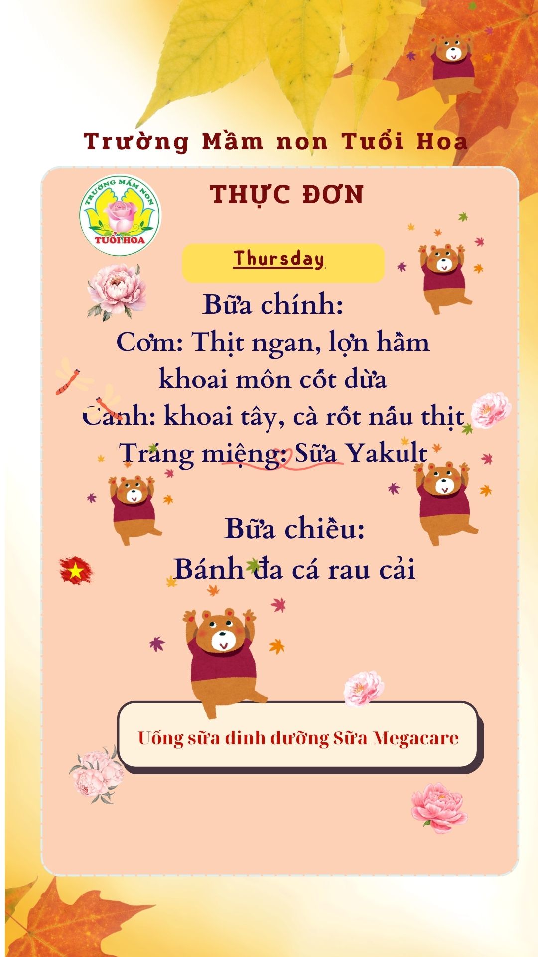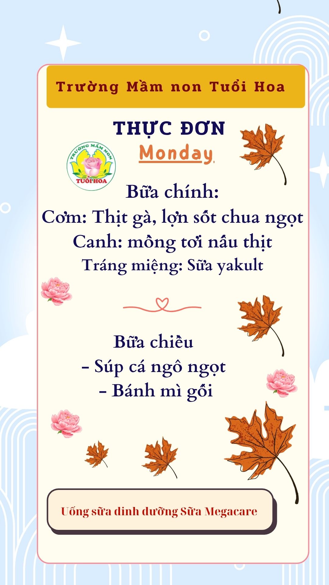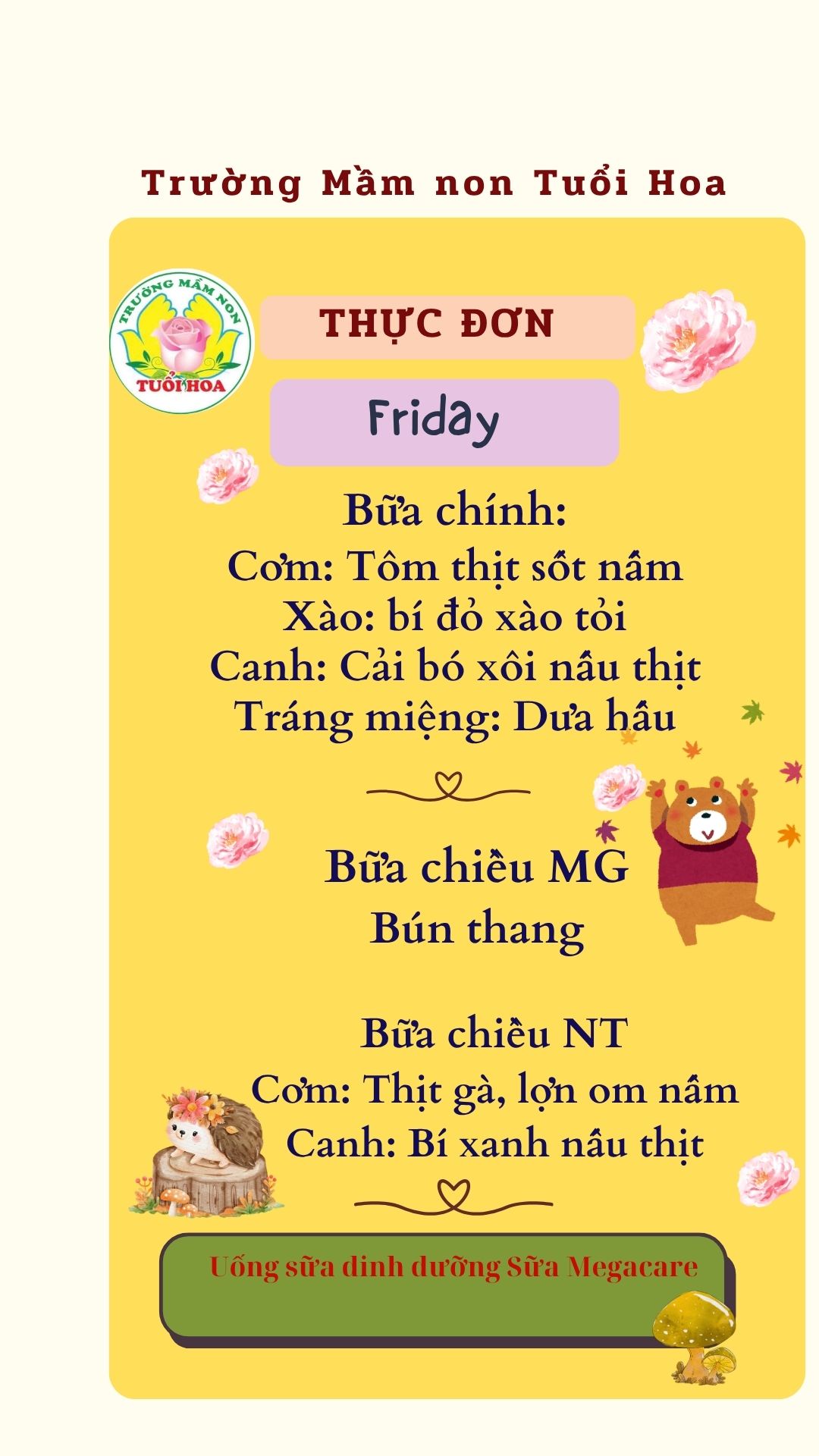 Trường Mầm non Tuổi Hoa không chỉ đem lại bữa ăn ngon cho các con học sinh mà các con còn được học kỹ năng tự phục vụ, cách ngồi ăn lịch sự, giữ gìn vệ sinh cá nhân và chia sẻ những cảm nhận về món ăn với cùng cô và các bạn. Các bé ăn ngon miệng là niềm vui của các Bác, các cô. Phụ huynh vui lòng theo dõi thực đơn chi tiết dưới đây: Ghi chú: Thực đơn có thể thay đổi cho phù hợp trong các ngày lễ hội, hoặc có việc đột xuất nhưng vẫn đảm bảo chất dinh dưỡng cho trẻ Ghi chú: Thực đơn có thể thay đổi cho phù hợp trong các ngày lễ hội, hoặc có việc đột xuất nhưng vẫn đảm bảo chất dinh dưỡng cho trẻ Ghi chú: Thực đơn có thể thay đổi cho phù hợp trong các ngày lễ hội, hoặc có việc đột xuất nhưng vẫn đảm bảo chất dinh dưỡng cho trẻ Ghi chú: Thực đơn có thể thay đổi cho phù hợp trong các ngày lễ hội, hoặc có việc đột xuất nhưng vẫn đảm bảo chất dinh dưỡng cho trẻ Ghi chú: Thực đơn có thể thay đổi cho phù hợp trong các ngày lễ hội, hoặc có việc đột xuất nhưng vẫn đảm bảo chất dinh dưỡng cho trẻ