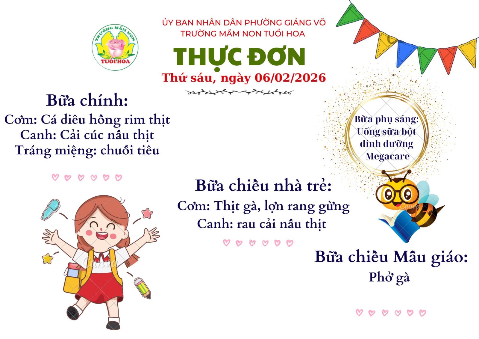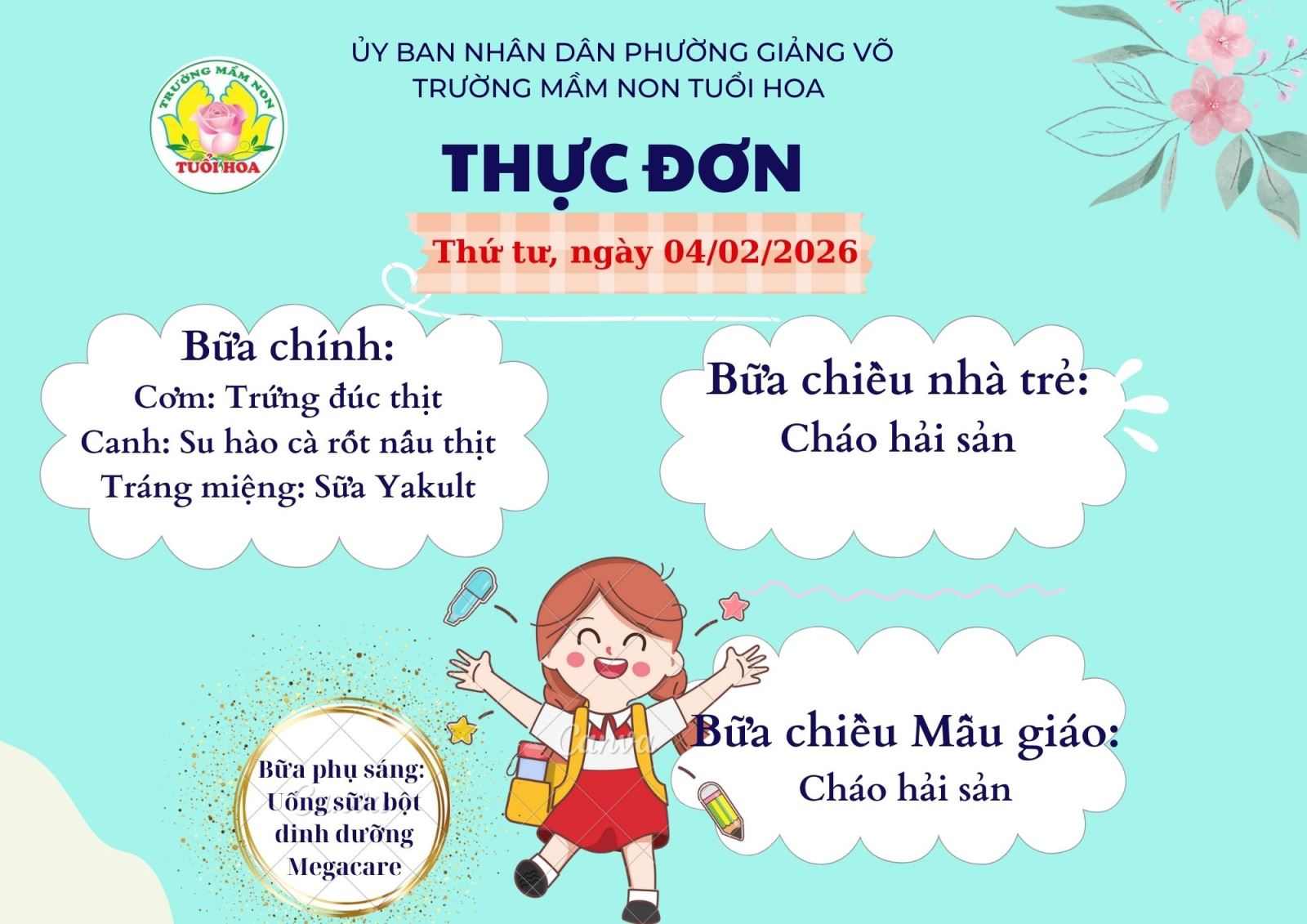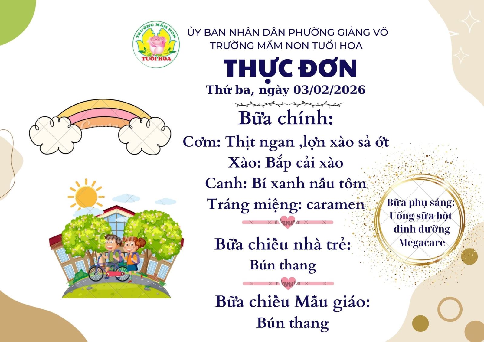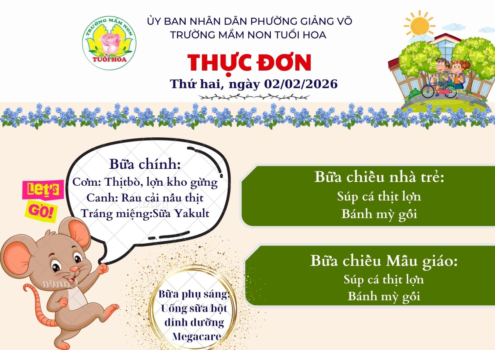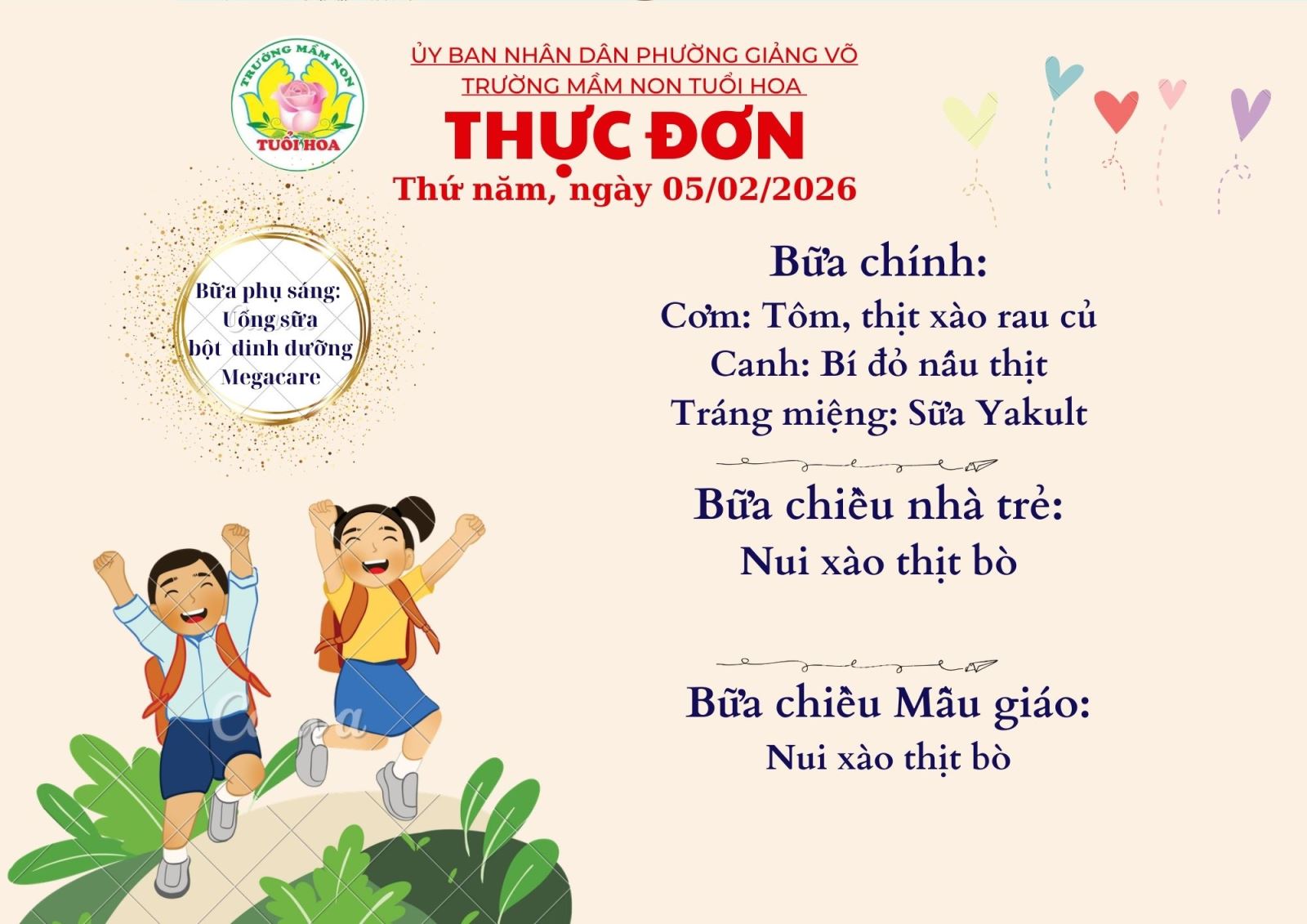 Ghi chú: Thực đơn có thể thay đổi cho phù hợp trong các ngày lễ hội, hoặc có việc đột xuất nhưng vẫn đảm bảo chất dinh dưỡng cho trẻ.