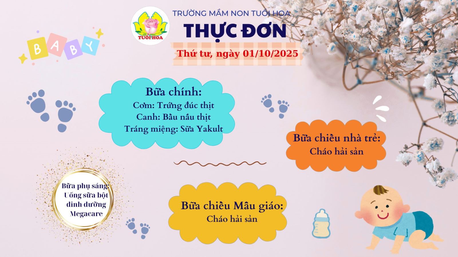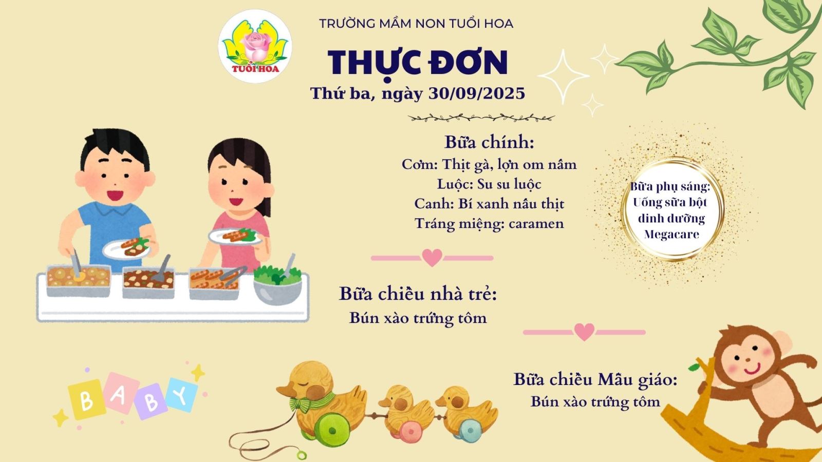 Ghi chú: Thực đơn có thể thay đổi cho phù hợp trong các ngày lễ hội, hoặc có việc đột xuất nhưng vẫn đảm bảo chất dinh dưỡng cho trẻ