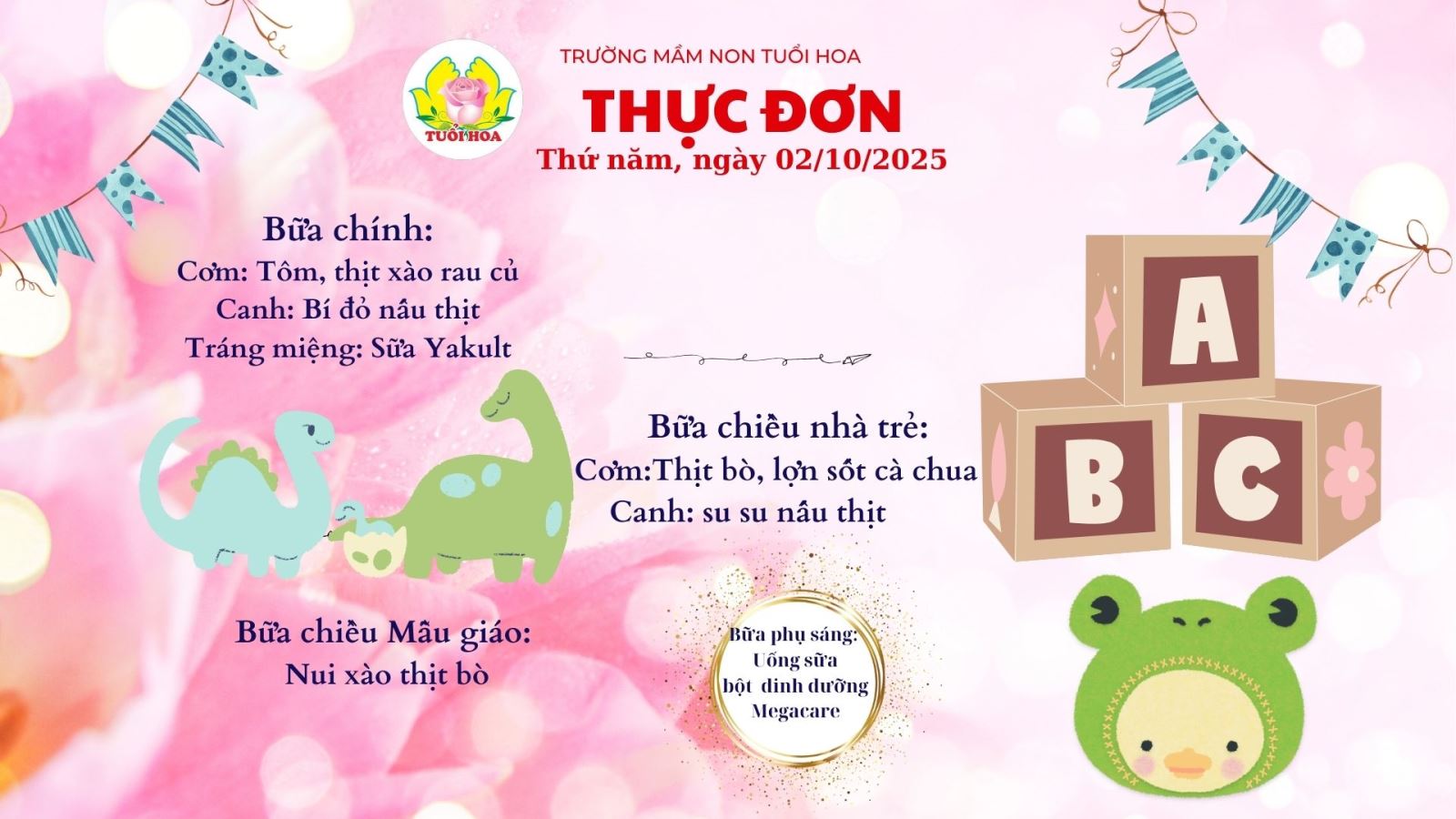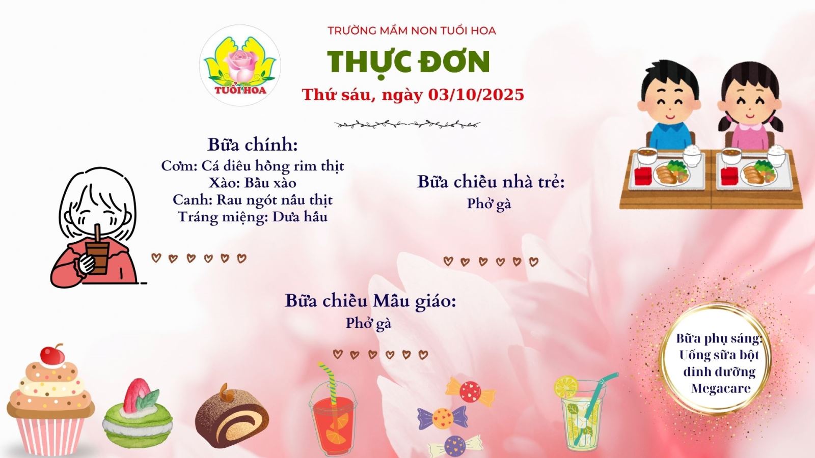 🌼 Nhà trường xin gửi đến quý phụ huynh thực đơn dinh dưỡng dành cho các bé. Mỗi bữa ăn đều đảm bảo đầy đủ dưỡng chất cần thiết cho sự phát triển thể chất và trí tuệ của trẻ. Mong rằng quý phụ huynh sẽ cùng đồng hành với nhà trường trong việc chăm sóc sức khỏe và tạo nền tảng vững chắc cho bé yêu. Bố mẹ cùng xem các bé sẽ được thưởng thức món ngon gì nhé!