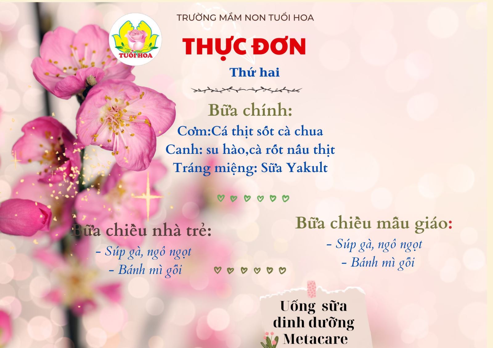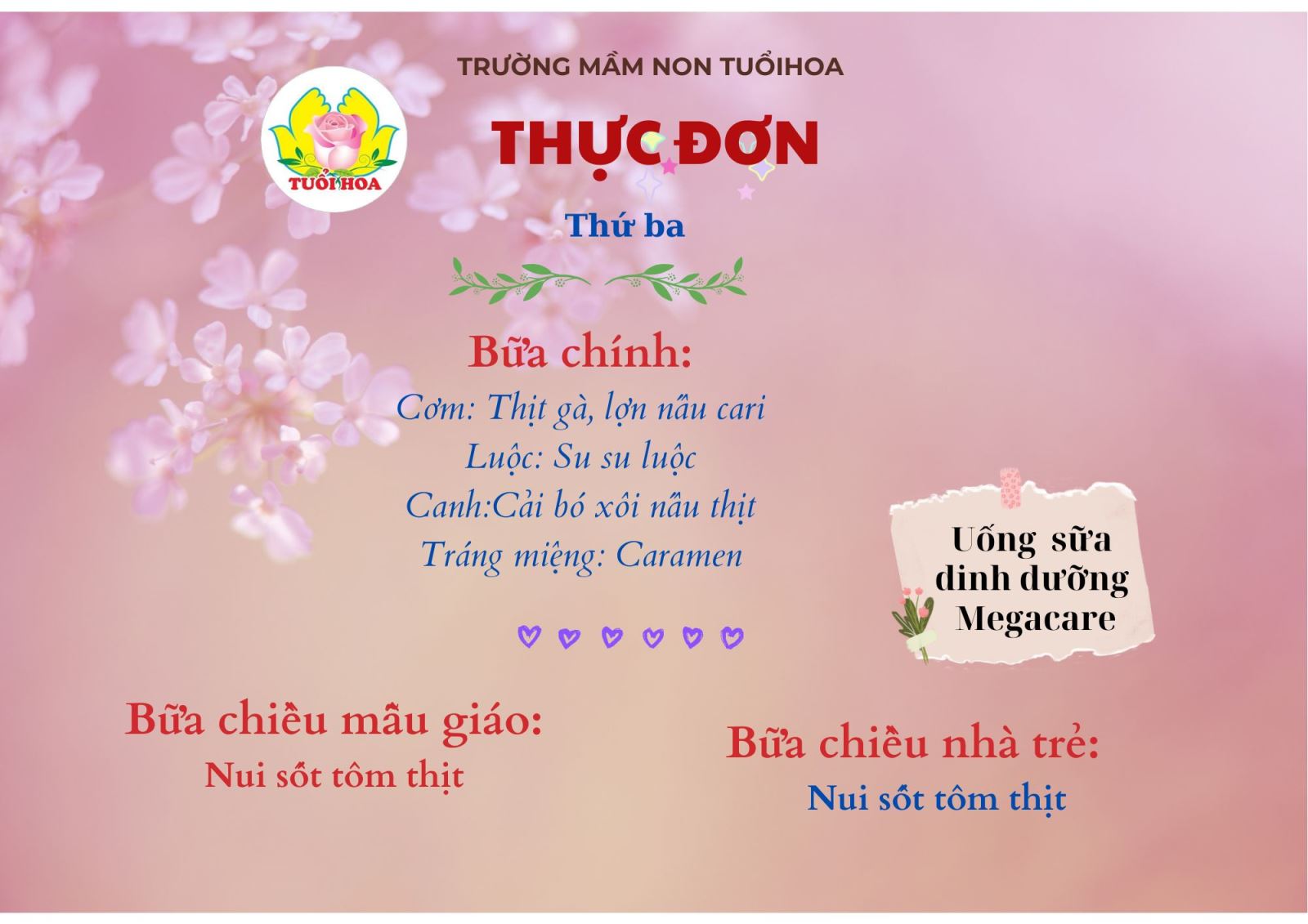 Xin kính mời quý phụ huynh cùng theo dõi chi tiết thực đơn để đồng hành cùng nhà trường trong việc chăm sóc dinh dưỡng cho các con.