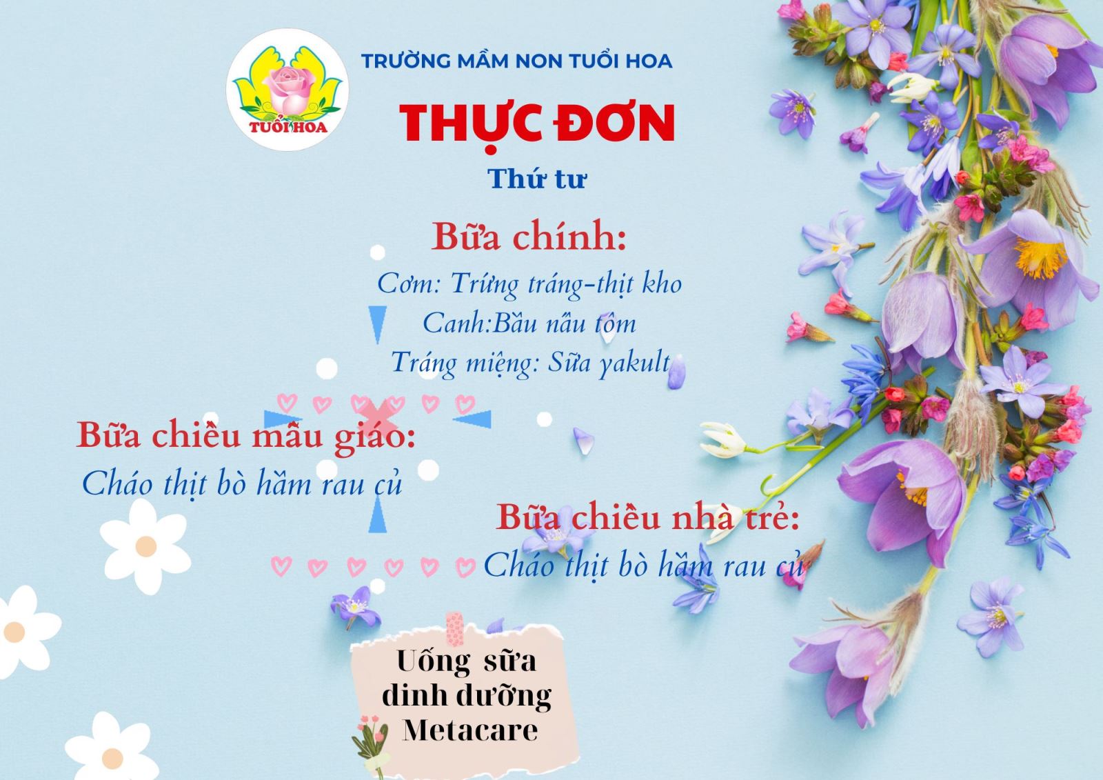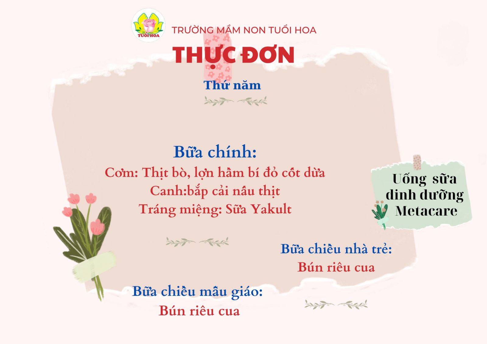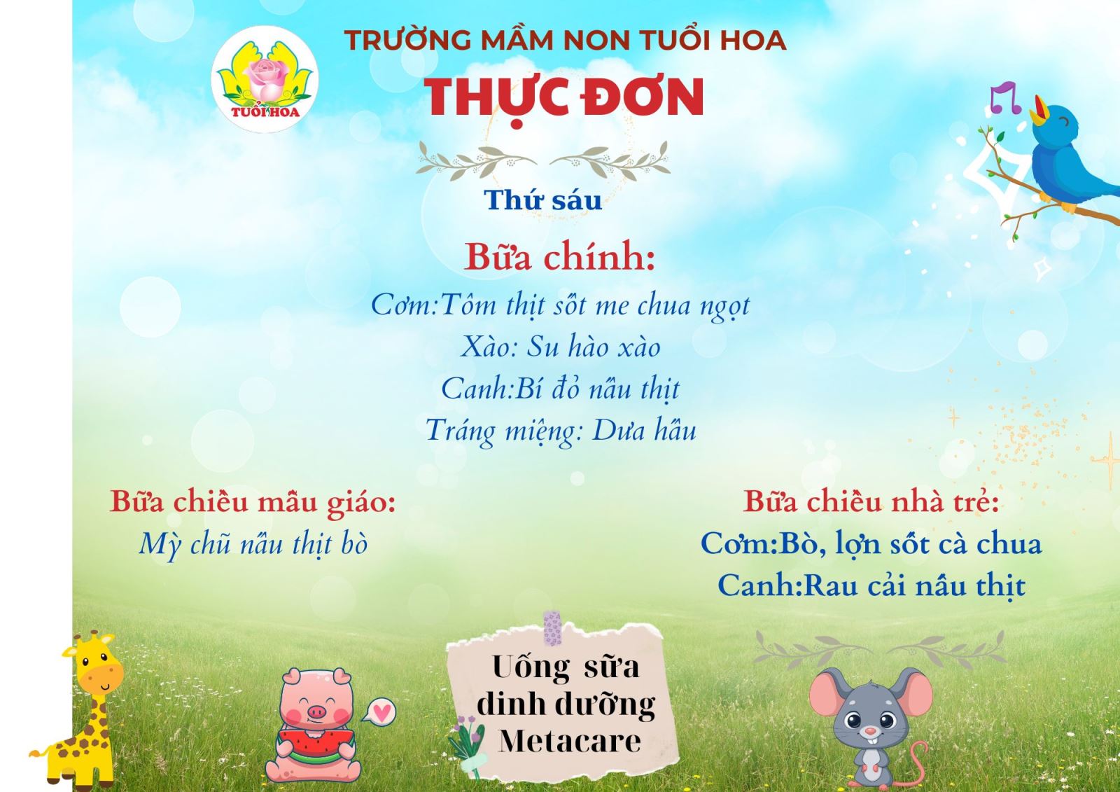 Ghi chú: Thực đơn có thể thay đổi cho phù hợp trong các ngày lễ hội, hoặc có việc đột xuất nhưng vẫn đảm bảo chất dinh dưỡng cho trẻ