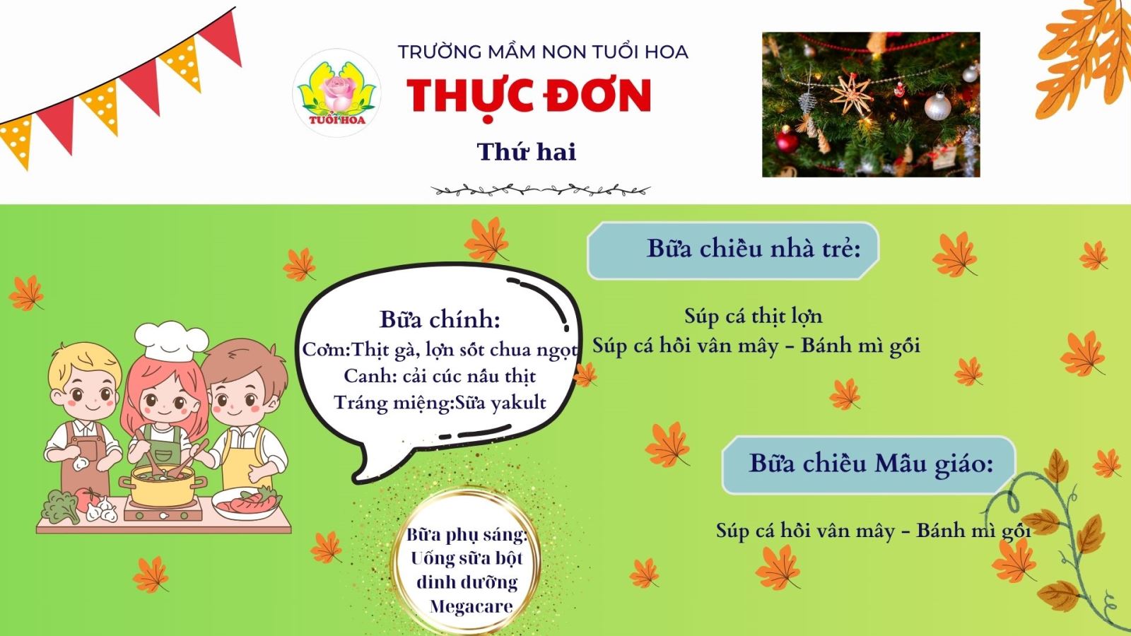 Nhà trường xin gửi đến quý phụ huynh thực đơn bổ dưỡng tuần 3 tháng 12 dành cho các bé. Với mong muốn mang lại những bữa ăn vừa ngon miệng vừa giàu dinh dưỡng, đội ngũ bếp ăn đã xây dựng thực đơn đa dạng, cân đối giữa các nhóm thực phẩm, giúp các con có đủ năng lượng học tập và vui chơi trong những ngày đông se lạnh.