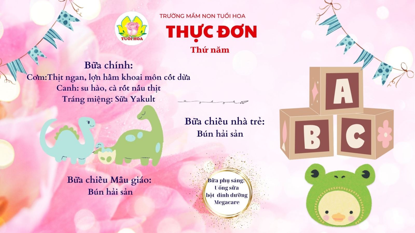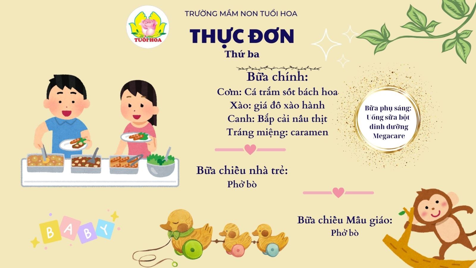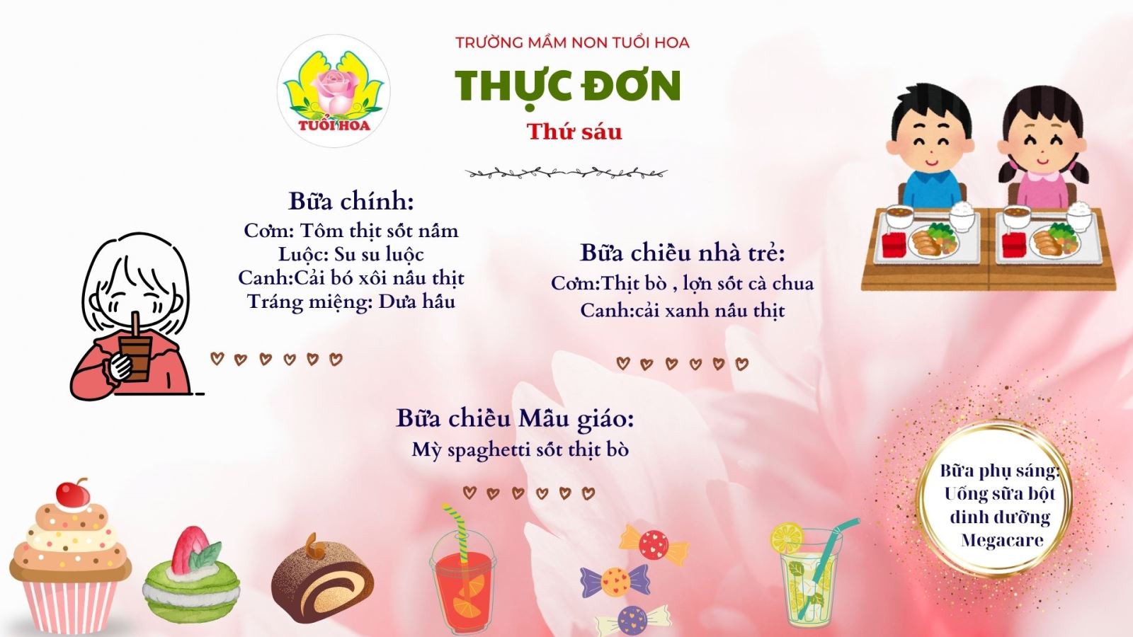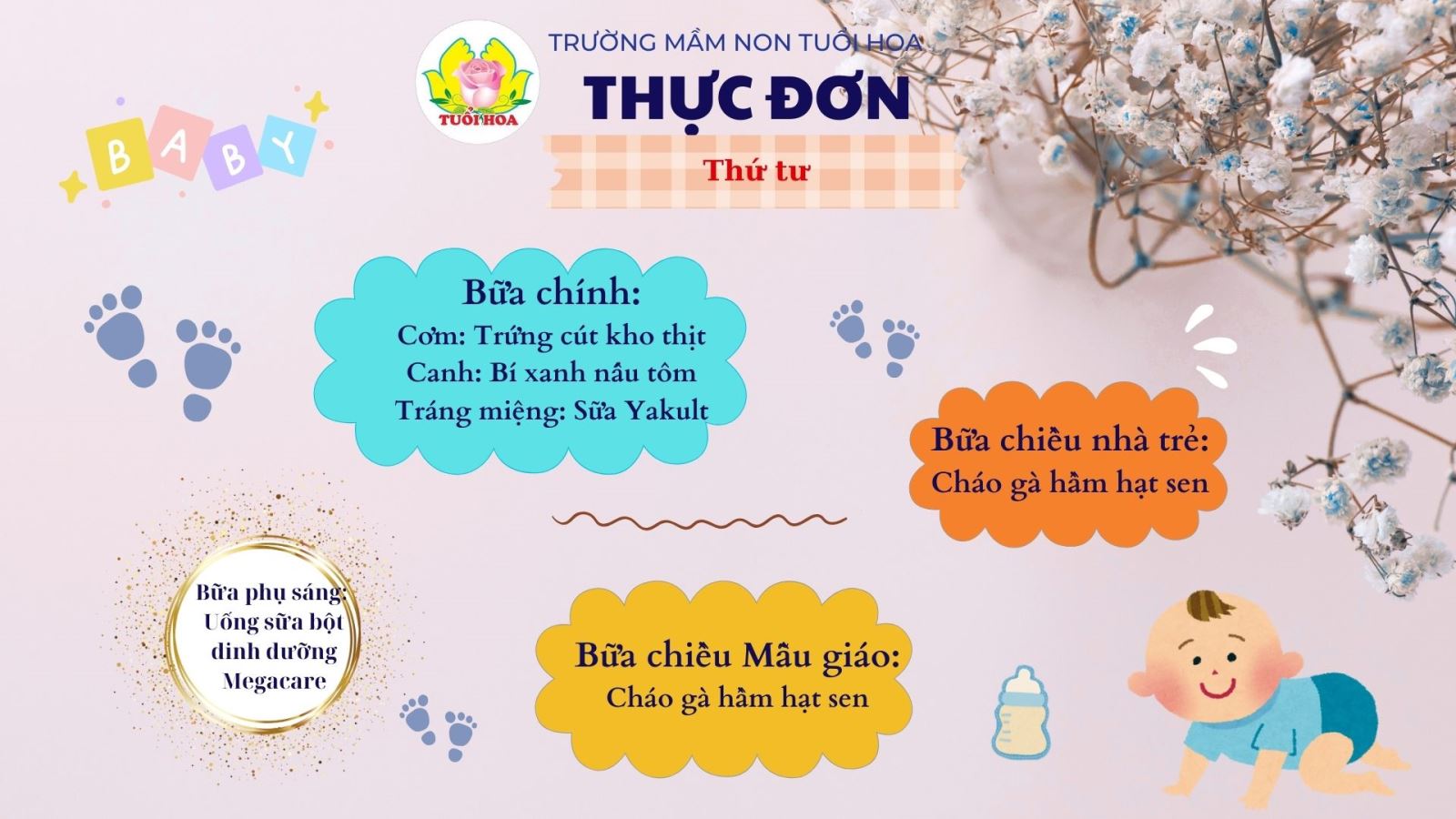 Ghi chú: Thực đơn có thể thay đổi cho phù hợp trong các ngày lễ hội, hoặc có việc đột xuất nhưng vẫn đảm bảo chất dinh dưỡng cho trẻ