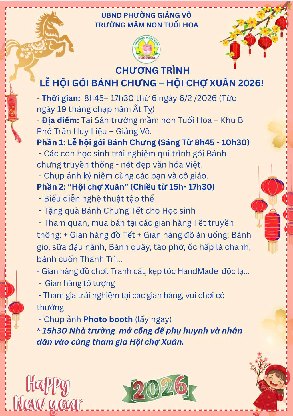 Trường mầm non Tuổi Hoa thông báo lịch nghỉ Tết Nguyên Đán 2026