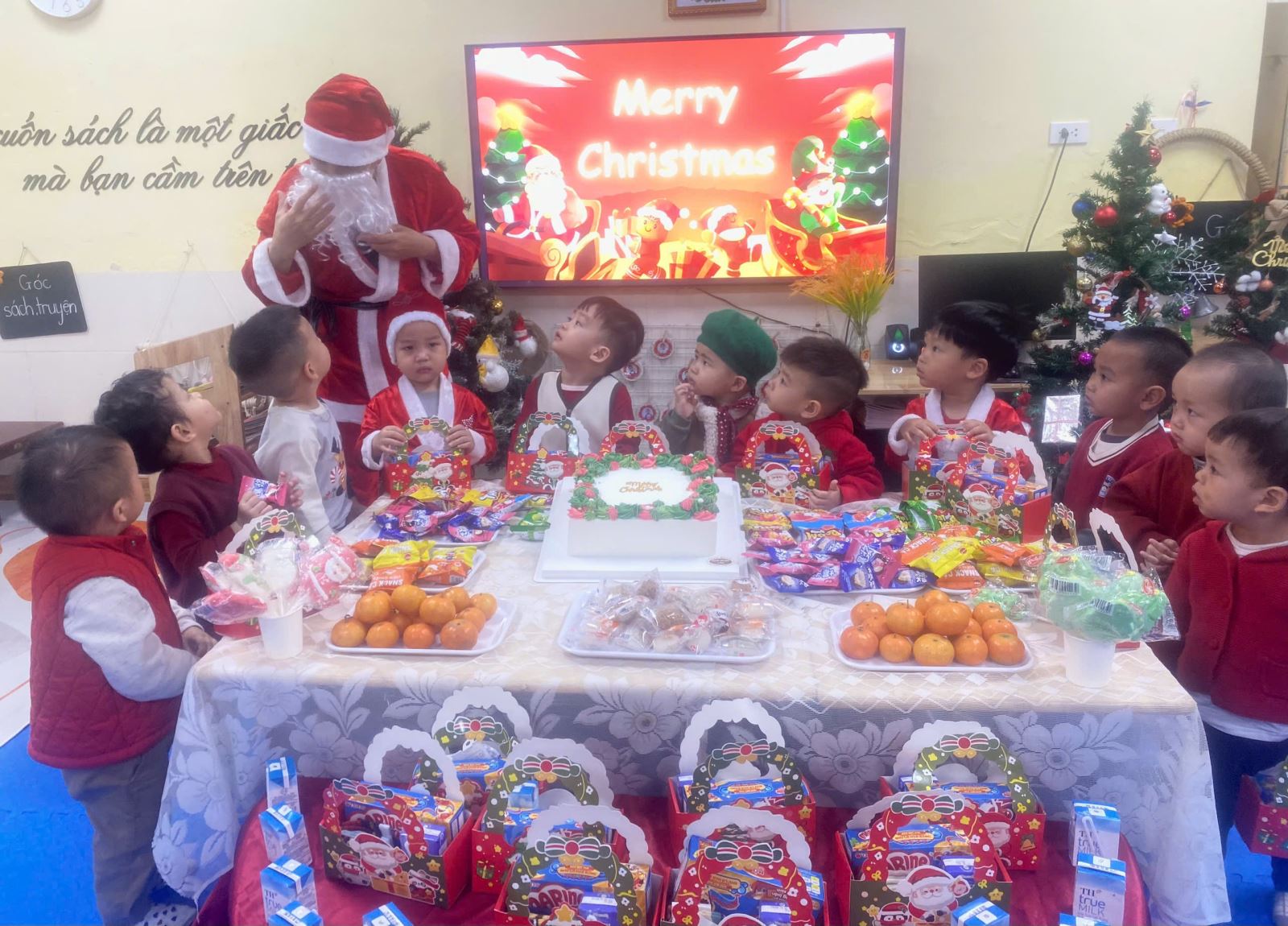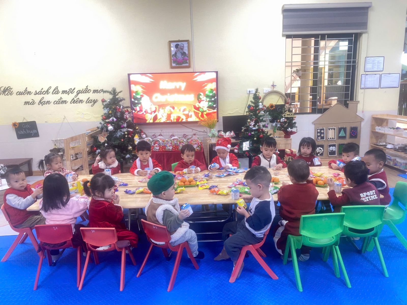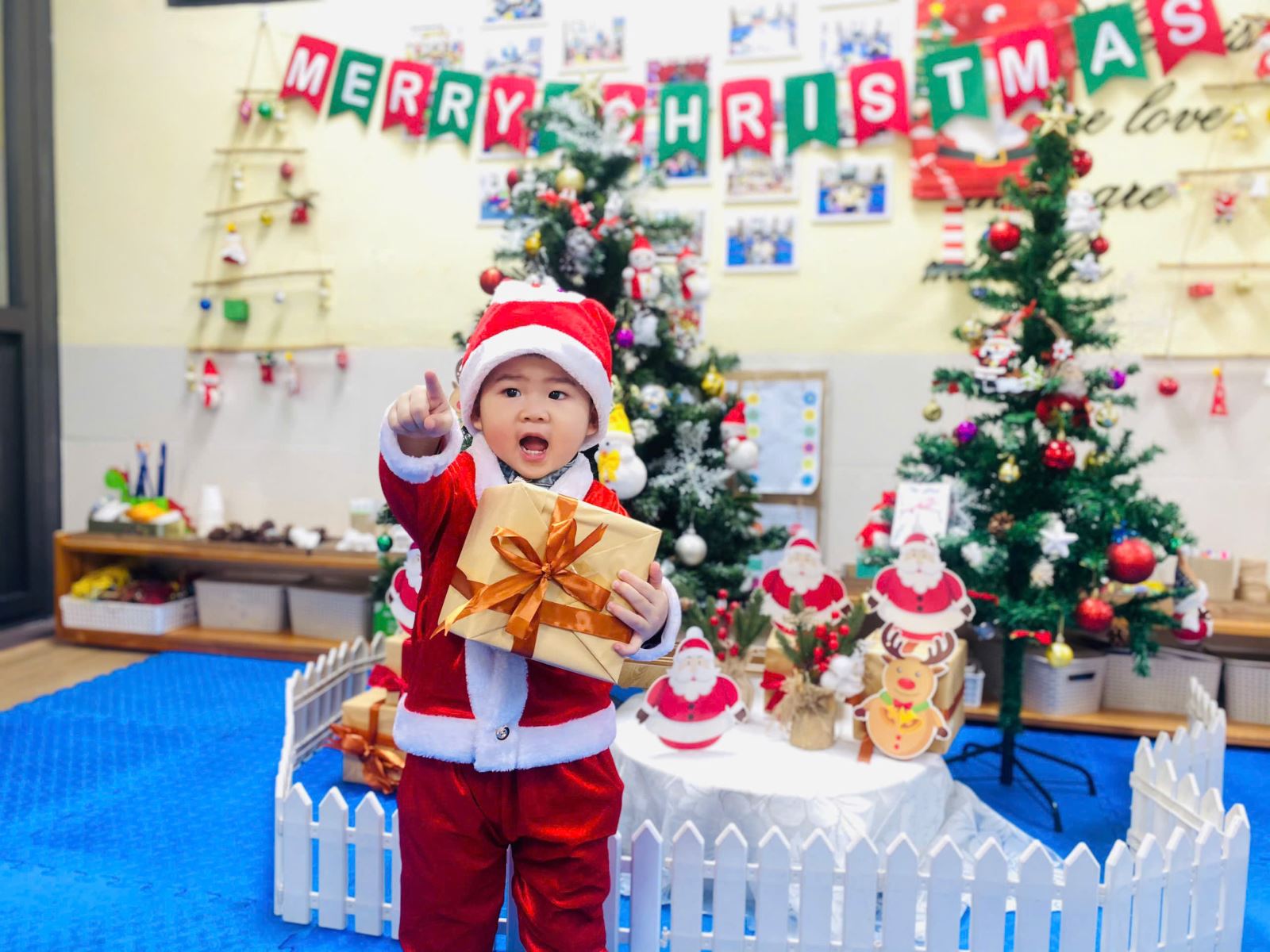 Trong không khí Giáng sinh rộn ràng khắp nơi, ở lớp học D3 cũng đã được trang trí lung linh với cây thông, ông già Noel, và những hộp quà xinh xắn để dành tặng cho các bé yêu. Các con hào hứng tham gia nhiều hoạt động ý nghĩa như chụp ảnh Noel, liên hoan Giáng sinh, nhận quà từ ông già Noel và cùng nhau chia sẻ những khoảnh khắc ngập tràn tiếng cười. Mỗi ánh mắt, nụ cười hồn nhiên của các con chính là món quà Giáng sinh quý giá nhất dành cho bố mẹ và cô giáo.