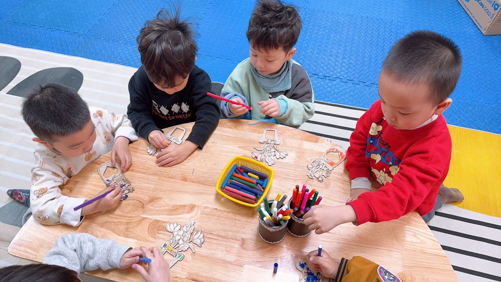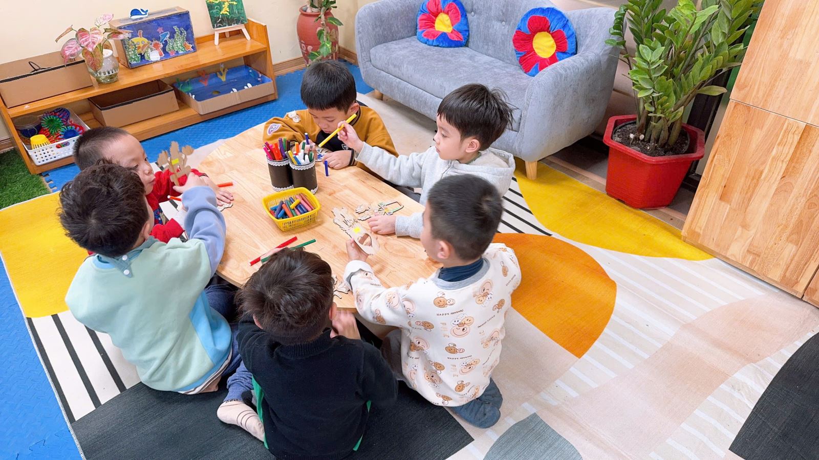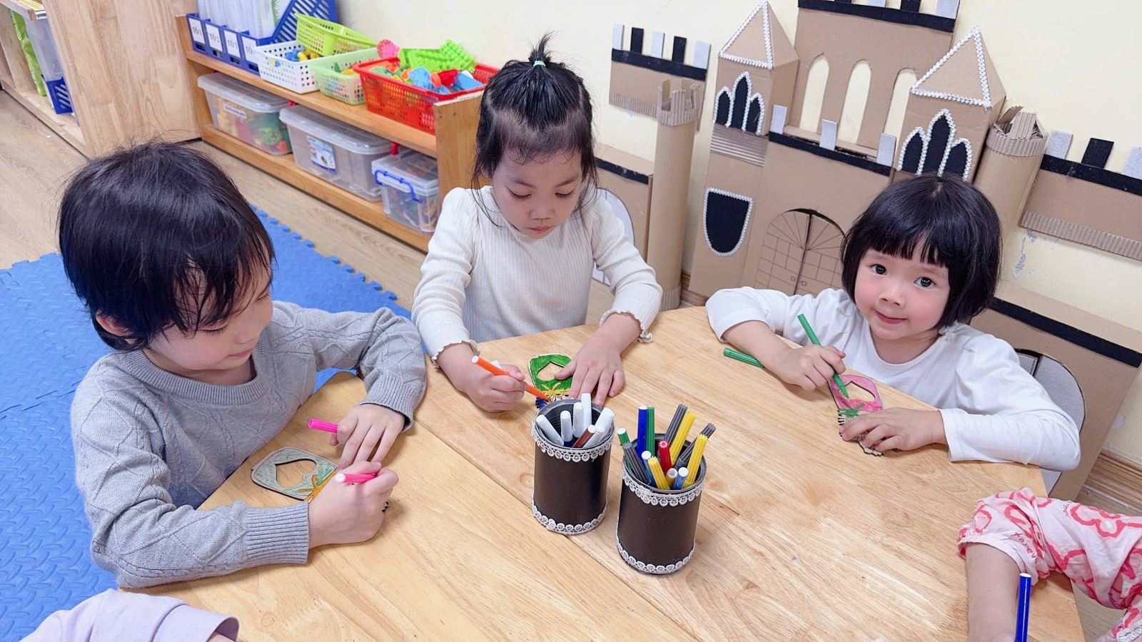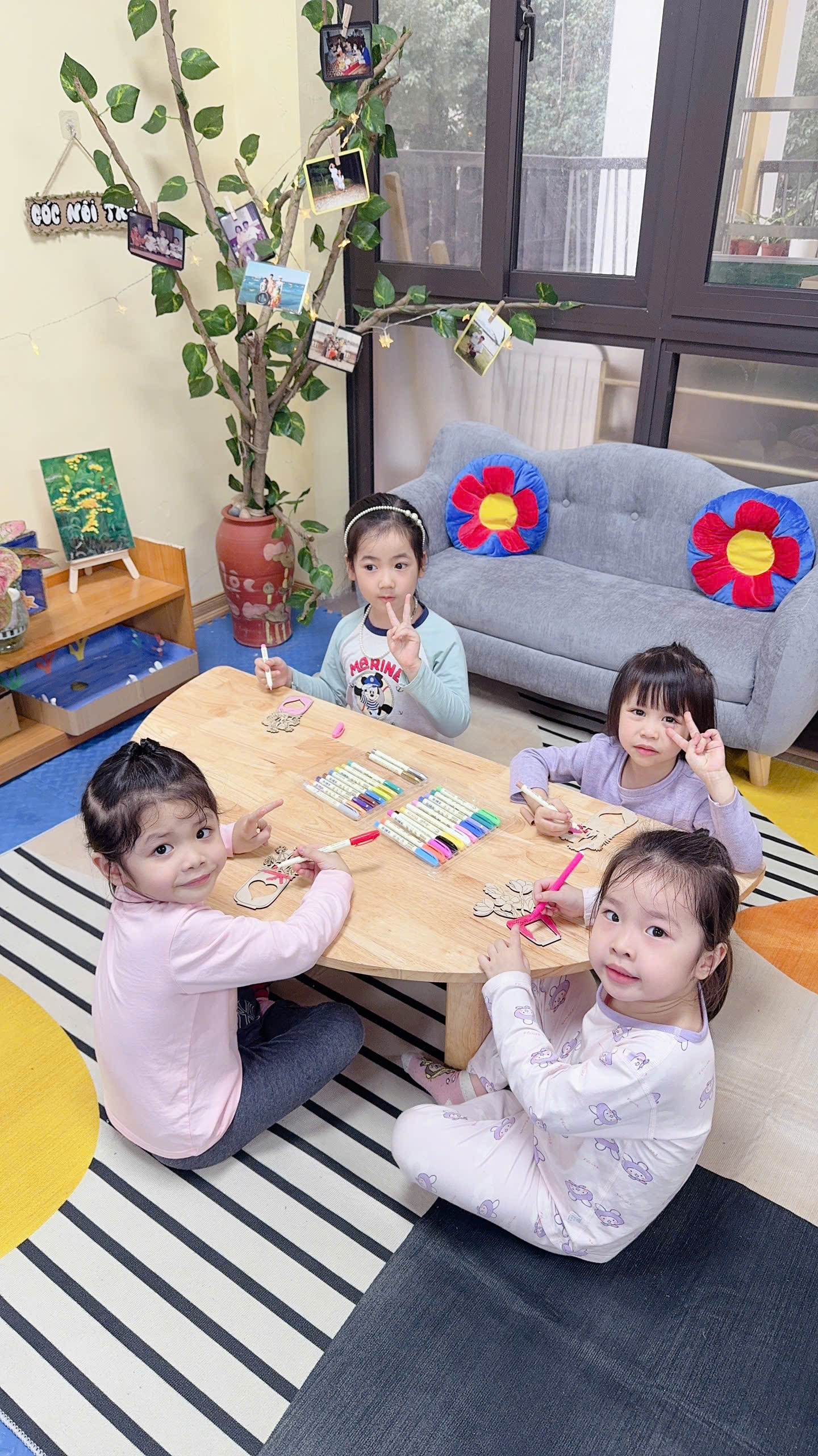 Hình ảnh các bé đang tự tay tô những bông hoa thật đẹp