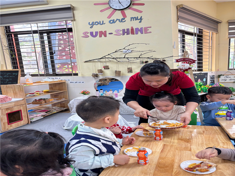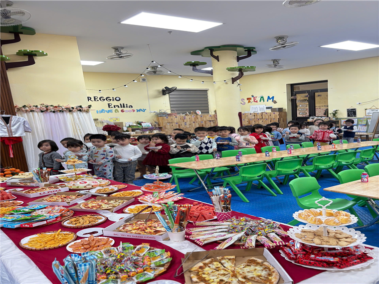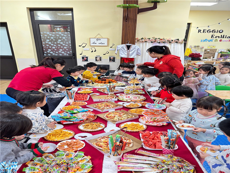 Buổi tiệc mang đến một bữa tiệc đầy màu sắc với những món ăn hấp dẫn. Những món ăn được trình bày đẹp mắt, từ các loại trái cây tươi ngon, bánh ngọt, cho đến những món ăn nhẹ đều được các cô giáo chuẩn bị kỹ lưỡng, đảm bảo dinh dưỡng và hấp dẫn khẩu vị của các em bé yêu.
