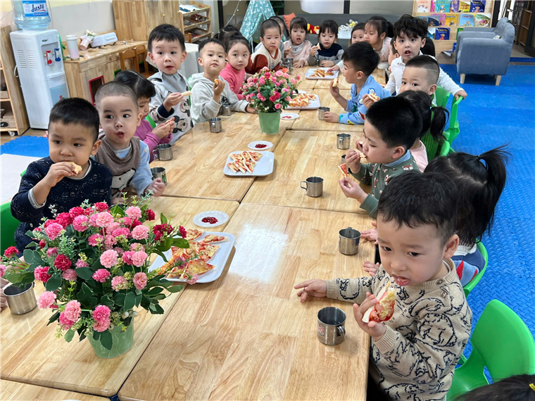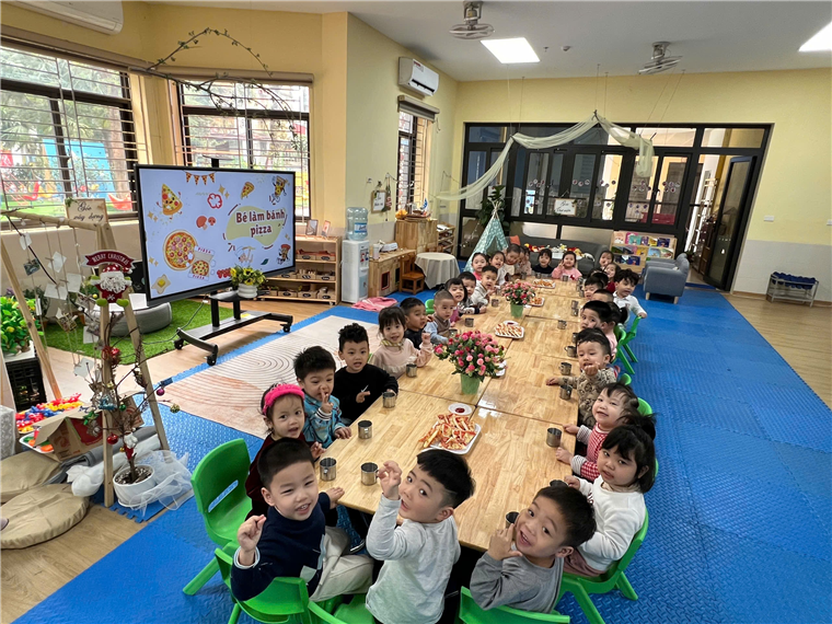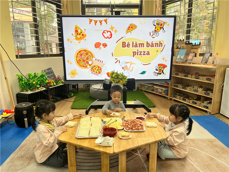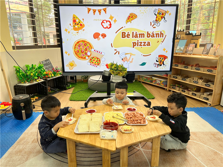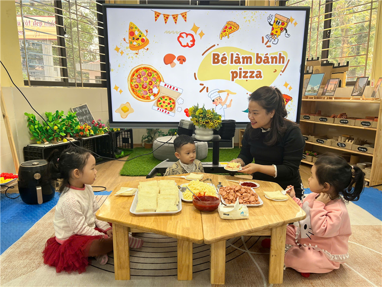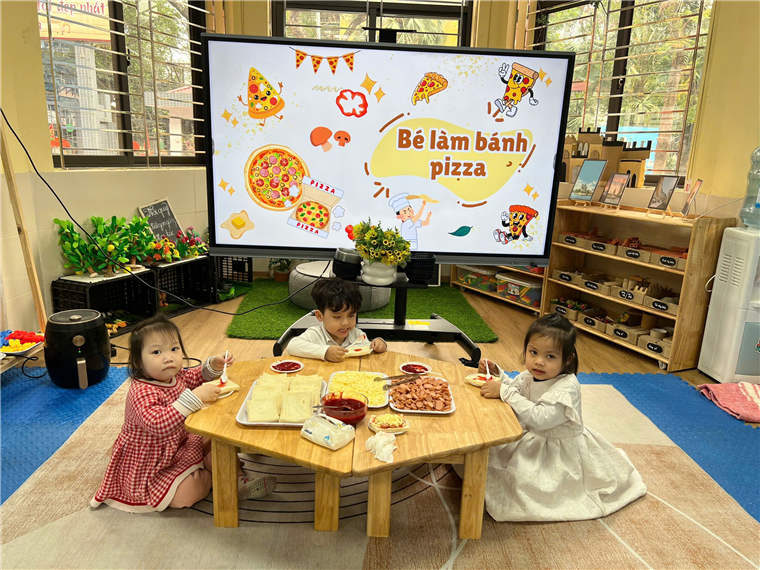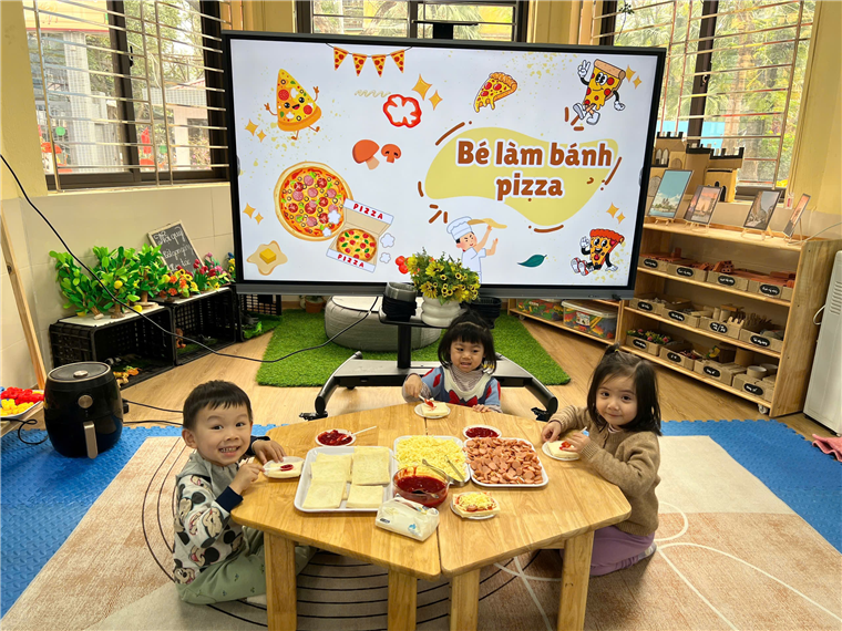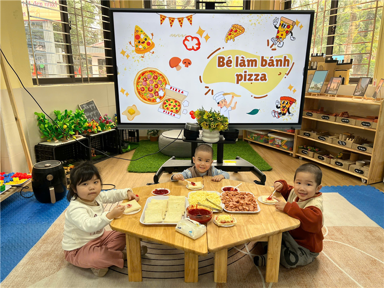 Với sự chuẩn bị chu đáo của các cô giáo, các nguyên liệu như đế bánh pizza, phô mai và xúc xích đã trở thành “bộ dụng cụ” đầy hấp dẫn cho các bạn nhỏ. Dưới sự hướng dẫn nhiệt tình, từng con đã tự tay thêm topping lên bánh, thỏa sức sáng tạo để tạo nên chiếc pizza theo ý tưởng riêng của mình .Các con quan sát cô đưa bánh pizza vào lò nướng chín bánh. Tiếng cười giòn tan và ánh mắt sáng ngời của các con yêu khi chiếc bánh hoàn thiện đã khiến buổi hoạt động trở nên thật ấm áp.