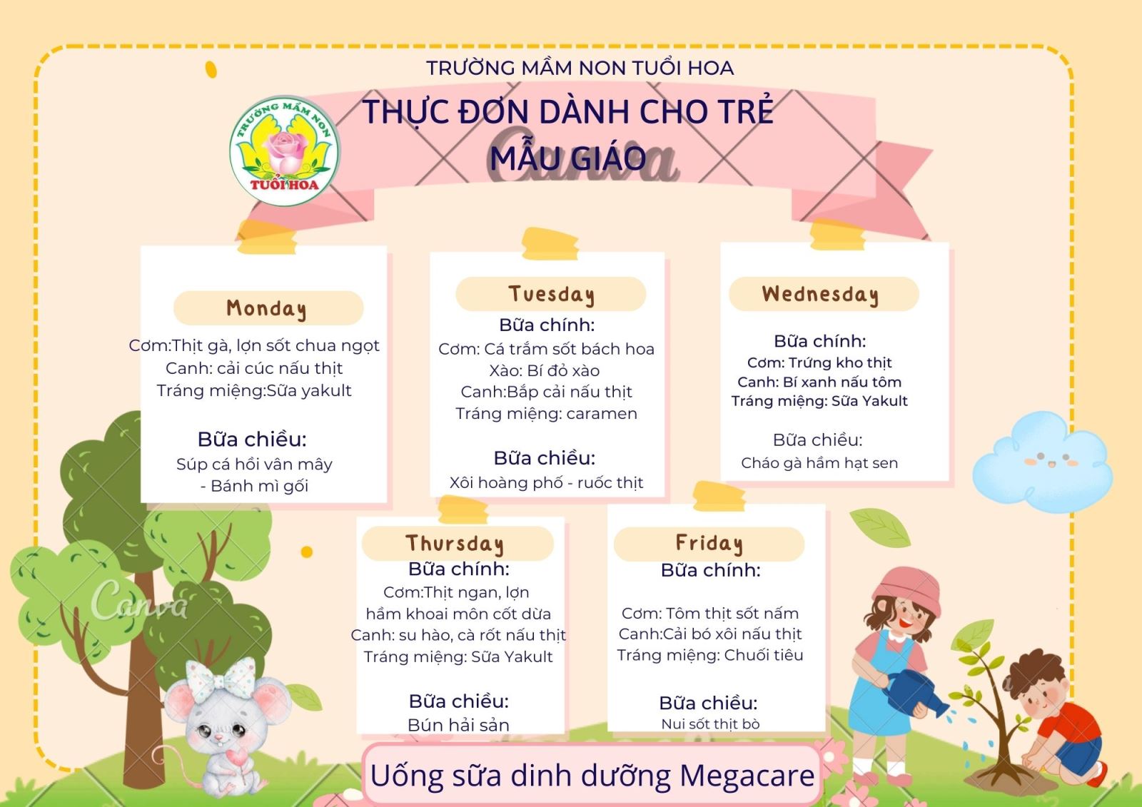 Ghi chú: Thực đơn có thể thay đổi cho phù hợp trong các ngày lễ hội, hoặc có việc đột xuất nhưng vẫn đảm bảo chất dinh dưỡng cho trẻ