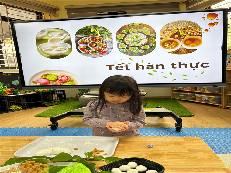 Lớp mẫu giáo bé C rộn ràng hơn bao giờ hết khi các bé tham gia hoạt động làm bánh trôi nước nhân dịp Tết Hàn Thực. Dưới sự hướng dẫn tận tình của các cô, từng đôi tay nhỏ nhắn, khéo léo vo tròn viên bánh, nhân đường bên trong tạo r những đĩa bánh nhỏ xinh nhiều màu sắc.