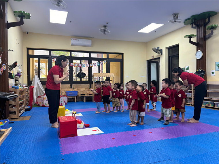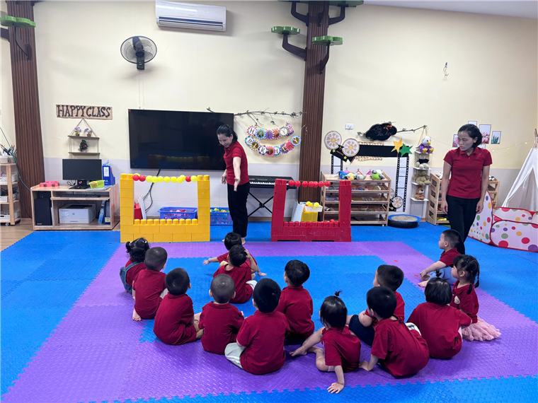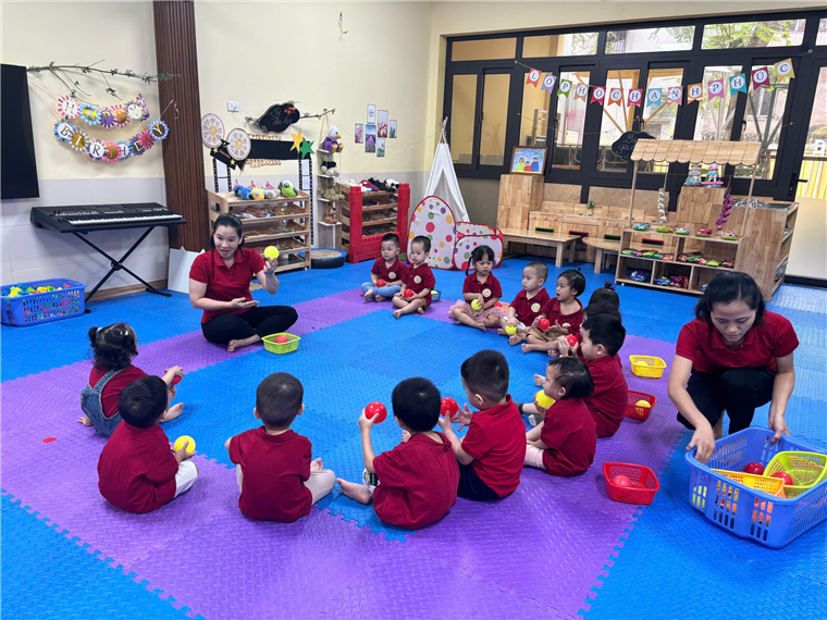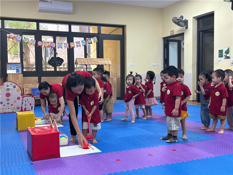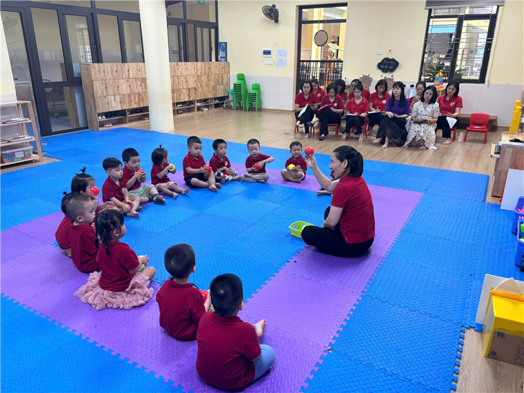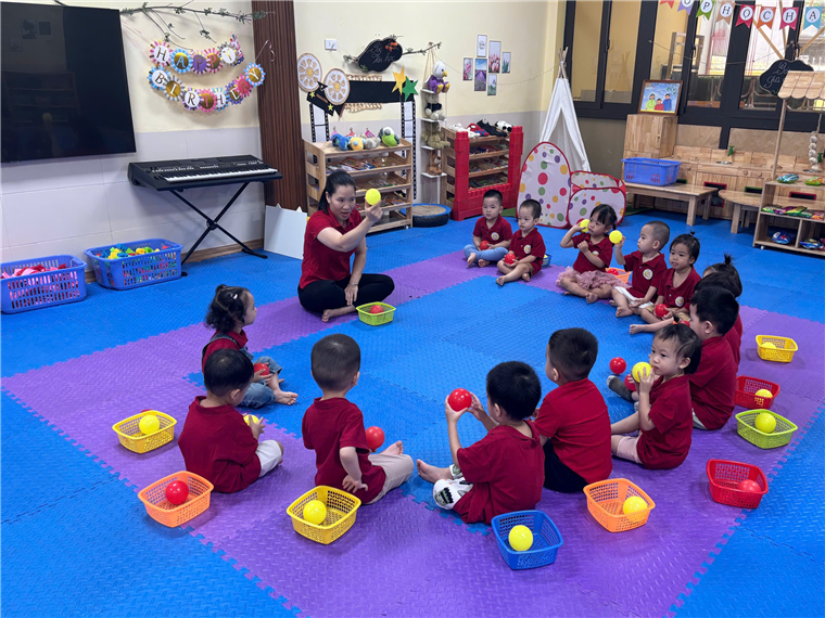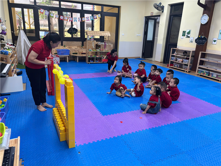 Hôm nay, lớp Nhà trẻ D2 tổ chức hoạt động nhận biết màu đỏ và màu vàng đầy sinh động, với sự tham gia của cô, trò lớp nhà trẻ D2 cùng các bác các cô trong trường đến thăm lớp học. Các bé được trải nghiệm thực hành qua các trò chơi đáng yêu như đánh golf, thi đua giữa hai đội xem đội nào gắn bóng đúng theo yêu cầu của cô..... giúp trẻ vừa phát triển kỹ năng vận động vừa nhận biết được màu sắc. Buổi học kết thúc trong niềm vui hứng khởi, mang đến sự tự tin và phấn khởi cho các em bé, cũng như để lại ấn tượng tốt đẹp với các cô, các bác dự giờ.