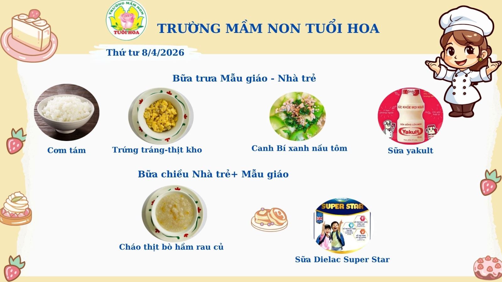 Ghi chú: Thực đơn có thể thay đổi cho phù hợp trong các ngày lễ hội, hoặc có việc đột xuất nhưng vẫn đảm bảo chất dinh dưỡng cho trẻ