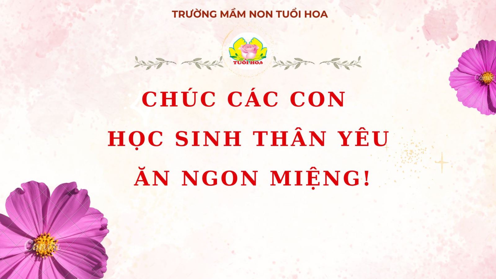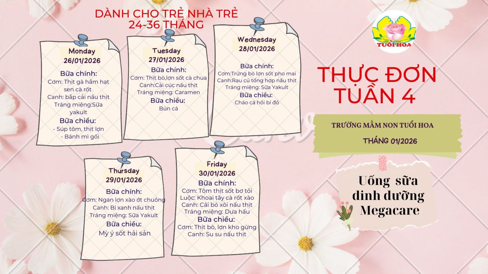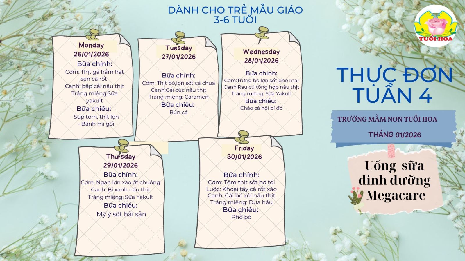 Nhằm đảm bảo các bé có những bữa ăn ngon miệng – đủ chất – an toàn, Trường Mầm non Tuổi Hoa – Giảng Võ xin trân trọng giới thiệu thực đơn dinh dưỡng trong tuần. Các món ăn được xây dựng khoa học, đa dạng, kết hợp hài hòa giữa nguồn đạm, rau củ quả và các món ăn nhẹ hấp dẫn, giúp trẻ phát triển toàn diện cả về thể chất lẫn trí tuệ.