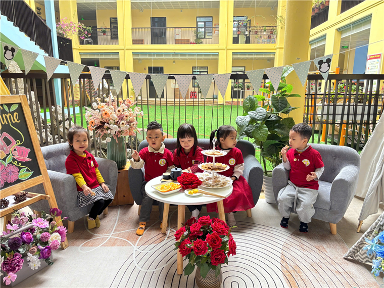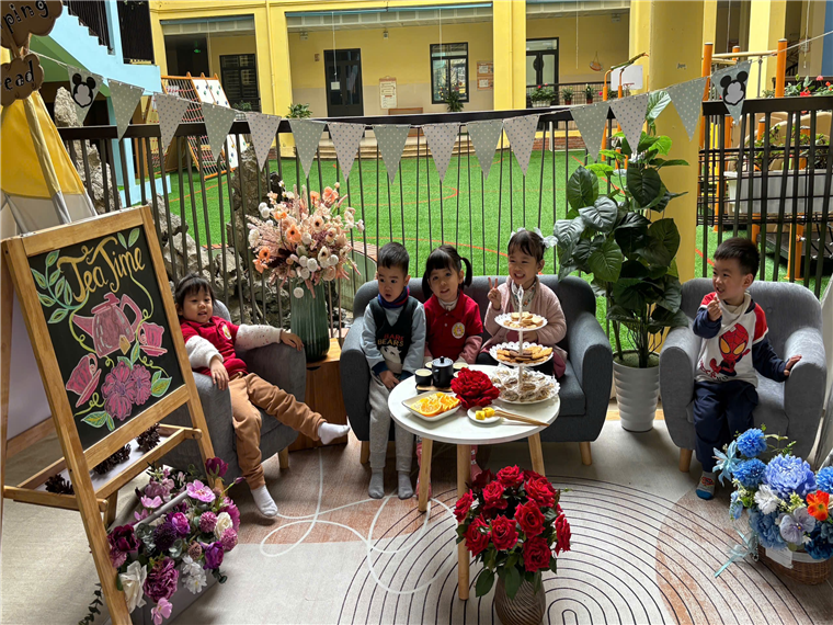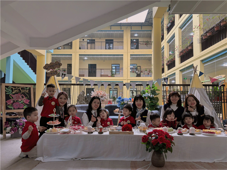 Không gian tiệc còn được trang trí những giỏ hoa tươi xinh đẹp tỏa hương thơm ngát, tạo nên một bức tranh sống động và tươi mới. Các con hào hứng tham gia cùng cô giáo trong việc trang trí bàn tiệc, lựa chọn bánh và thưởng thức trà hoa hồng, trà hoa cúc, tạo ra những khoảnh khắc vui vẻ và gắn kết yêu thương.
