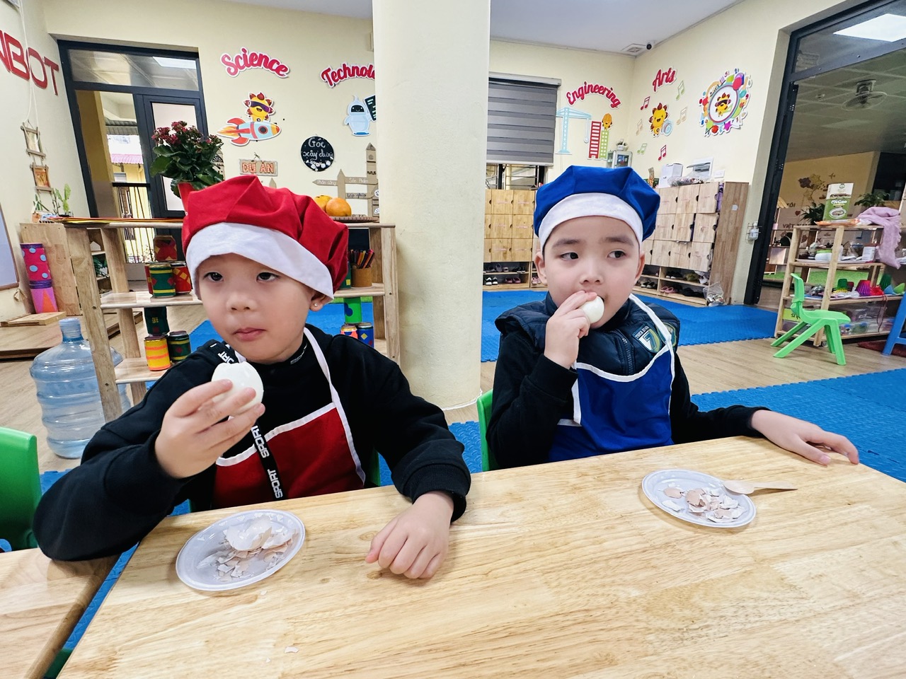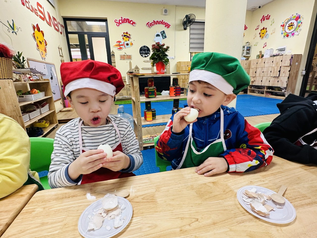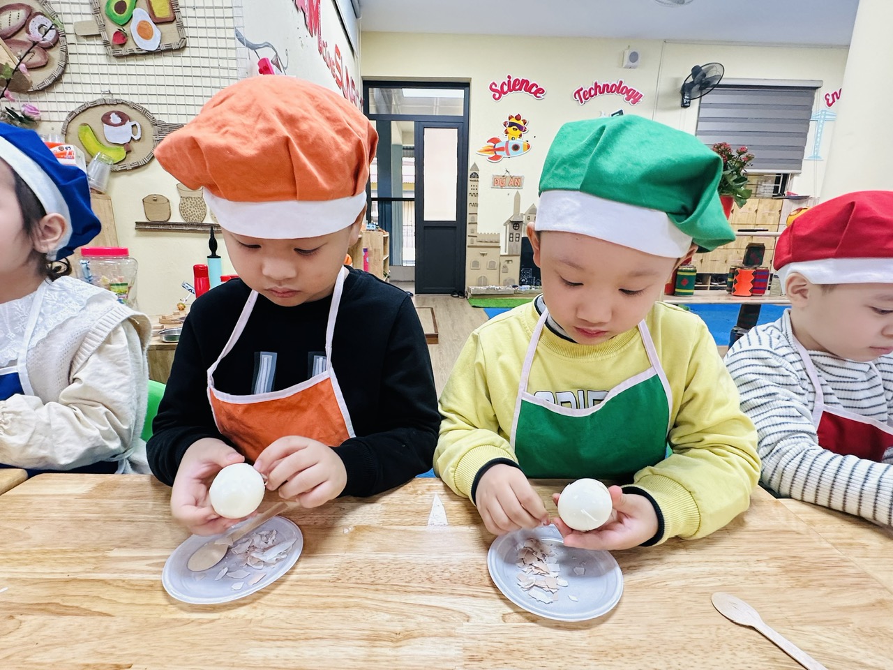 Các bạn nhỏ thưởng thức thành quả là những quả trứng do các bạn tự tay bóc.