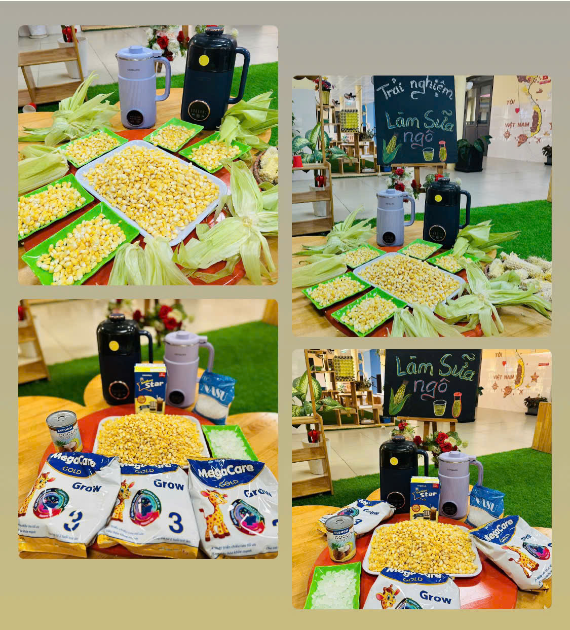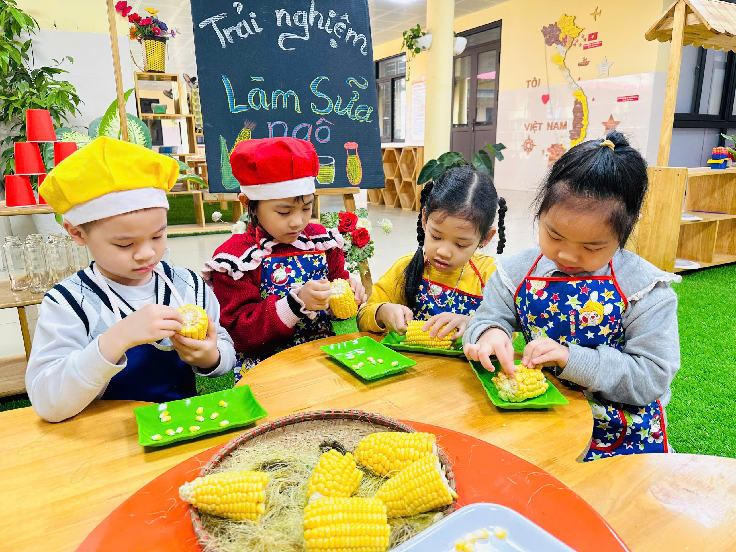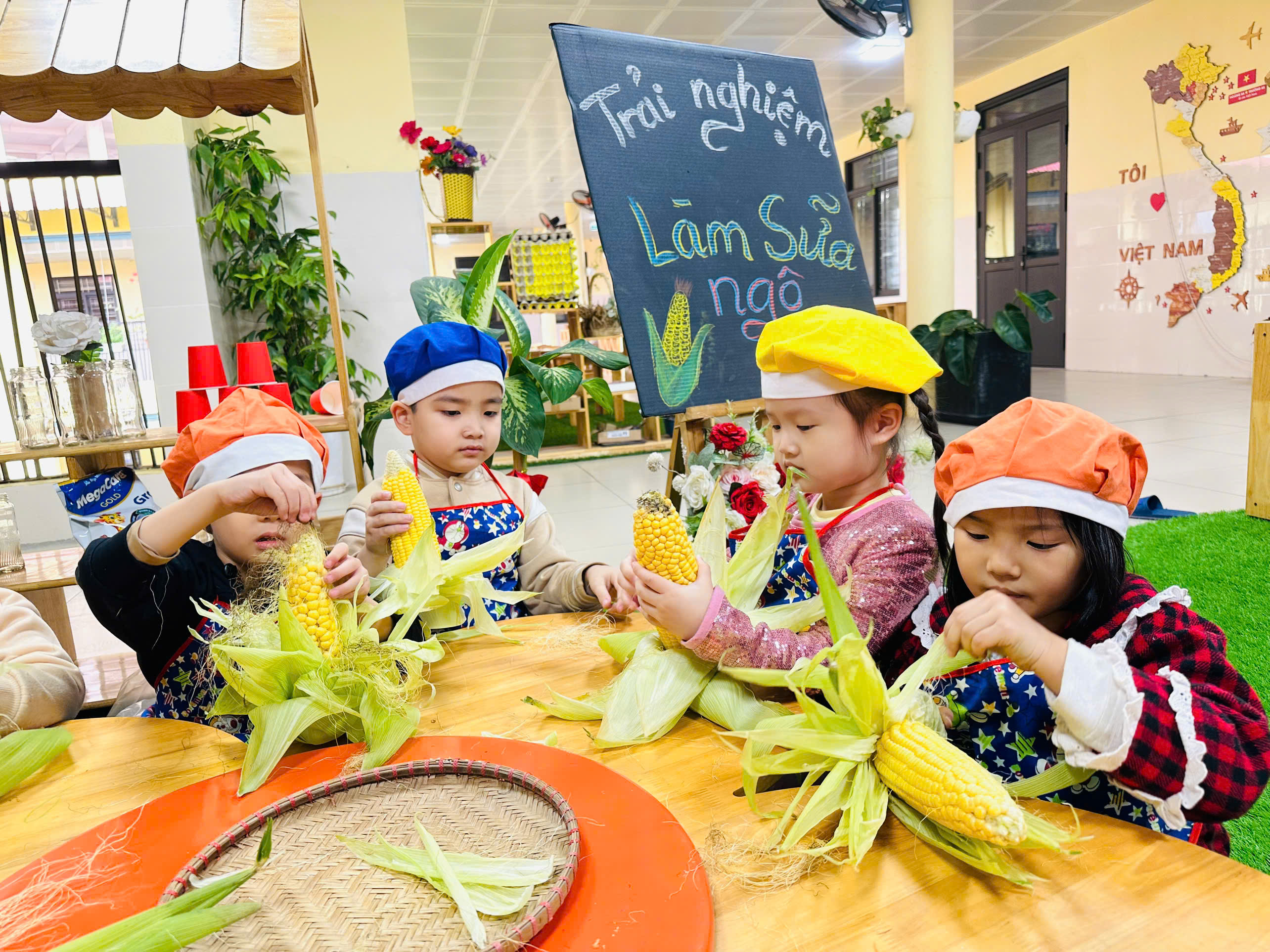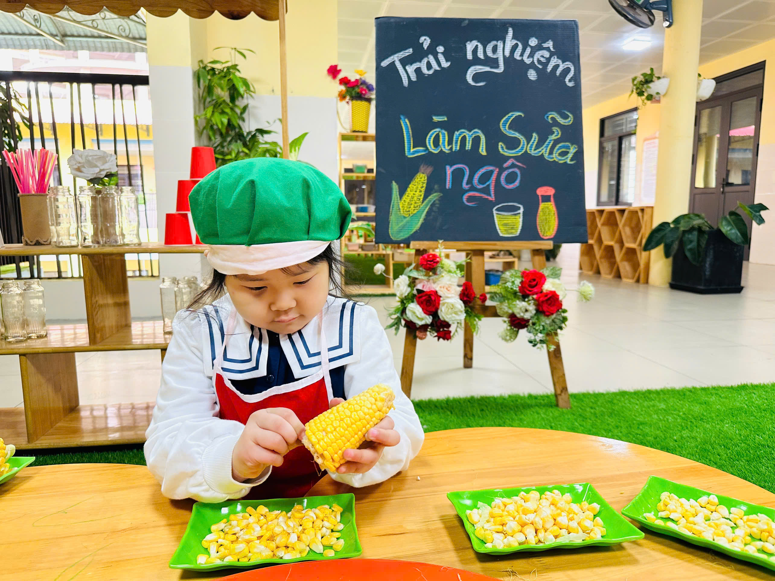 Sữa ngô là thức uống dinh dưỡng rất tốt cho sức khoẻ. Với những nguyên liệu rất gần gũi với trẻ như: Ngô ngọt, sữa tươi, sữa đặc, nước lọc, máy làm sữa hạt , cốc giấy. Các bé lớp mẫu giáo A4 được cô hướng dẫn và tự tay làm những cốc sữa ngô thơm ngon, béo ngậy. Những đôi mắt xinh chăm chú, háo hức cùng bàn tay khéo léo, các con cùng cô chuẩn bị nguyên liệu,rửa ngô, tách hạt ngô và cho các nguyên liệu vào máy làm sữa hạt để tạo nên những cốc sữa ngô thơm ngon nóng hổi và hào hứng thưởng thức thành quả do chính mình làm ra. Bố mẹ cùng nhìn lại các hình ảnh của các bé trong buổi trải nghiệm thú vị này nhé!
