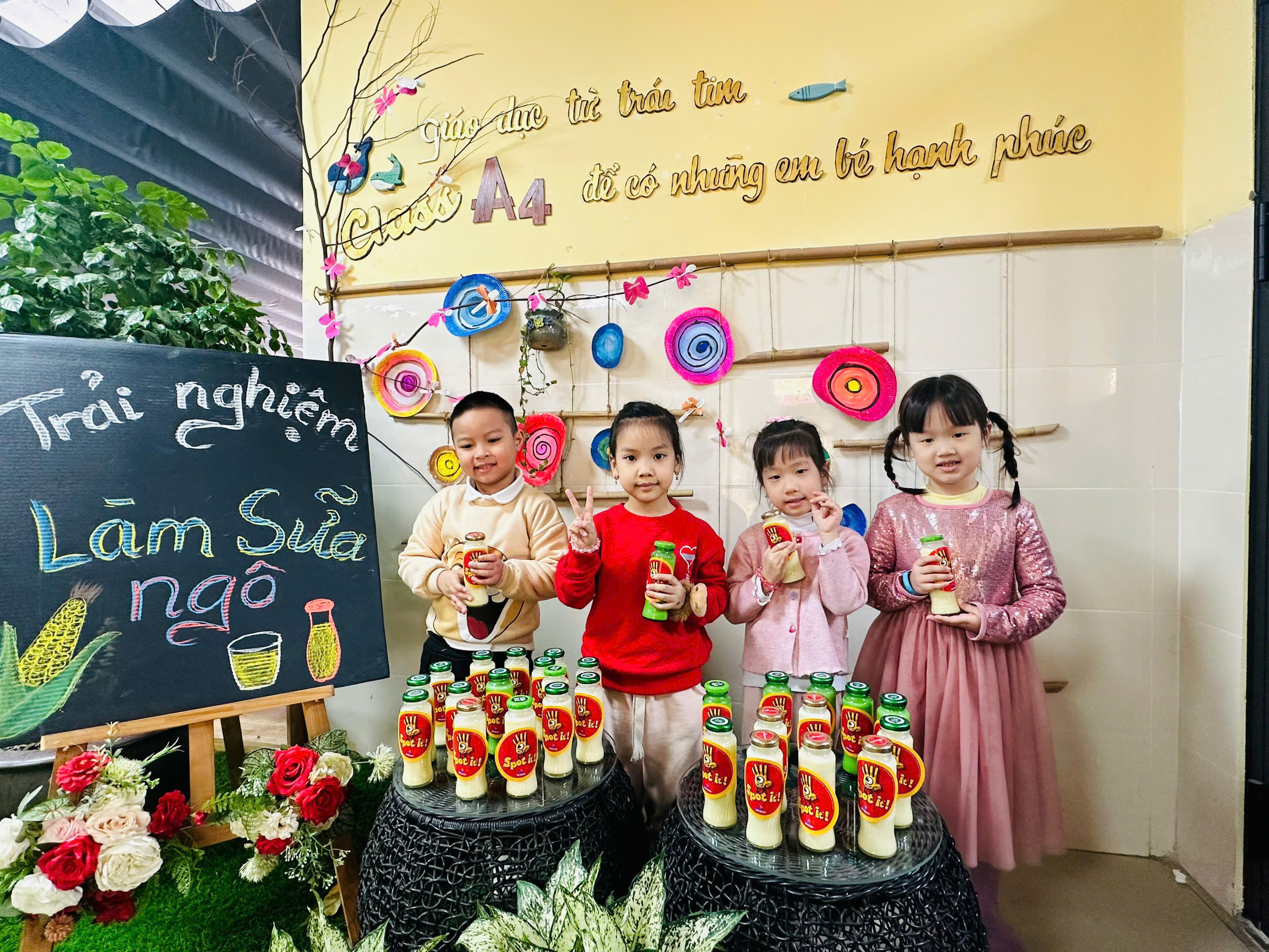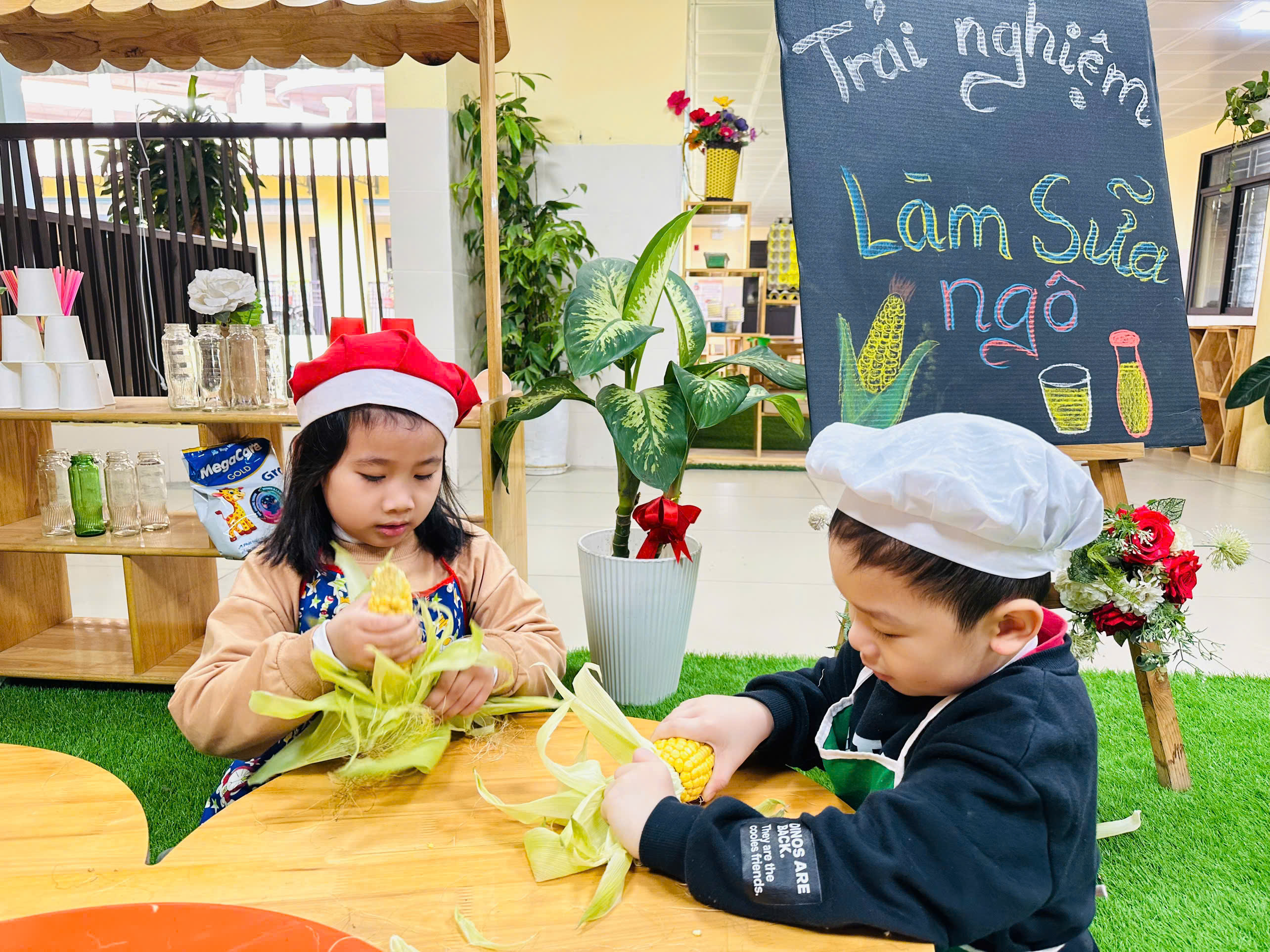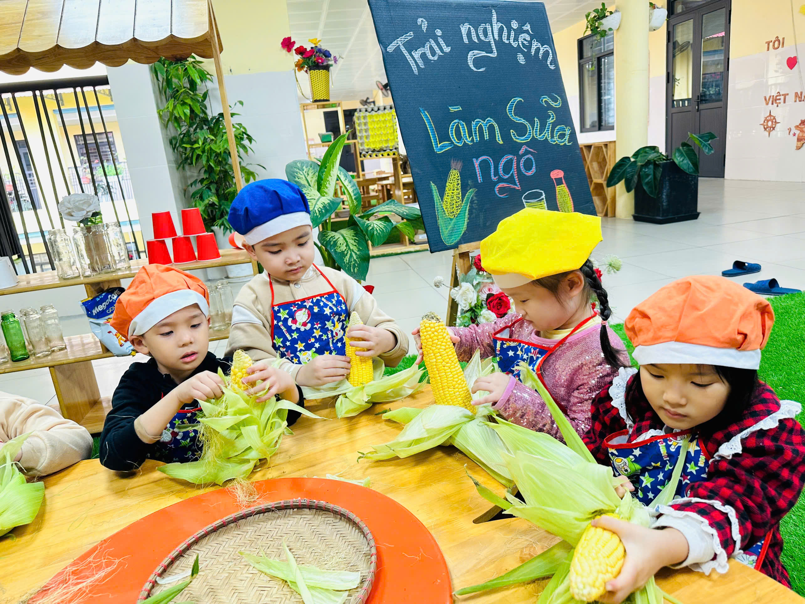 Sữa ngô là thức uống dinh dưỡng rất tốt cho sức khoẻ. Với những nguyên liệu rất gần gũi với trẻ như: Ngô ngọt, sữa tươi, sữa đặc, nước lọc, máy làm sữa hạt , cốc giấy. Các bé lớp mẫu giáo A4 được cô hướng dẫn và tự tay làm những cốc sữa ngô thơm ngon, béo ngậy. Những đôi mắt xinh chăm chú, háo hức cùng bàn tay khéo léo, các con cùng cô chuẩn bị nguyên liệu,rửa ngô, tách hạt ngô và cho các nguyên liệu vào máy làm sữa hạt để tạo nên những cốc sữa ngô thơm ngon nóng hổi và hào hứng thưởng thức thành quả do chính mình làm ra. Bố mẹ cùng nhìn lại các hình ảnh của các bé trong buổi trải nghiệm thú vị này nhé!