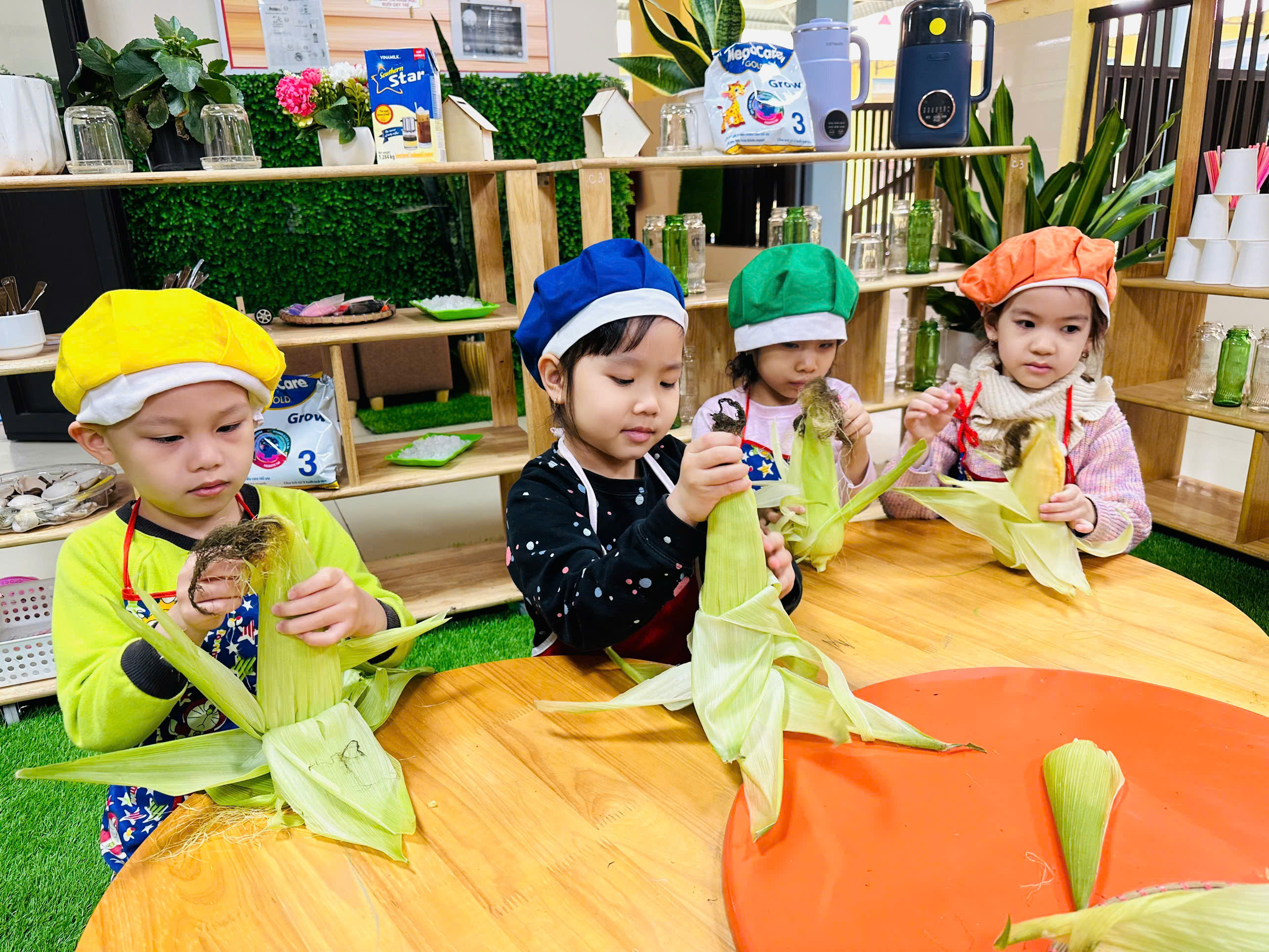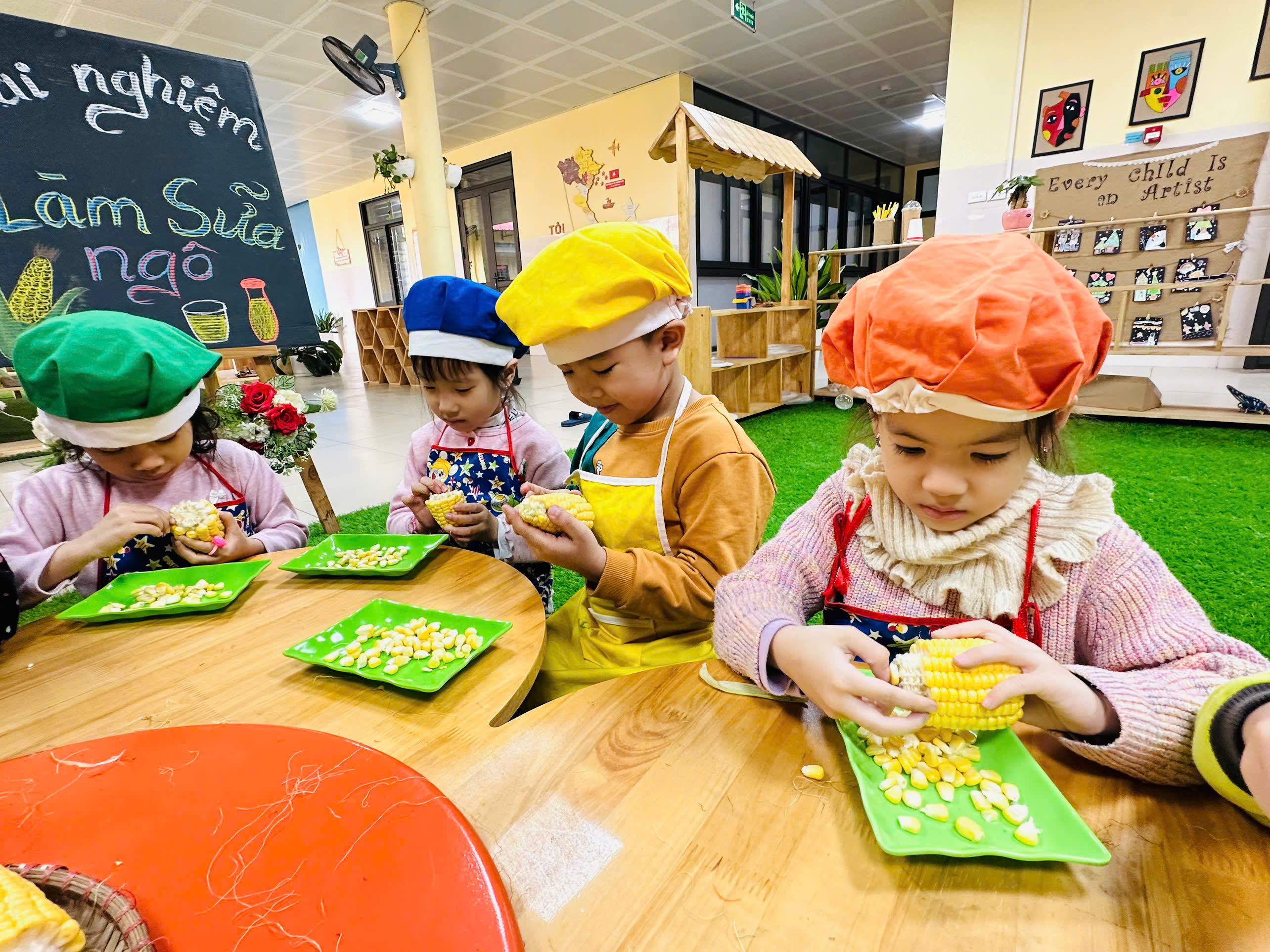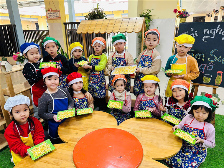 Trẻ được trải nghiệm quan sát và tách những hạt ngô