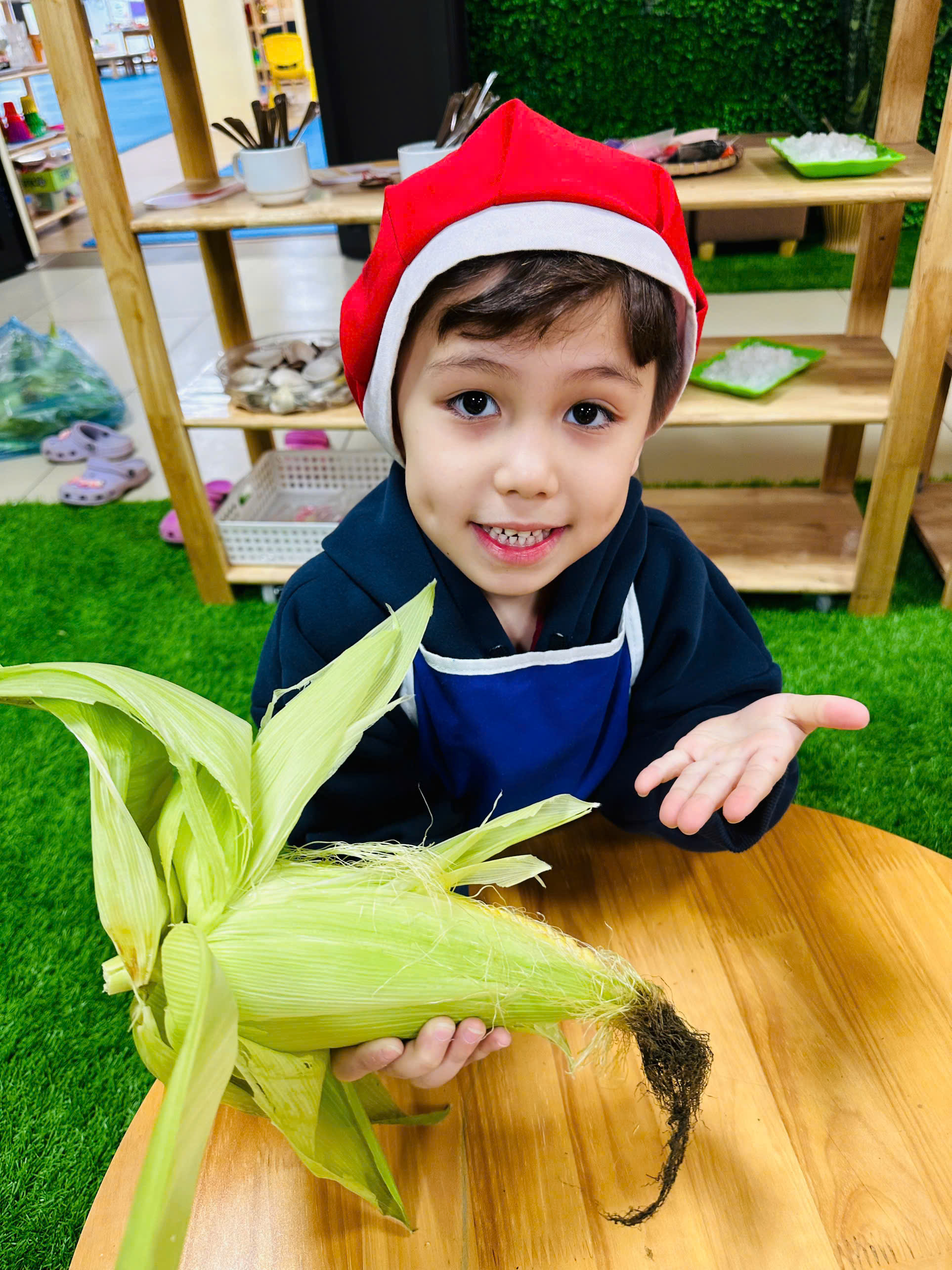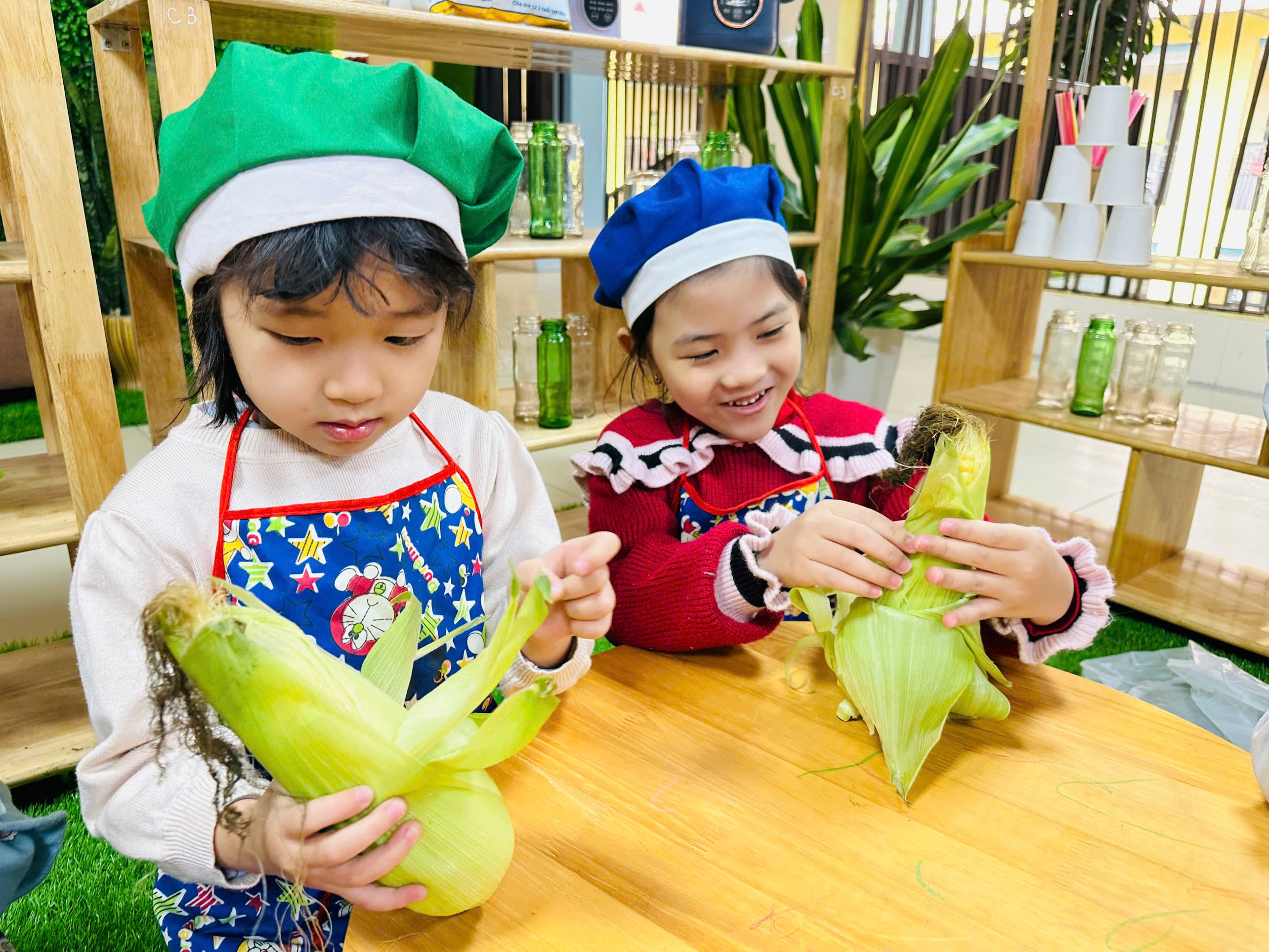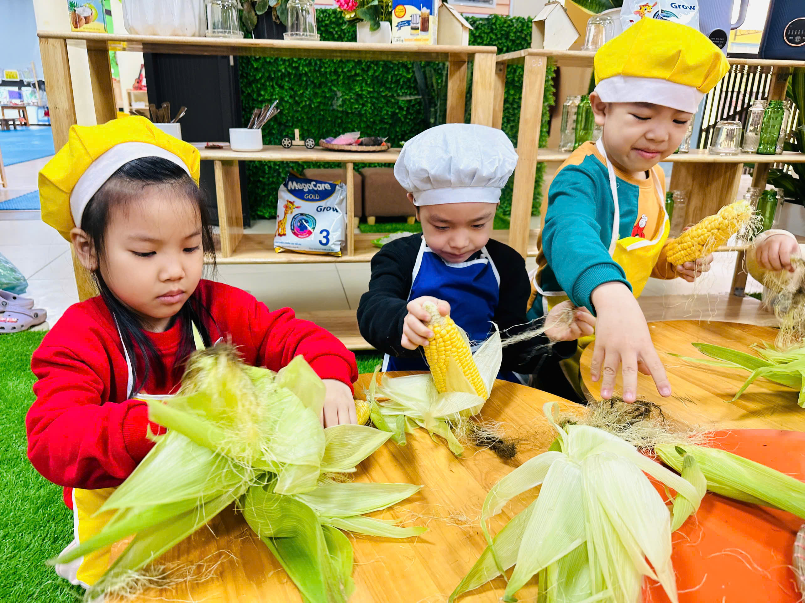 Trẻ được trải nghiệm quan sát và tách những hạt ngô