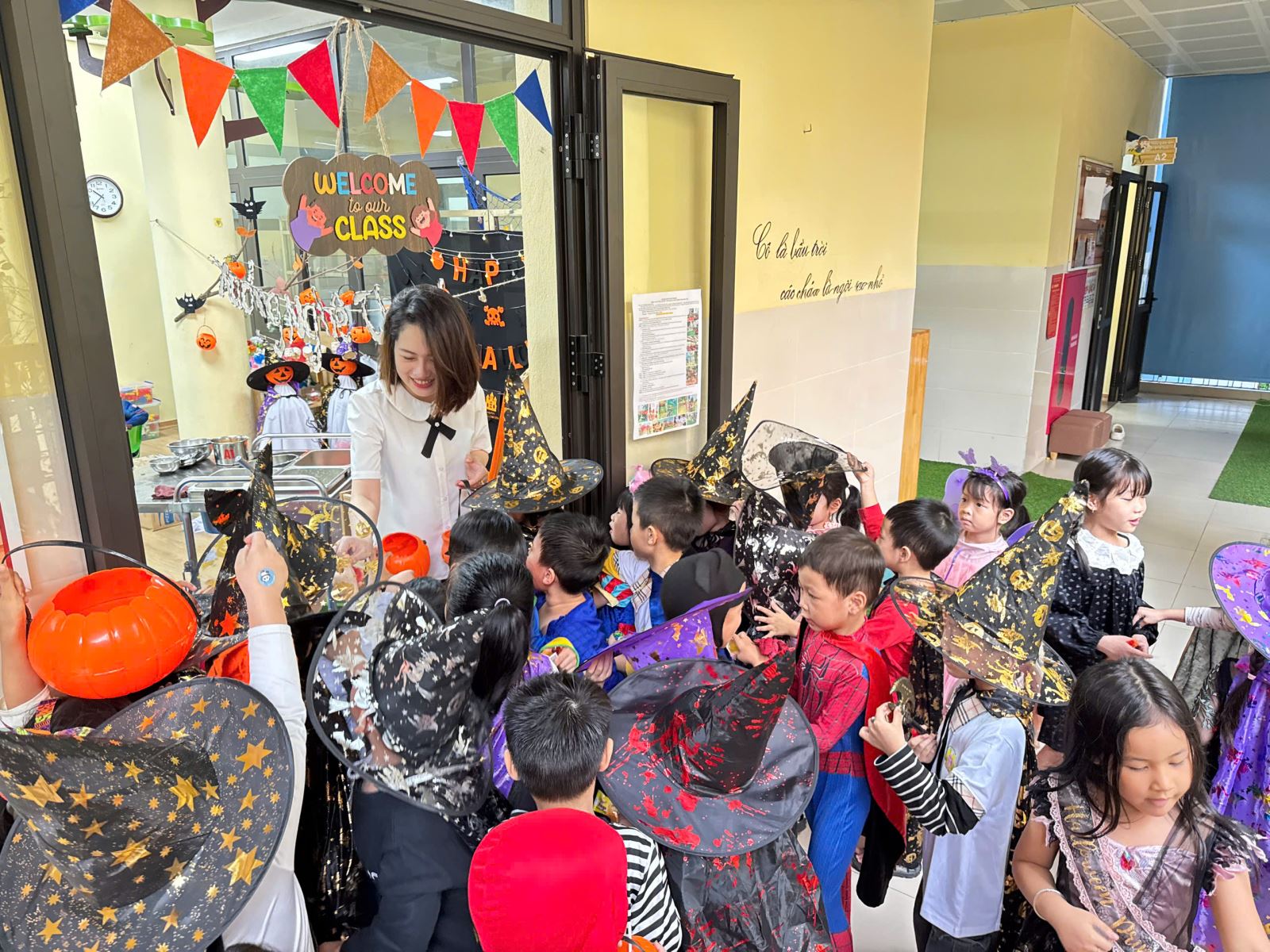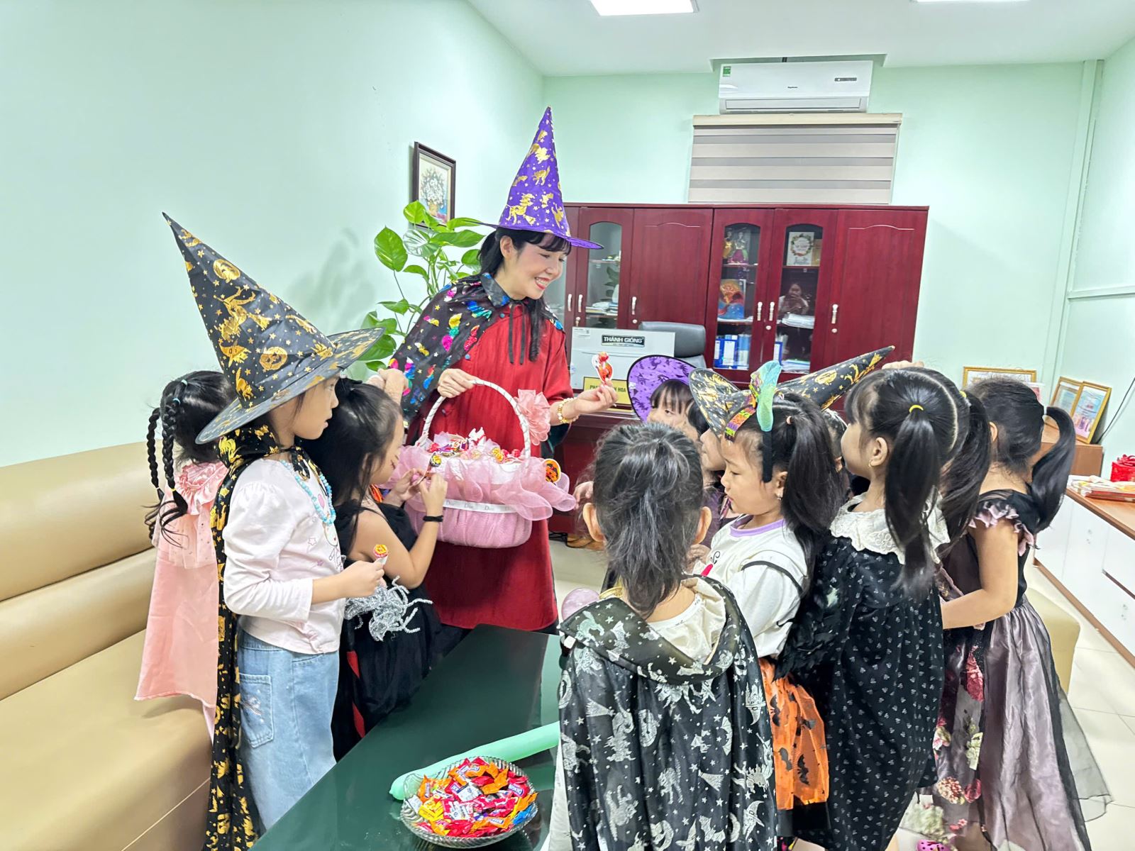 Các bạn nhỏ thích thú khi được bác hiệu trưởng Thanh Hoa tặng kẹo nhân ngày hội Halloween