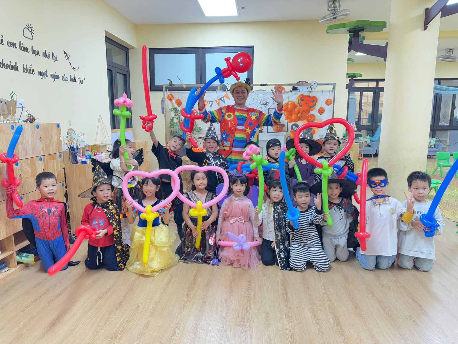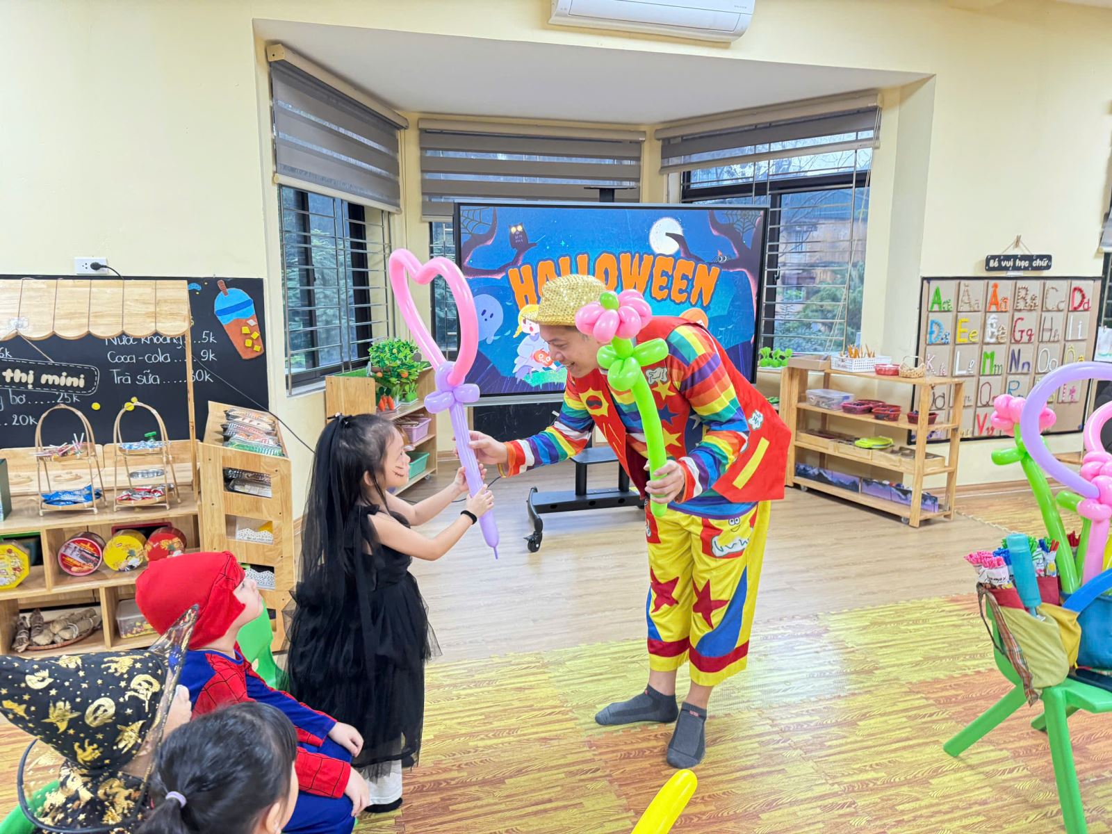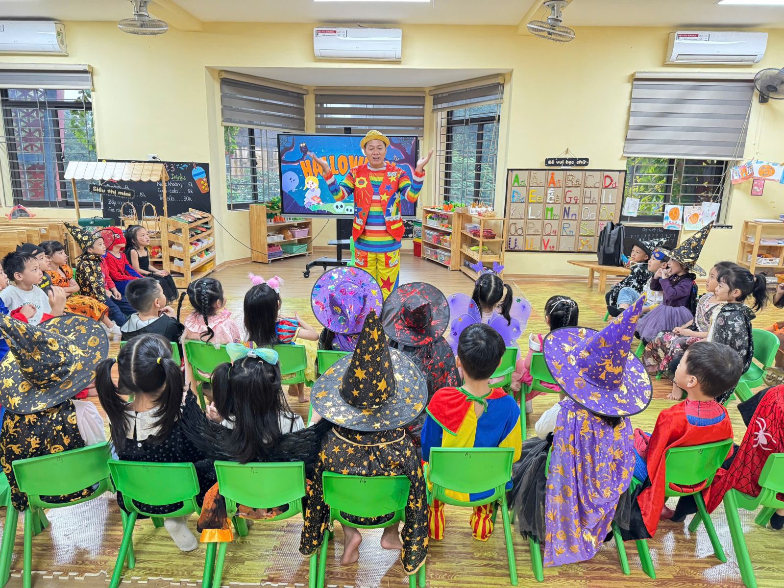 Trong không gian lớp học rực rỡ sắc màu, các con check-in thật đáng yêu, lưu giữ từng khoảnh khắc nhí nhảnh, ngộ nghĩnh và dễ thương. Các bạn nhỏ còn được đi xin kẹo ở phòng bác Hiệu trưởng, ghé thăm các lớp bạn và nhận về vô vàn những phần quà ngọt ngào với nhiều tiếng cười, niềm vui sướng 🍭🍬. Không khí càng thêm sôi động khi các con giao lưu cùng chú hề vui nhộn, tham gia những trò chơi đầy bất ngờ 🎈.