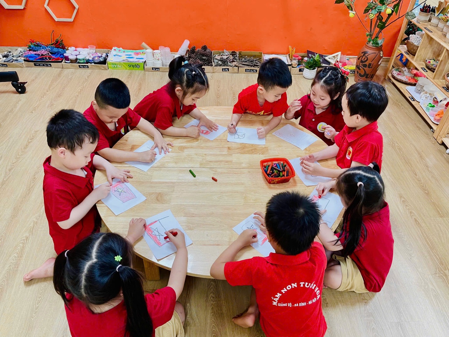 Các bé tham gia hoạt động vẽ theo chủ đề chào mừng ngày Giải phóng miền Nam 30/4