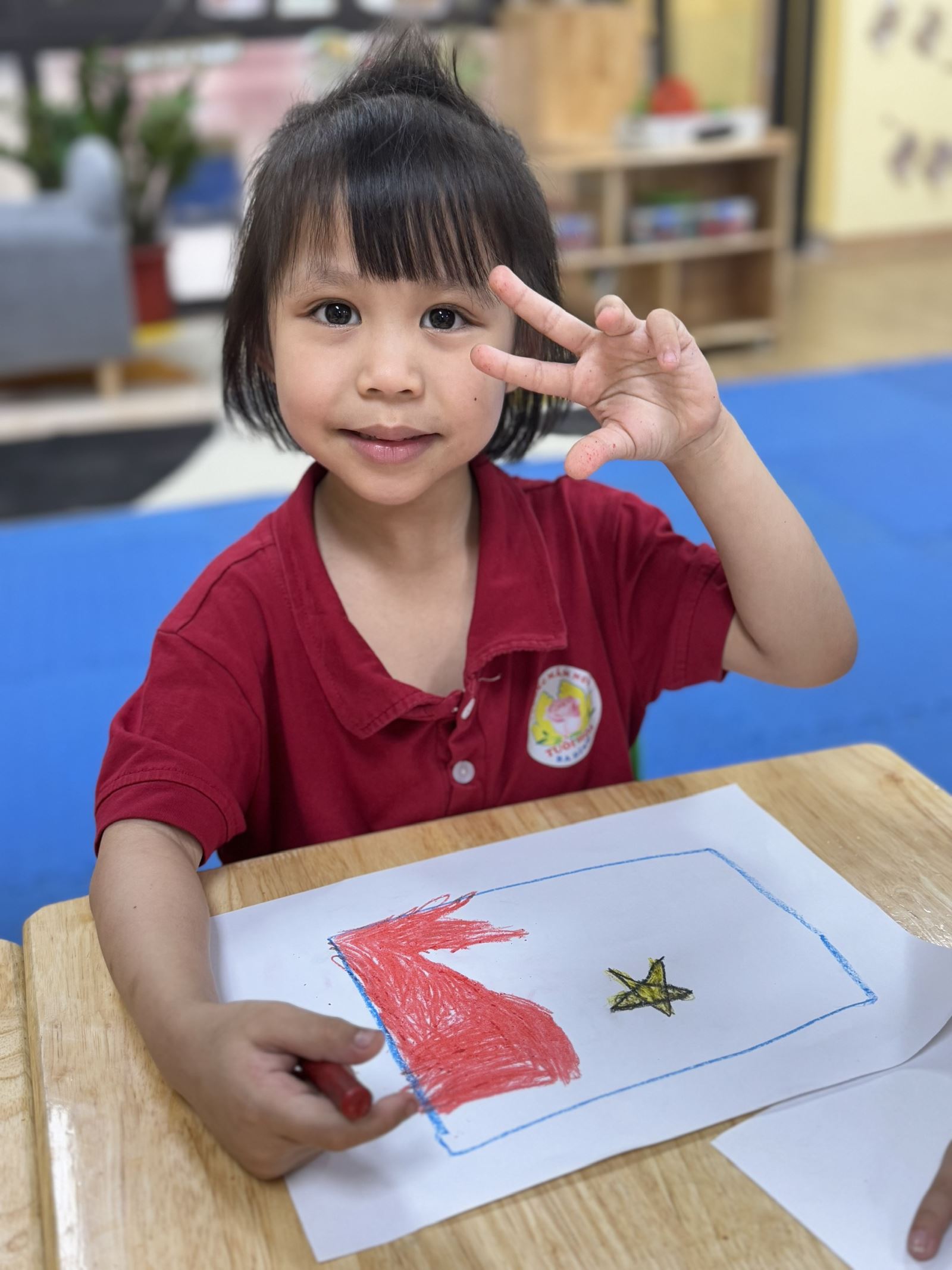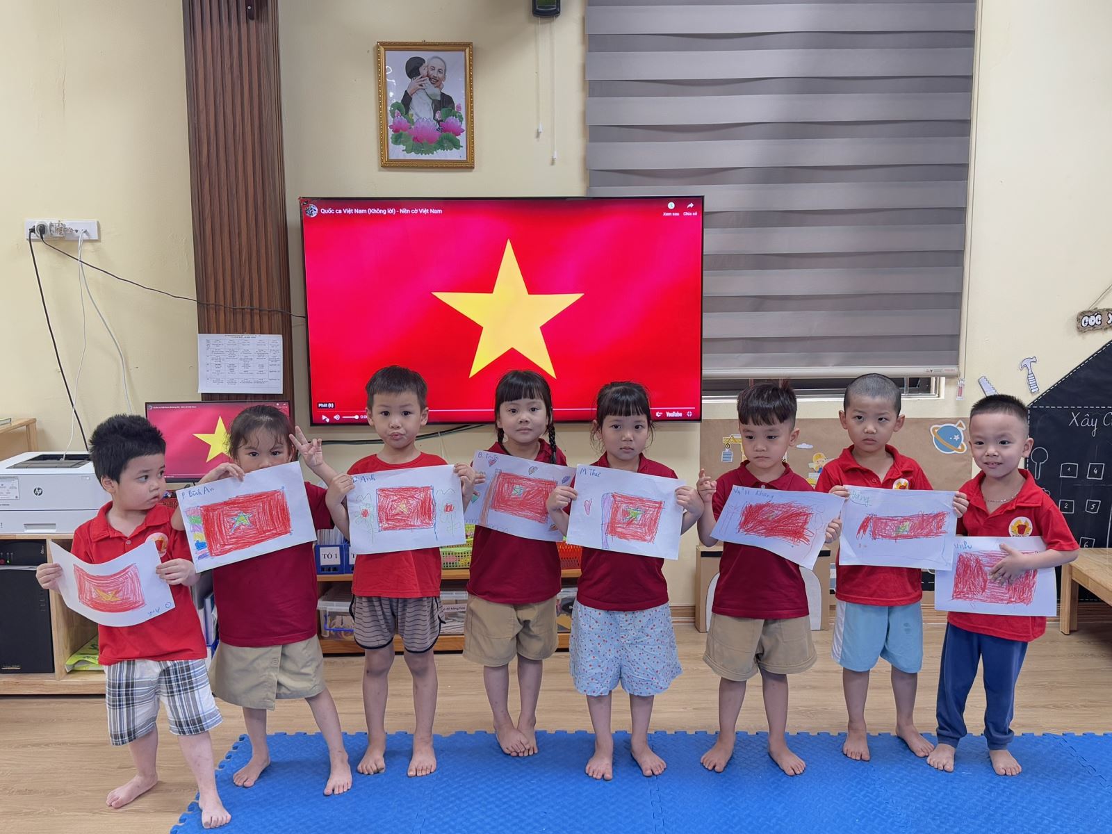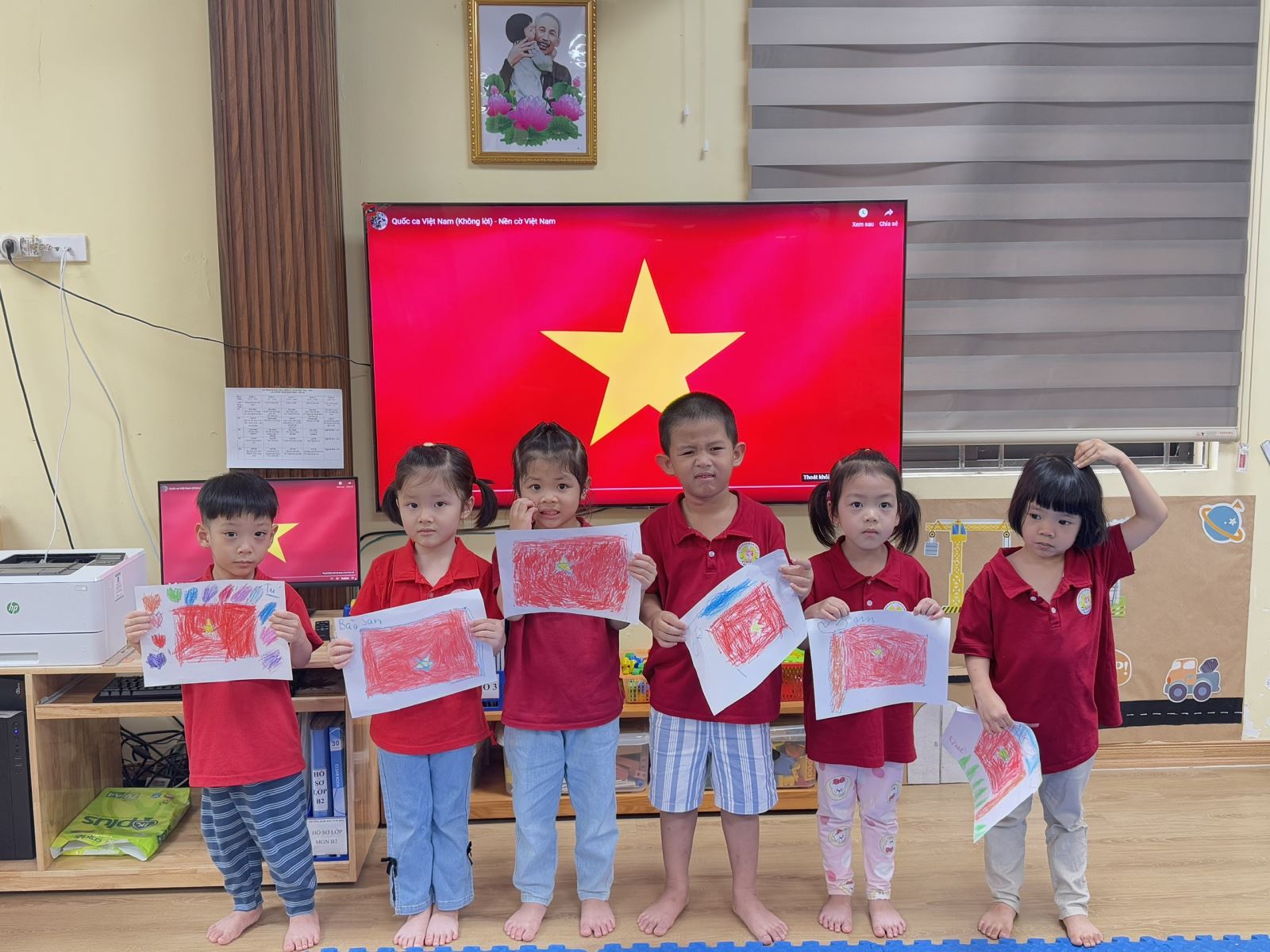 Hôm nay cô cháu mình hãy cùng nhau vẽ những bức tranh thật đẹp về lá cờ, về những bông hoa tươi thắm, về những nụ cười rạng rỡ và đây cũng là cách chúng mình cùng nhau chúc mừng 50 năm ngày vui của đất nước Việt Nam!