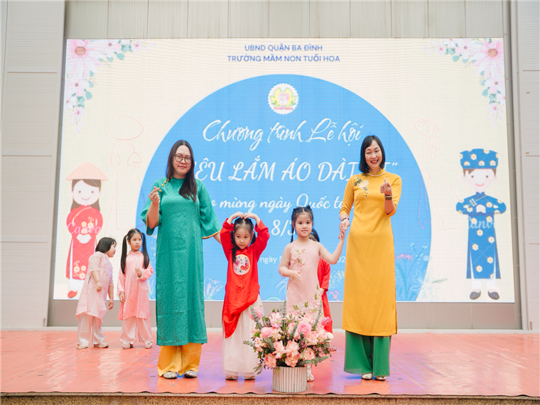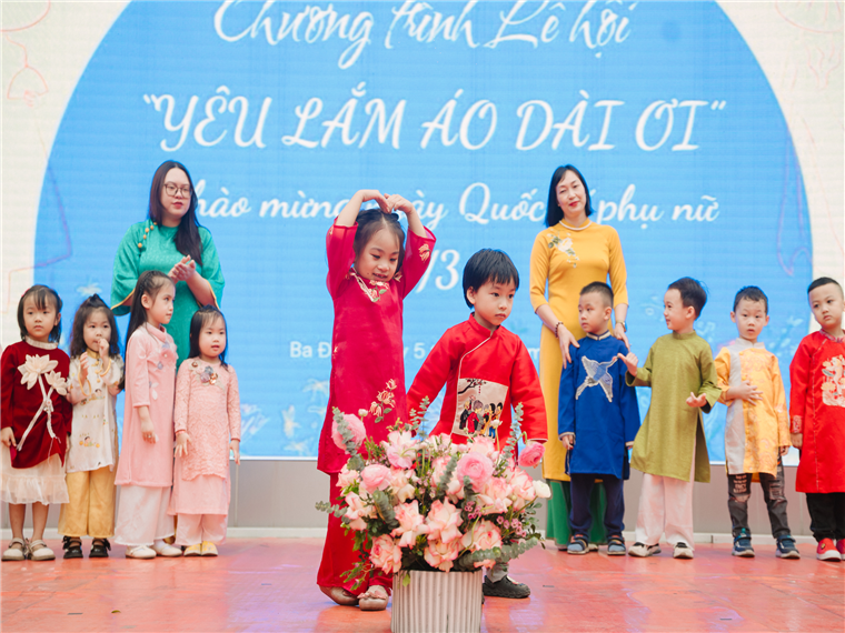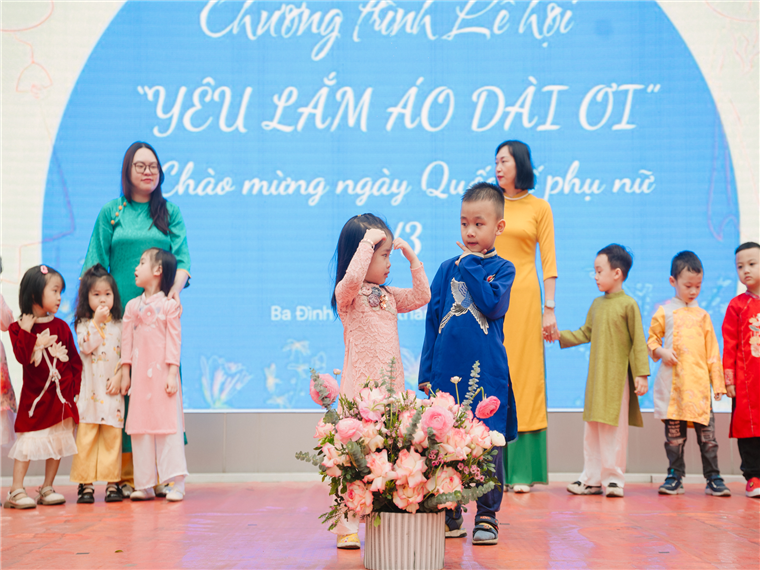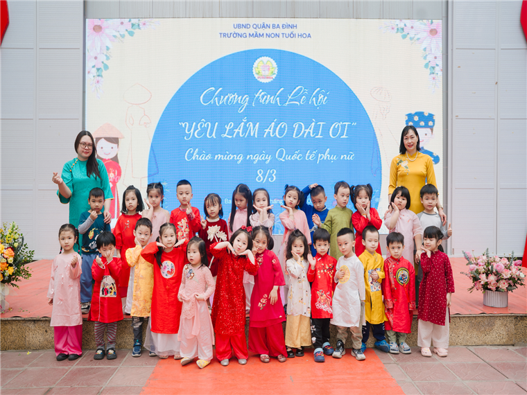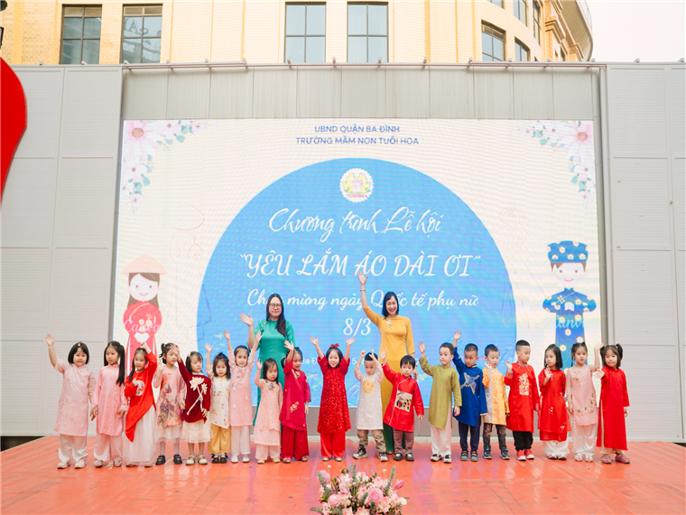 Hôm nay, các bé lớp MGN B1 đã tham gia chương trình lễ hội “Yêu lắm áo dài ơi” và hưởng ứng tuần lễ áo dài nhân dịp chào mừng ngày Quốc tế phụ nữ 8/3. Các bé rất vui vẻ và hào hứng được mặc những bộ áo dài rực rỡ nhiều màu sắc, cùng nhau nhảy flashmob bài hát “Việt Nam ơi” và đặc biệt các con được thưởng thức những màn trình diễn áo dài đặc sắc đến từ các khối mẫu giáo và các cô giáo trường Mầm non Tuổi Hoa.