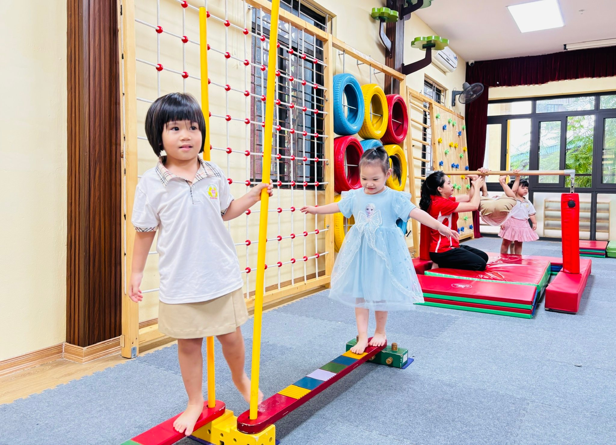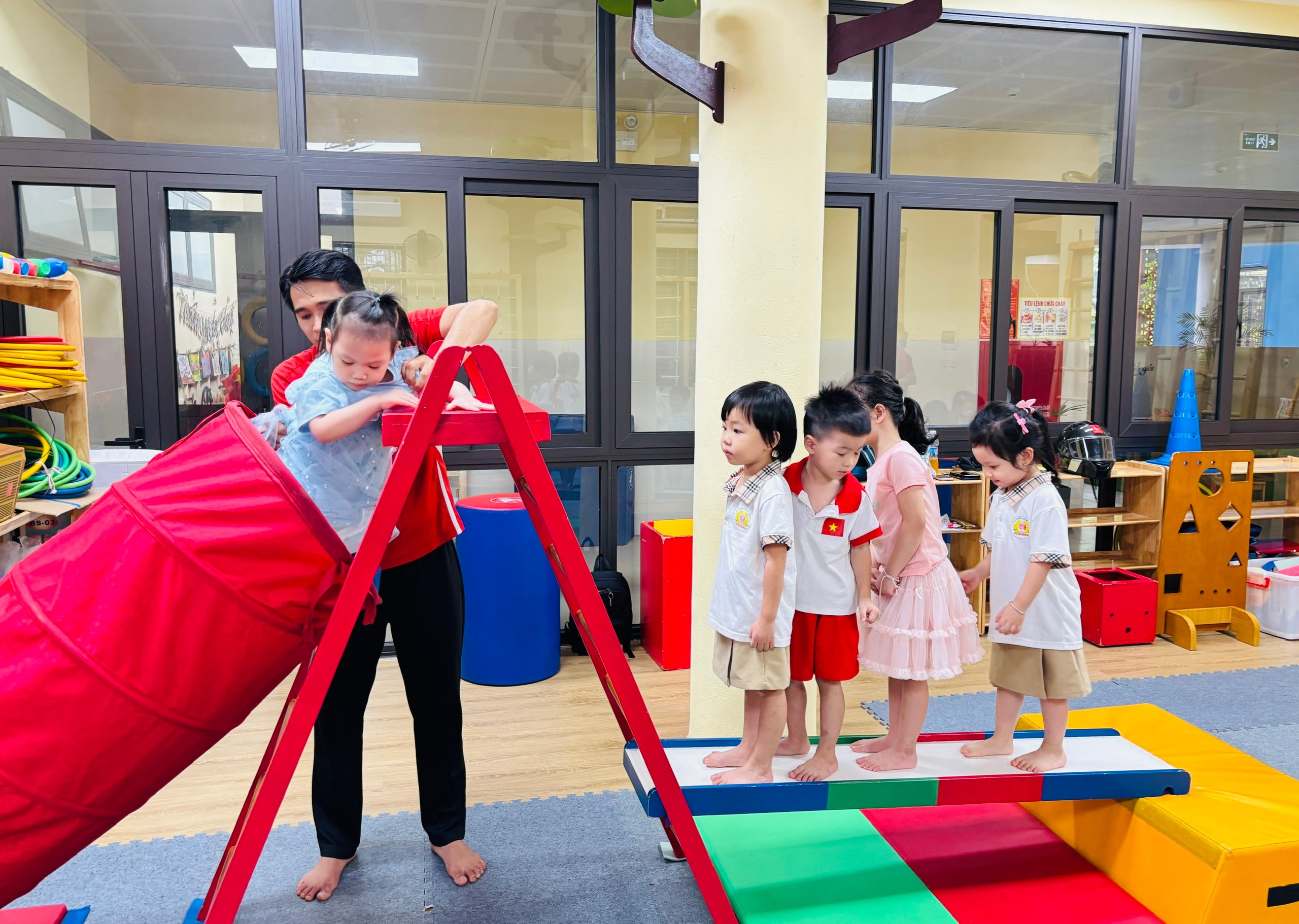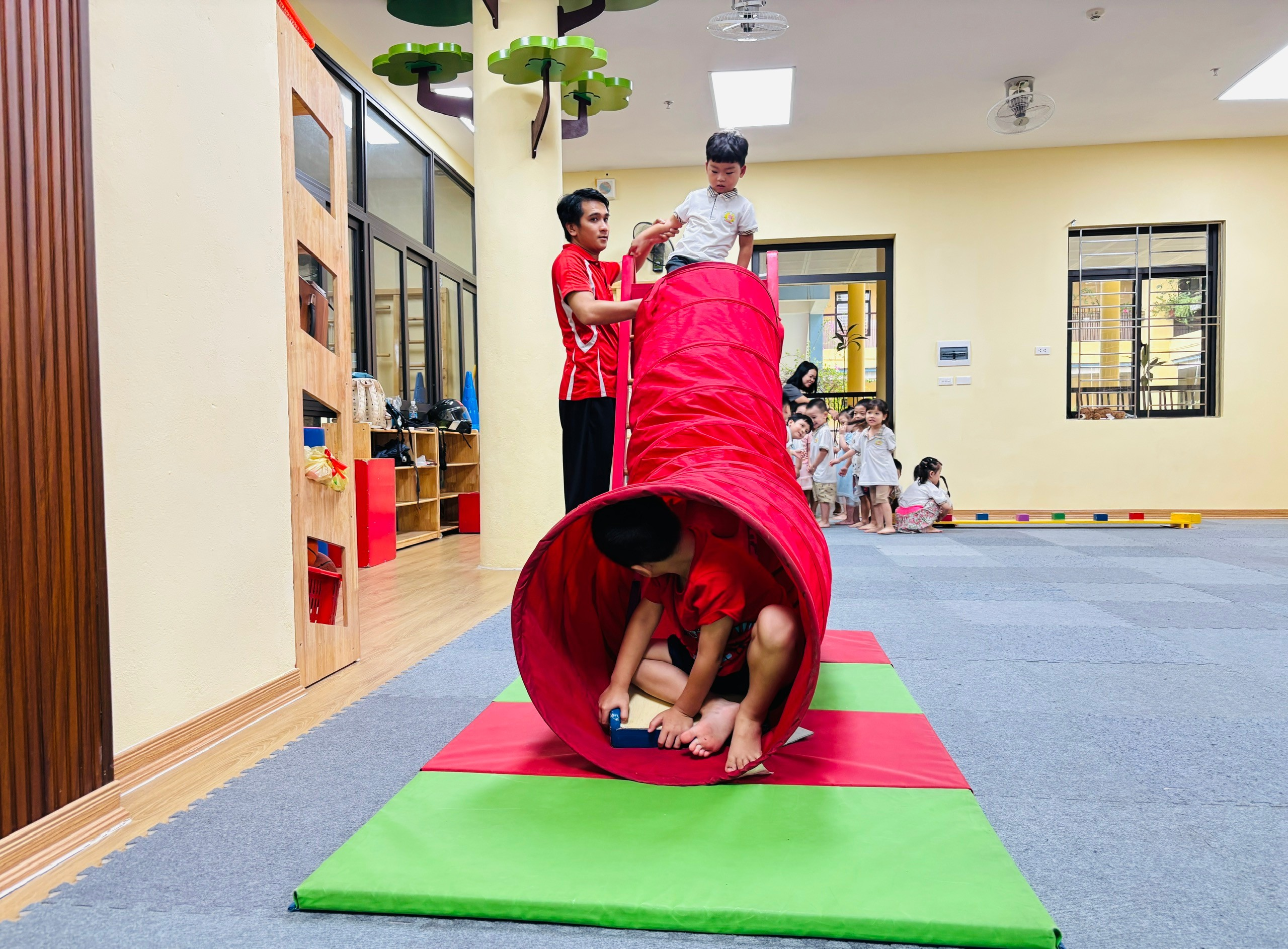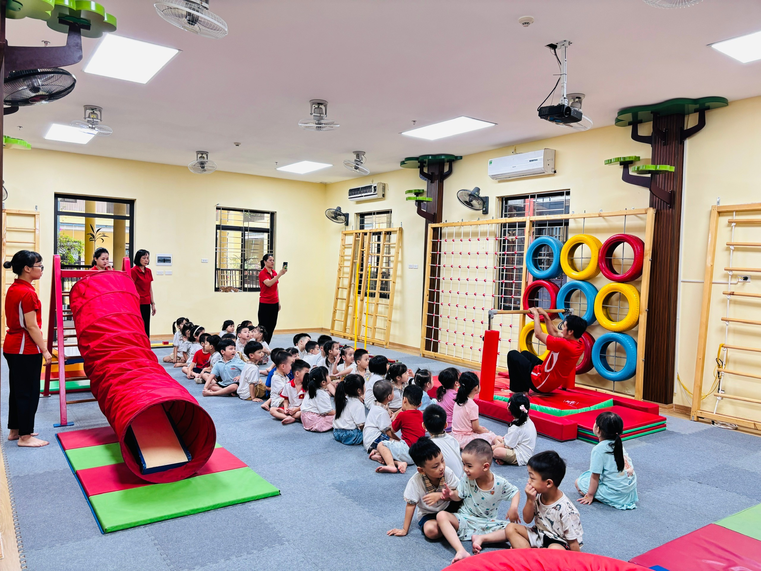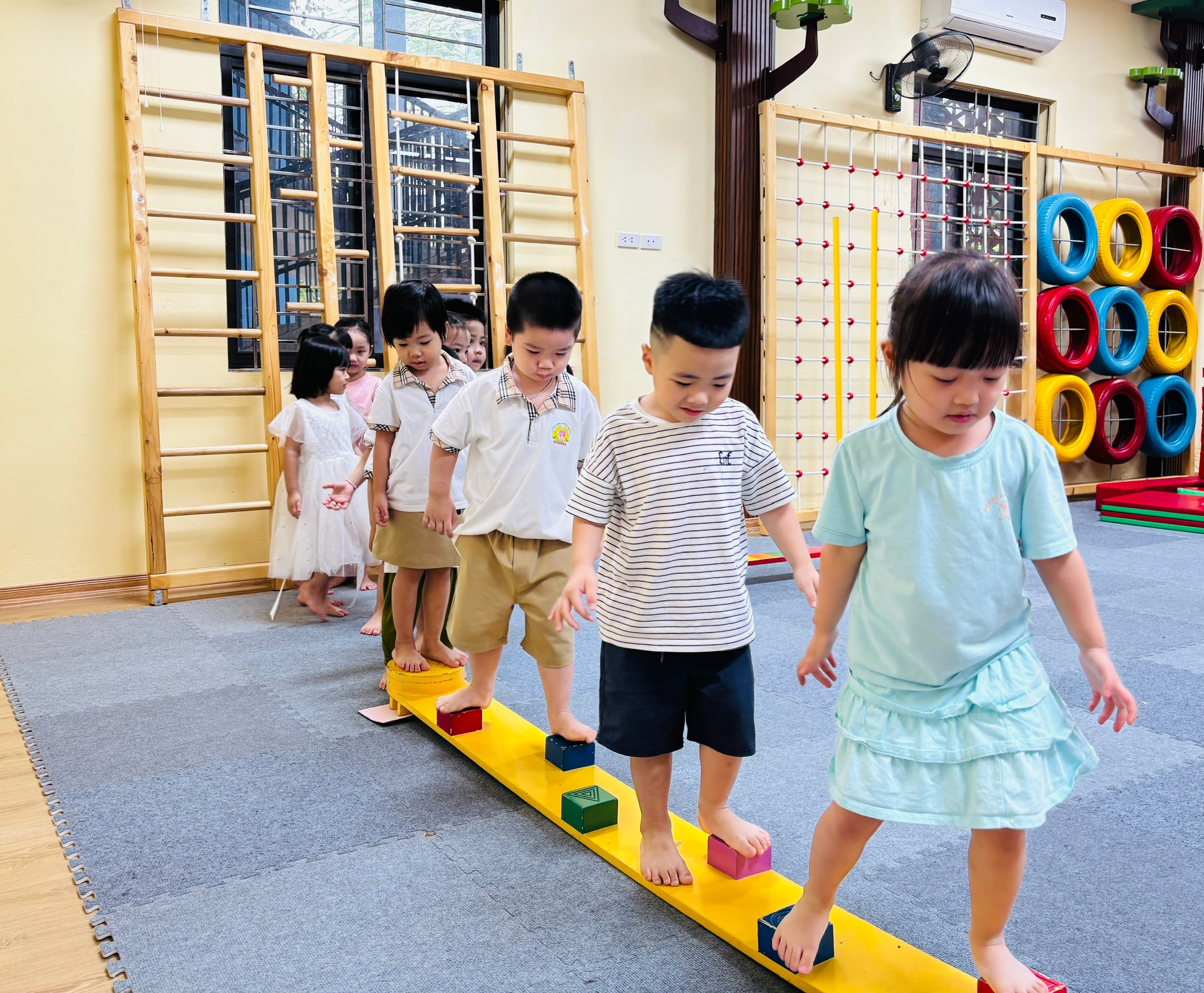 💪 Với các bài tập vận động như bật nhảy, giữ thăng bằng, bò chui… được thiết kế phù hợp với thể trạng lứa tuổi, các con không chỉ rèn luyện sự nhanh nhẹn, dẻo dai mà còn phát triển khả năng phối hợp và phản xạ.