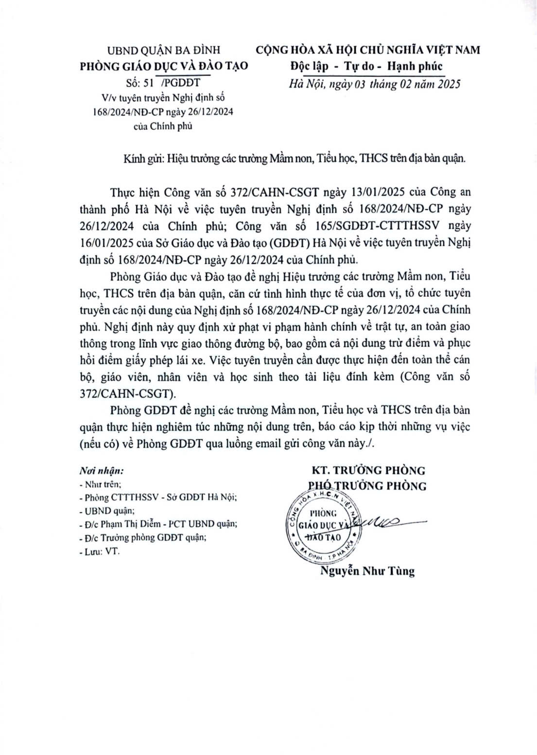 Thực hiện công văn số 372/CAHN-CSGT của công an thành phố Hà Nội về tuyên truyền nghị định số 168/2024/NĐ-CP của chính phủ, Công văn số 165/SGDĐT-CTTHSSV của sở Giáo dục và Đào tạo Hà nội về Việc tuyên truyền nghị định số168/2024/NĐ-CP của chính phủ.