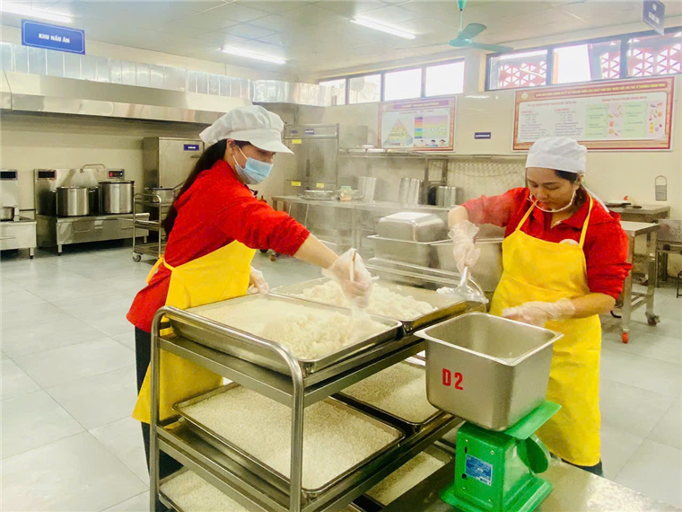 Hình ảnh: Nhân viên nuôi dưỡng đang chia ăn cho CBGV_NV