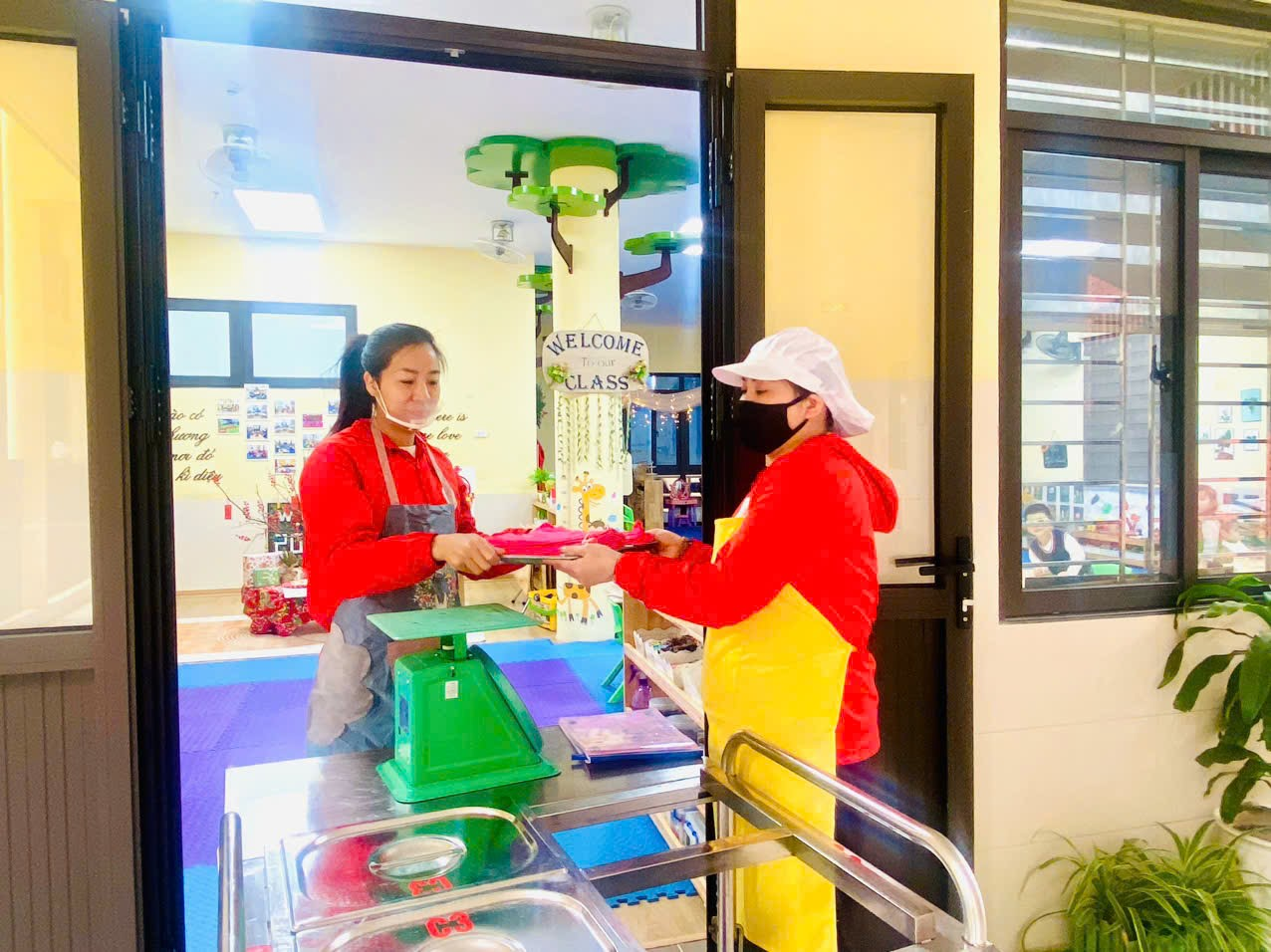 Hình ảnh: Giáo viên ký nhận thực phẩm đủ định lượng khi nhân viên nuôi dưỡng đưa xuống lớp.