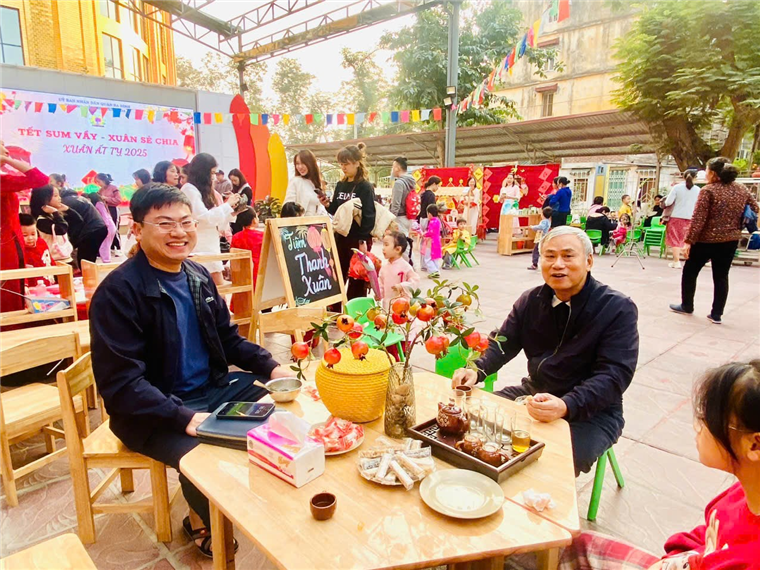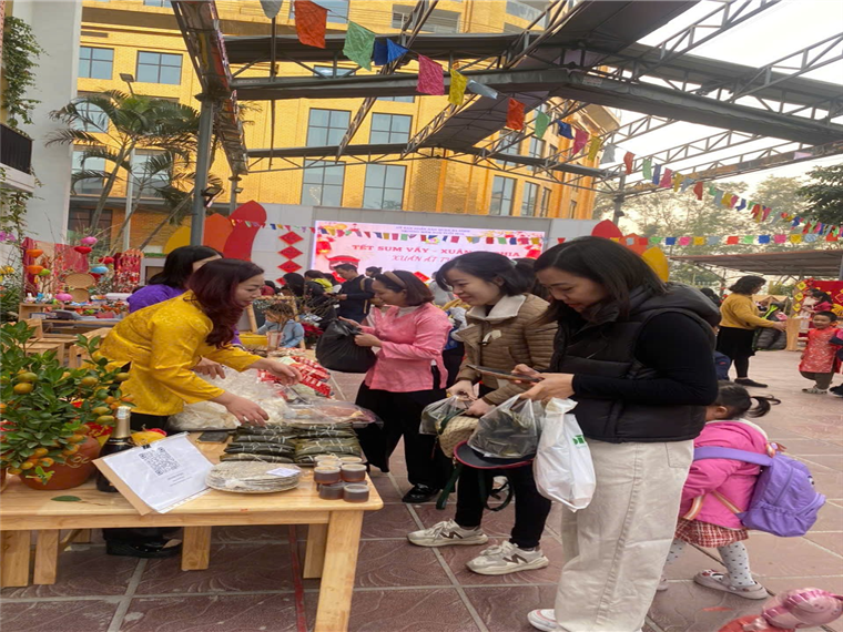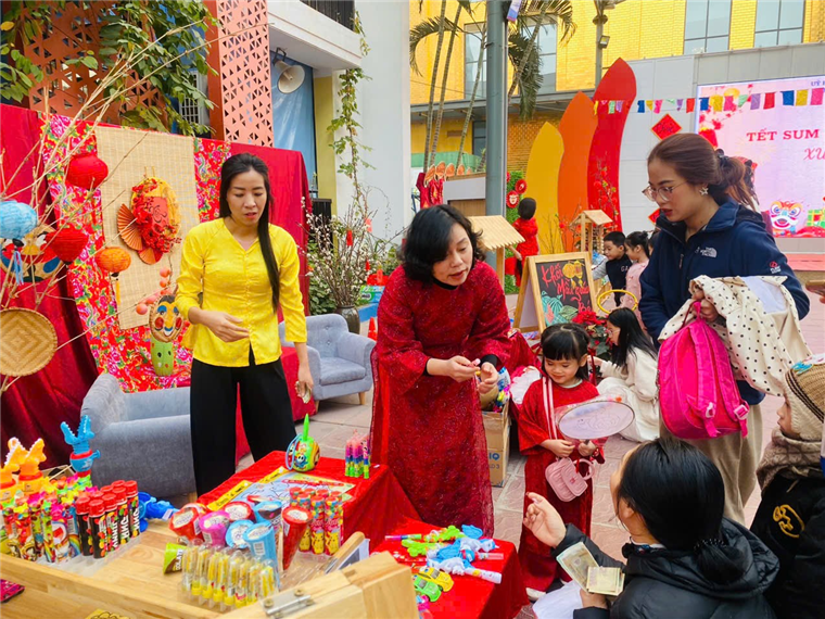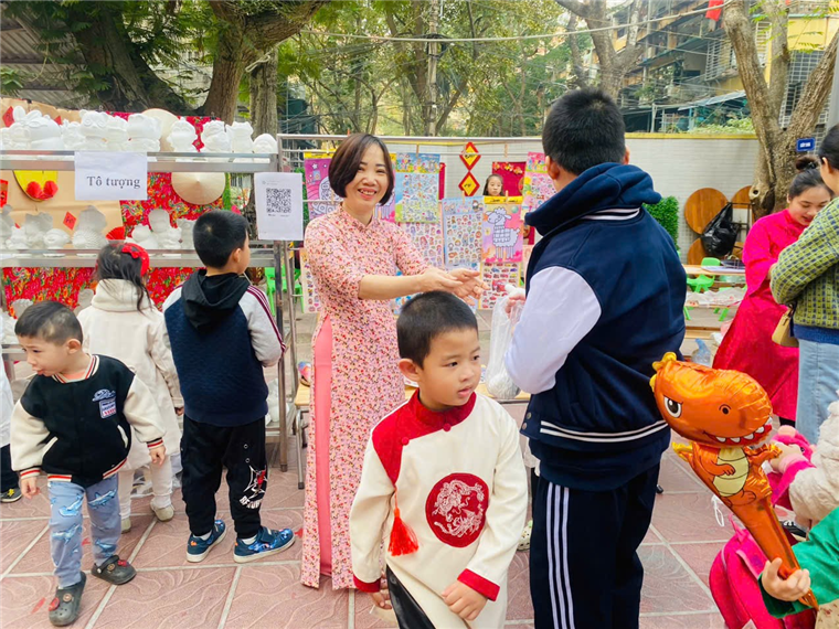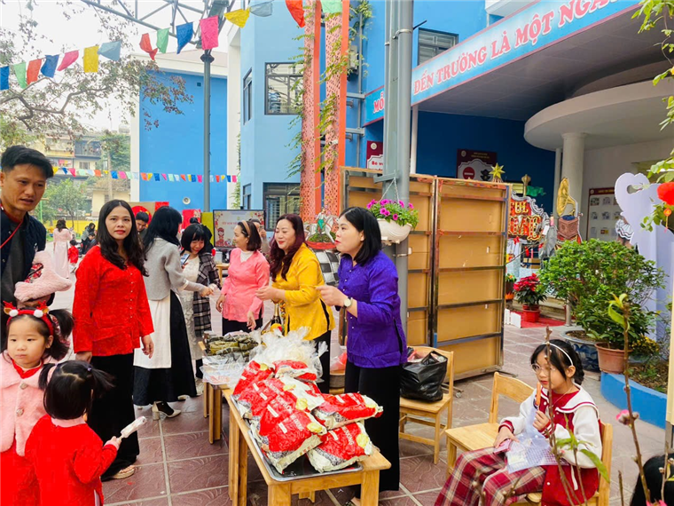 "Hội chợ Xuân" là một trong những hoạt động giáo dục, trải nghiệm nhằm giúp trẻ mở rộng vốn hiểu biết về thế giới xung quanh, hình thành cho trẻ kỹ năng giao tiếp, góp phần giúp trẻ phát triển toàn diện. Tham gia Hội chợ các bé được trải nghiệm hoạt động mua - bán hàng, biểu diễn văn nghệ trong ngày Tết. Không gian các gian hàng truyền thống và hiện đại đã được tái hiện một cách sinh động. Mỗi gian hàng đều mang những nét đặc trưng riêng với những cái tên mang đậm màu sắc mùa xuân. Bên cạnh đó là sự xuất hiện của những bộ áo dài rực rỡ trong không gian chợ Xuân càng tô điểm thêm nét đẹp truyền thống của phiên chợ và giúp các bé cảm nhận sâu sắc ý nghĩa của ngày Tết cổ truyền.