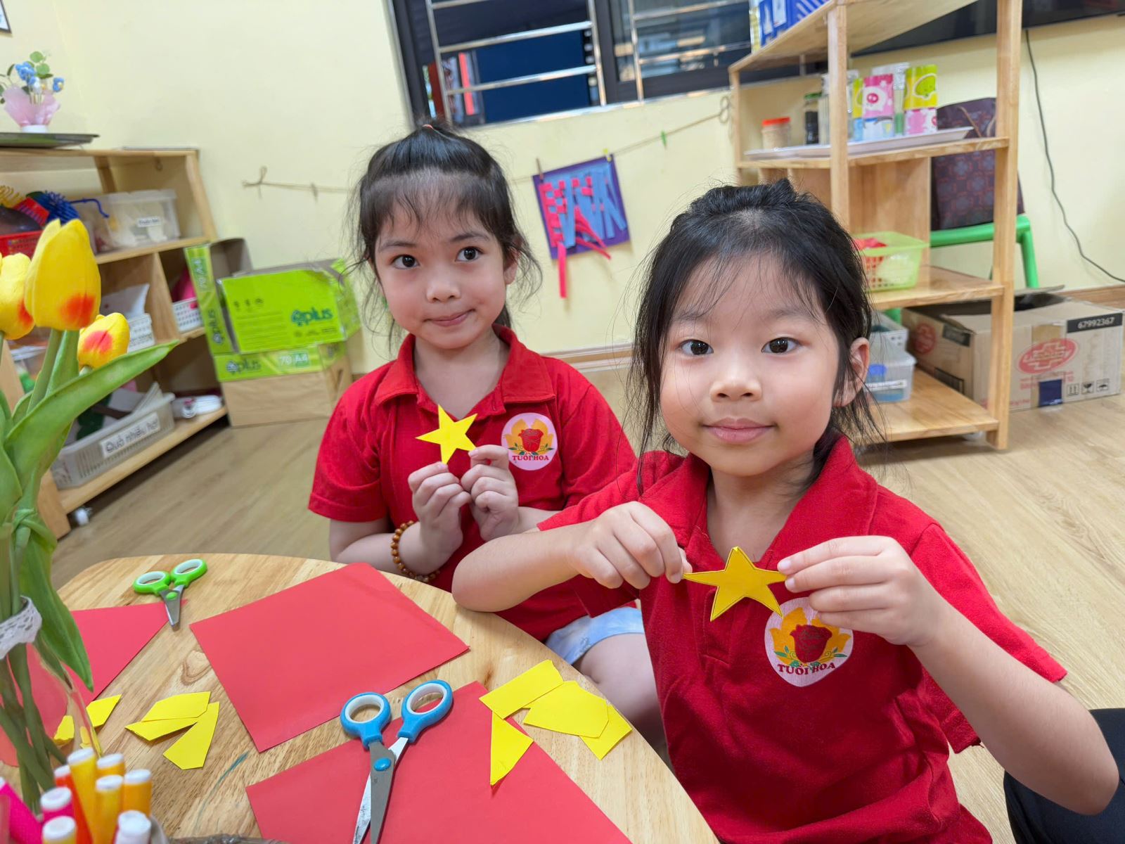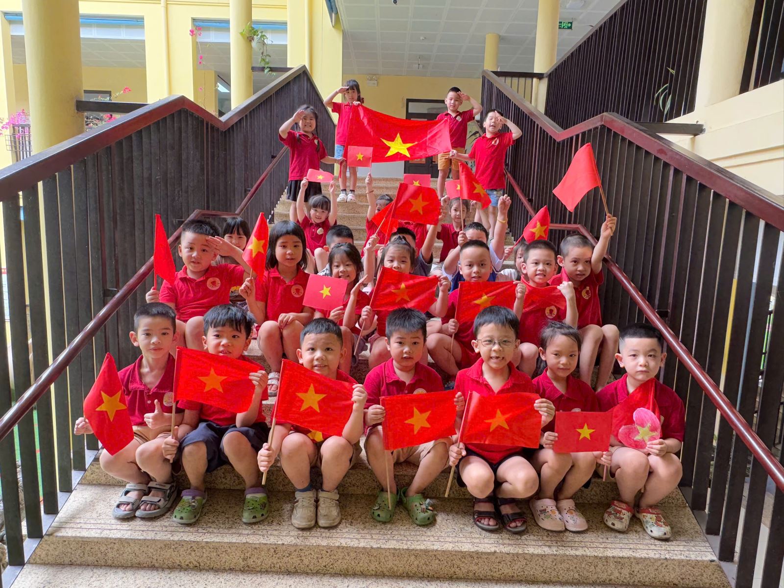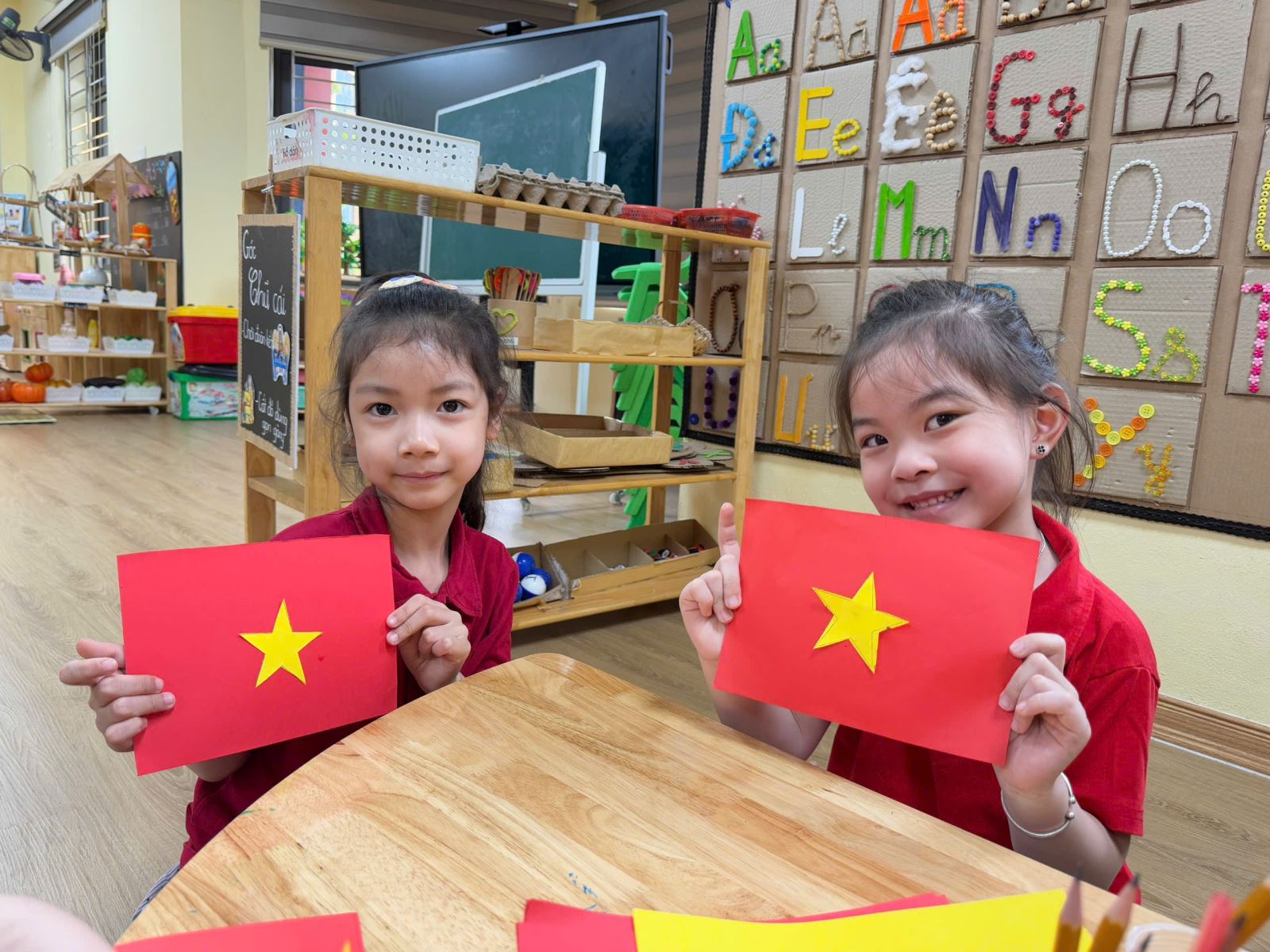 Chỉ bằng những nguyên vật liệu đơn giản như giấy màu, keo dán các con đã tạo ra lá cờ xinh xắn. Các con rất tỉ mỉ, chăm chút cắt dán từng chút một để có thể dán thành lá cờ Tổ quốc yêu thương và rạng rỡ cười thật vui khi hoàn thành sản phẩm của mình. Thông qua hoạt động này giáo dục cho các con biết được ý nghĩa của chiếc Lá cờ đỏ sao vàng là Quốc kỳ - biểu tưởng của dân tộc Việt Nam, là niềm tự hào của mỗi người dân Việt Nam đồng thời gieo vào lòng các con niềm tự hào dân tộc, tình yêu quê hương và lòng biết ơn các thế hệ cha ông đã hy sinh vì độc lập, tự do của Dân tộc.