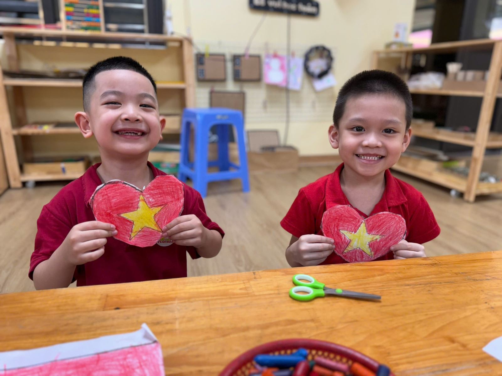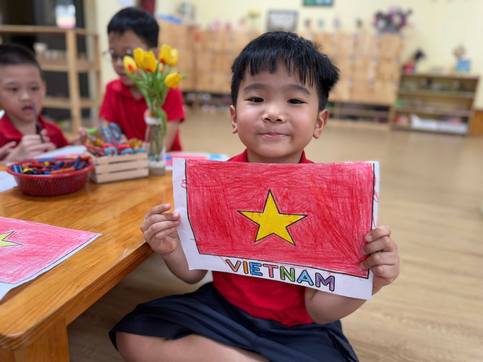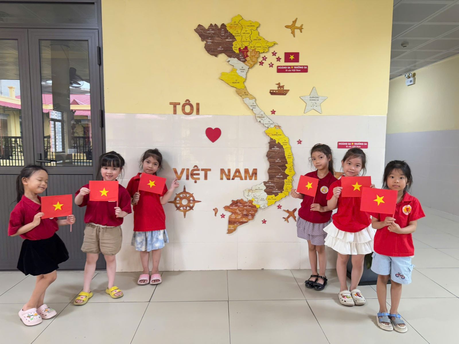 Chỉ bằng những nguyên vật liệu đơn giản như giấy màu, keo dán các con đã tạo ra lá cờ xinh xắn. Các con rất tỉ mỉ, chăm chút cắt dán từng chút một để có thể dán thành lá cờ Tổ quốc yêu thương và rạng rỡ cười thật vui khi hoàn thành sản phẩm của mình. Thông qua hoạt động này giáo dục cho các con biết được ý nghĩa của chiếc Lá cờ đỏ sao vàng là Quốc kỳ - biểu tưởng của dân tộc Việt Nam, là niềm tự hào của mỗi người dân Việt Nam đồng thời gieo vào lòng các con niềm tự hào dân tộc, tình yêu quê hương và lòng biết ơn các thế hệ cha ông đã hy sinh vì độc lập, tự do của Dân tộc.